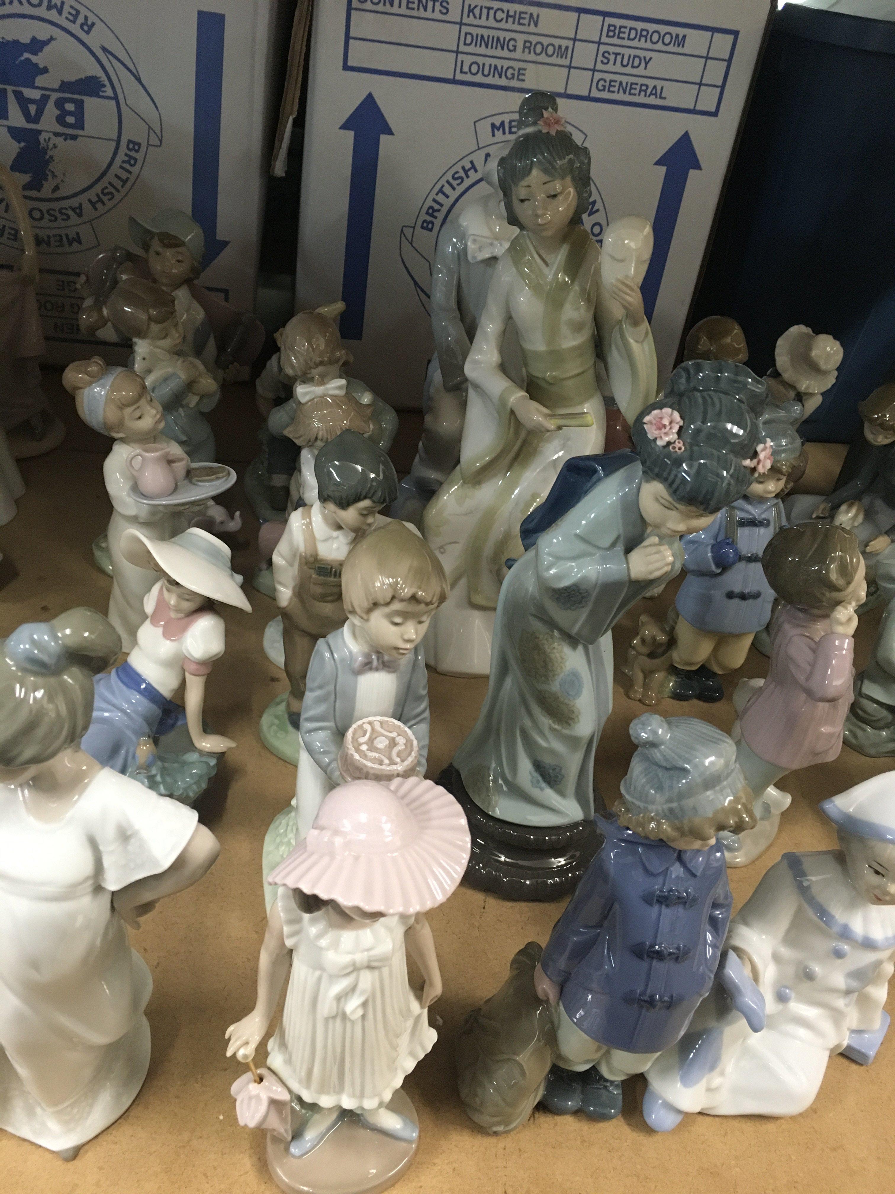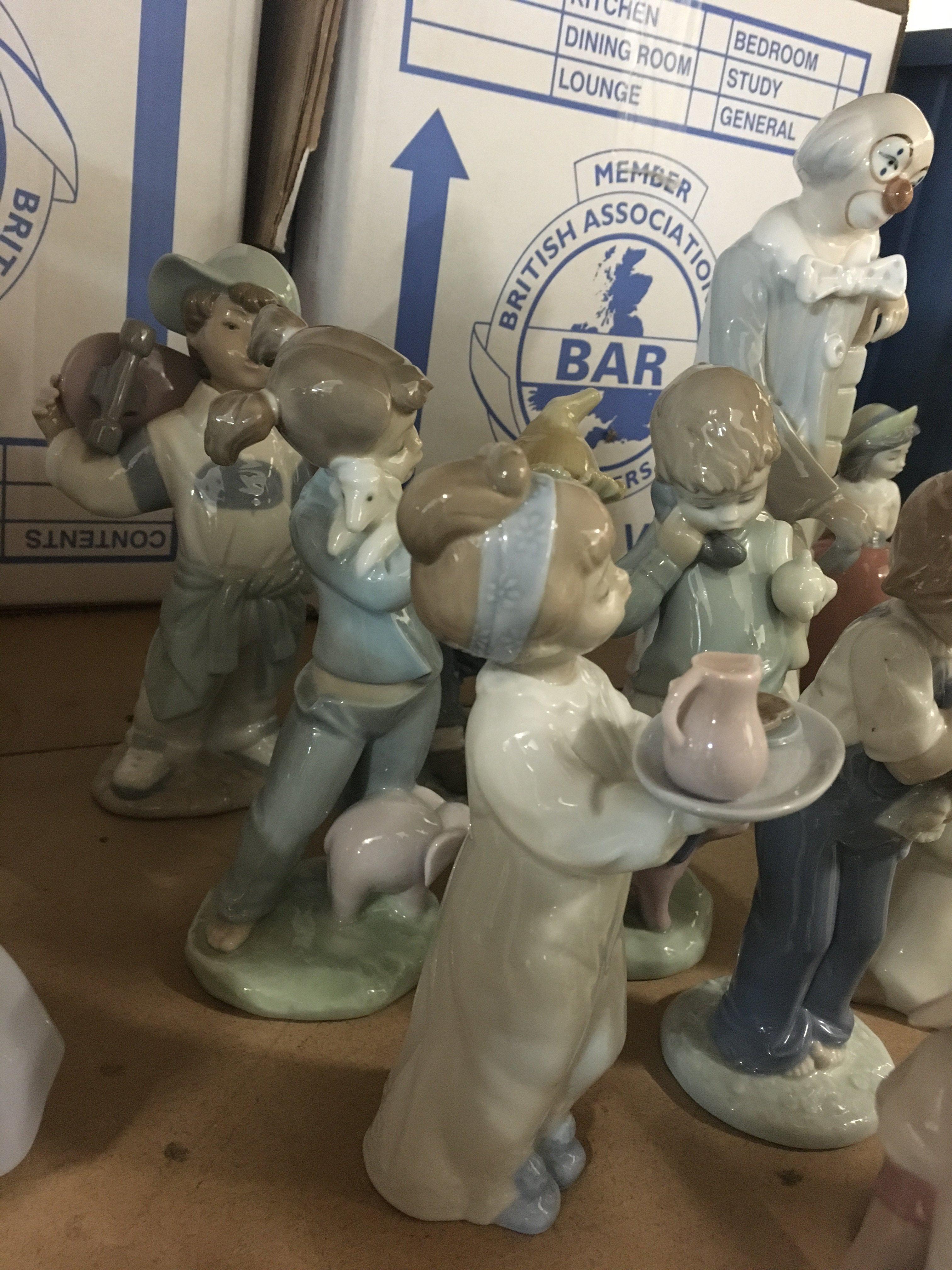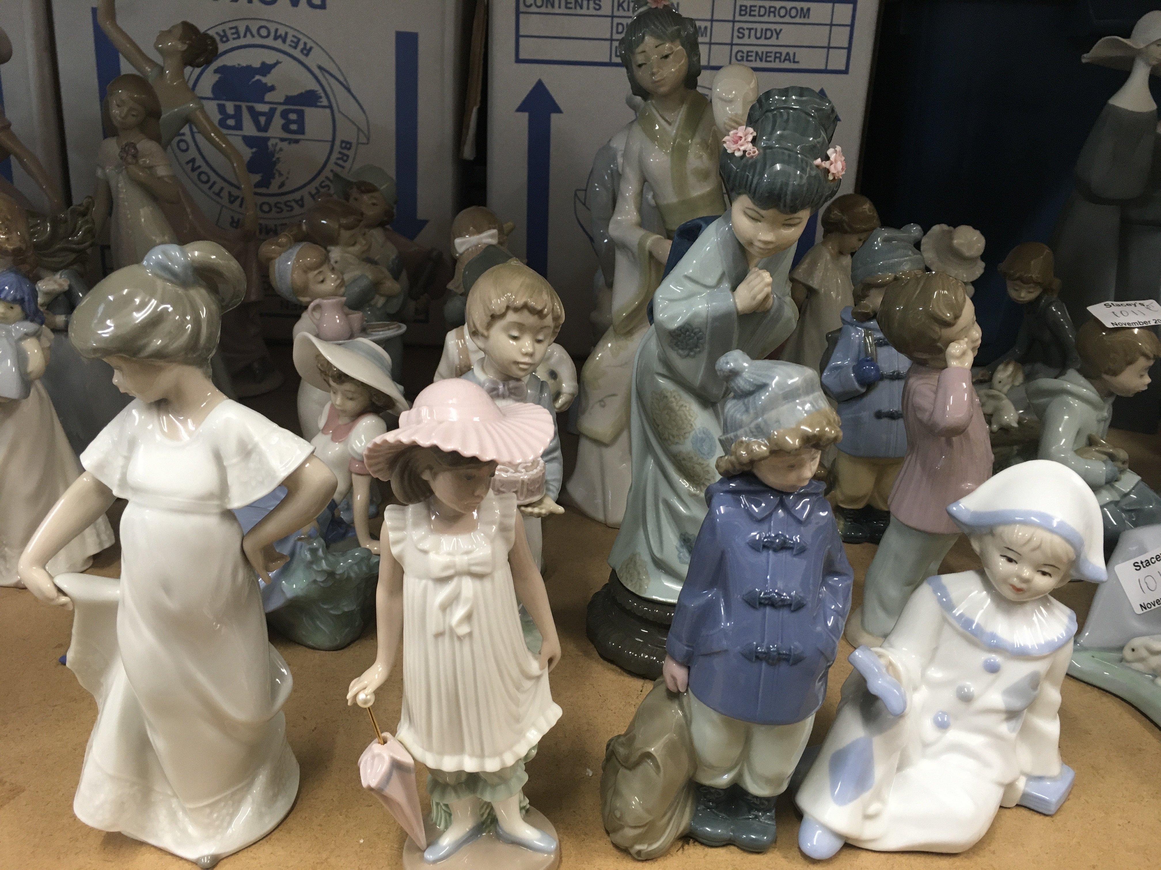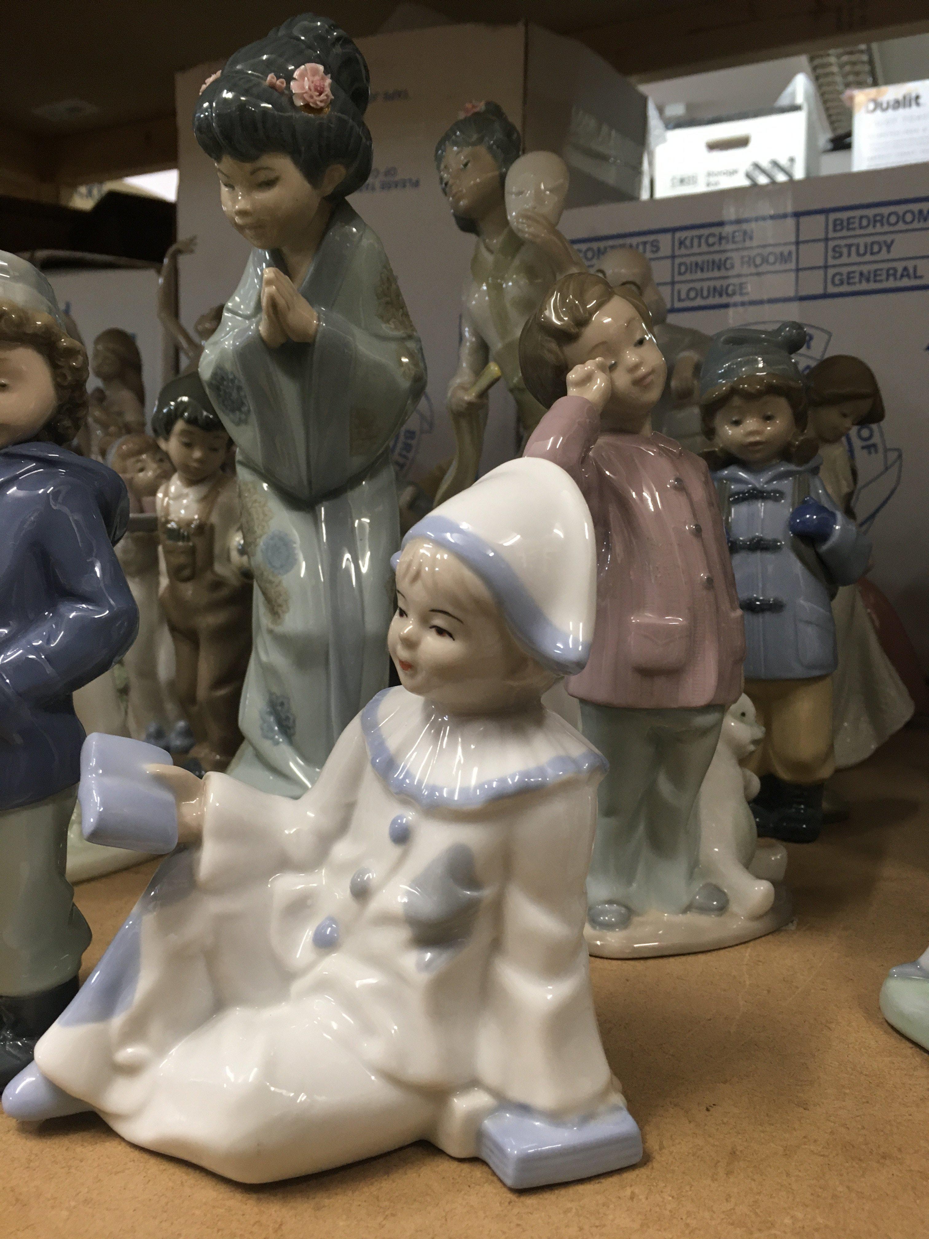 A collection of Nao figures including two large Geisha and boy with skateboard