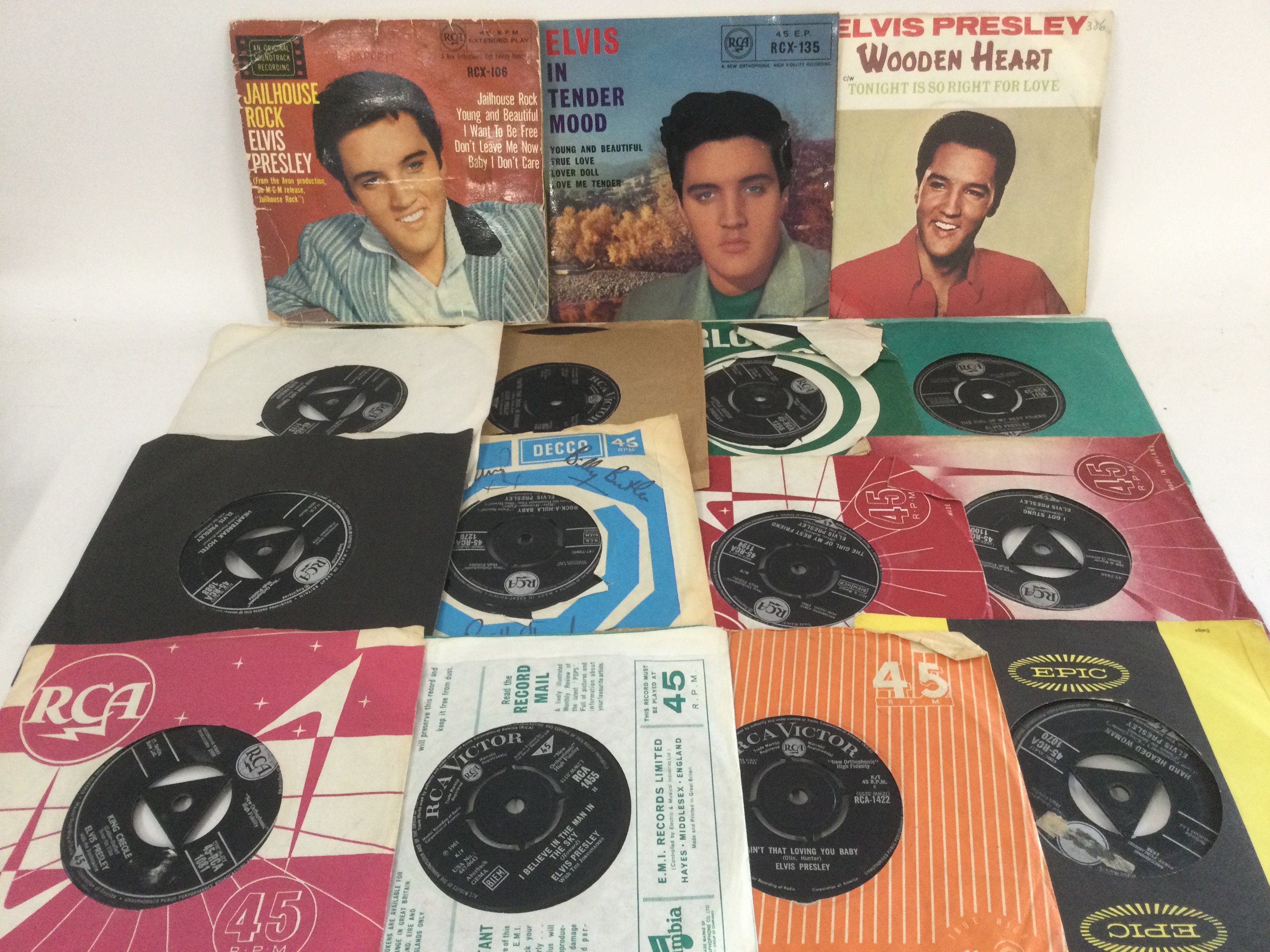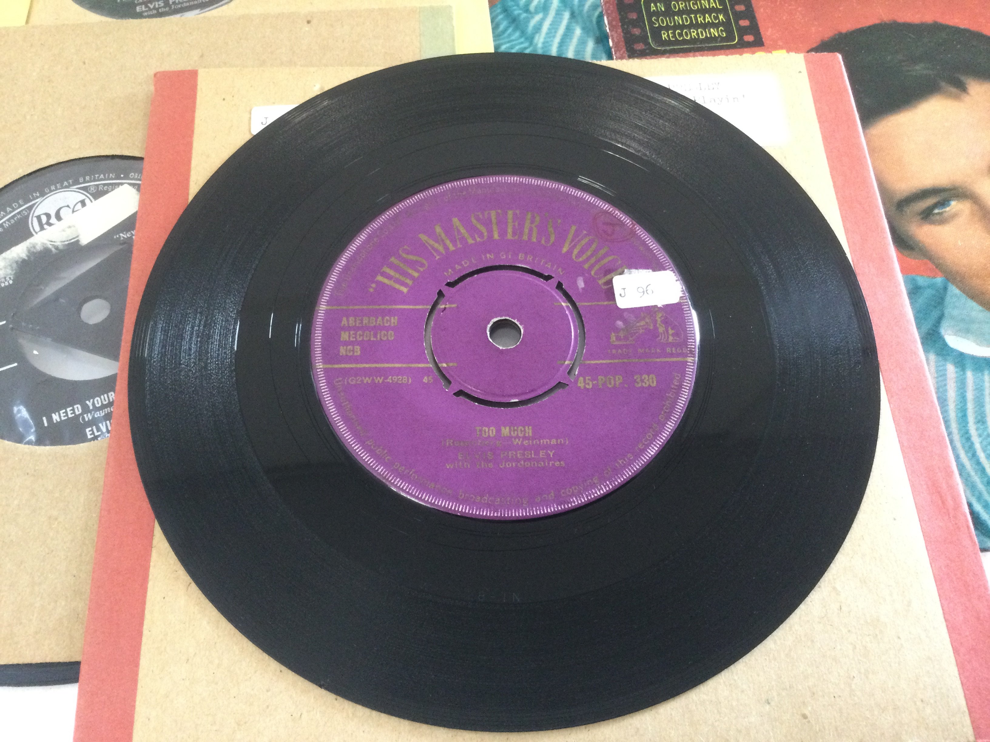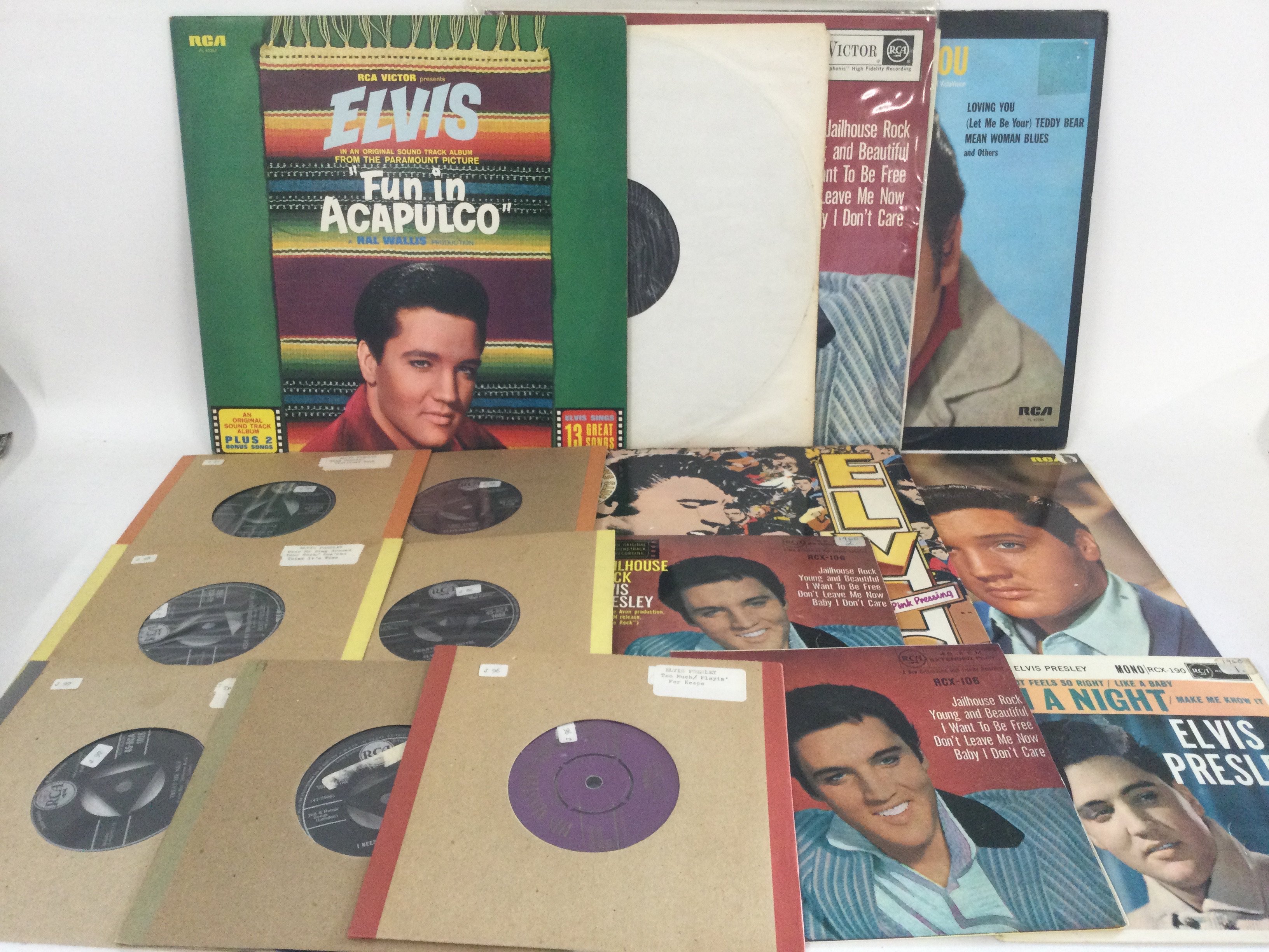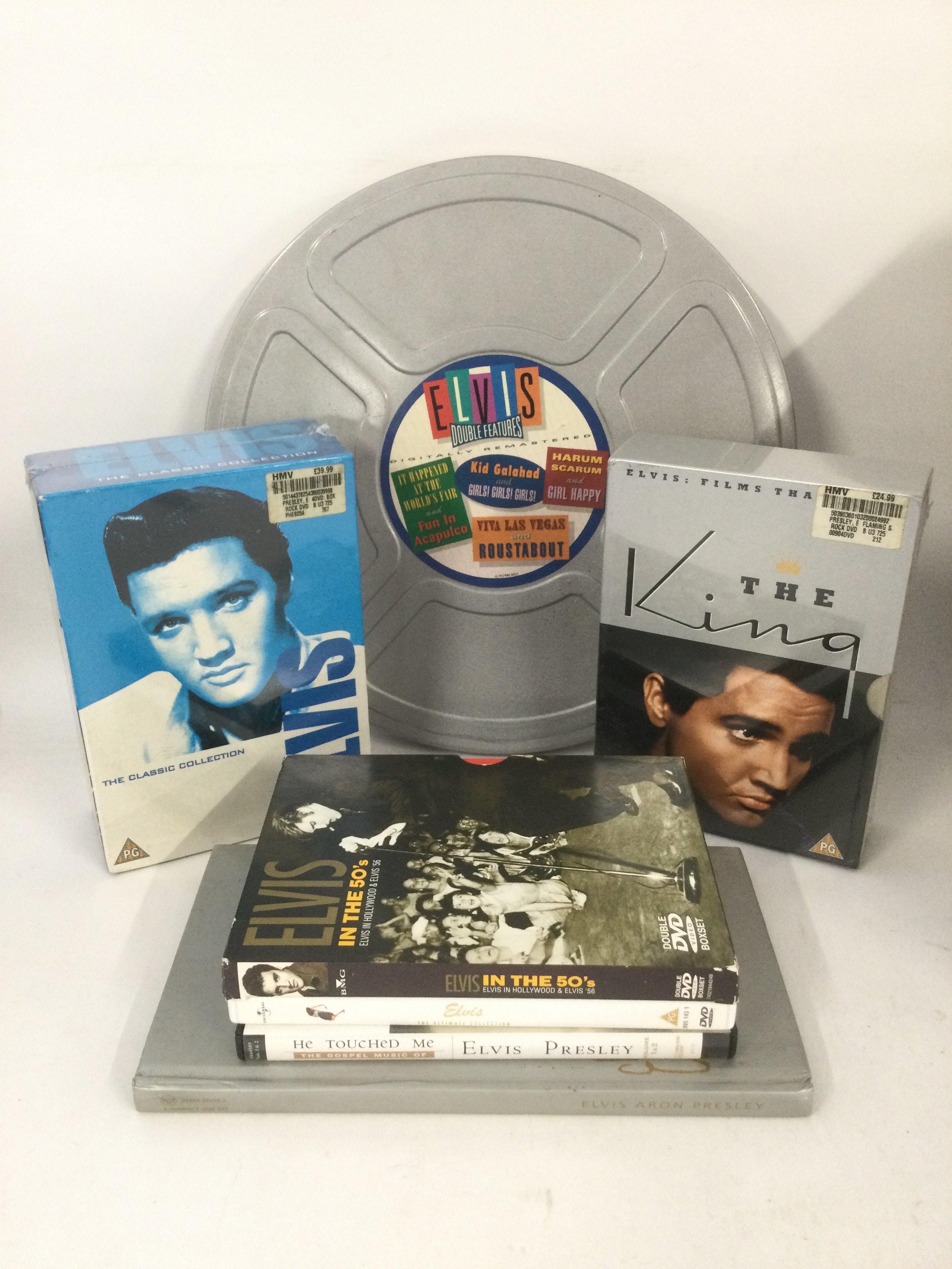 A box of Elvis Presley LPs, 7" singles, EPs, DVDs etc including a purple HMV label, incomplete EP collection, pink vinyl '40 Greatest', picture discs etc.