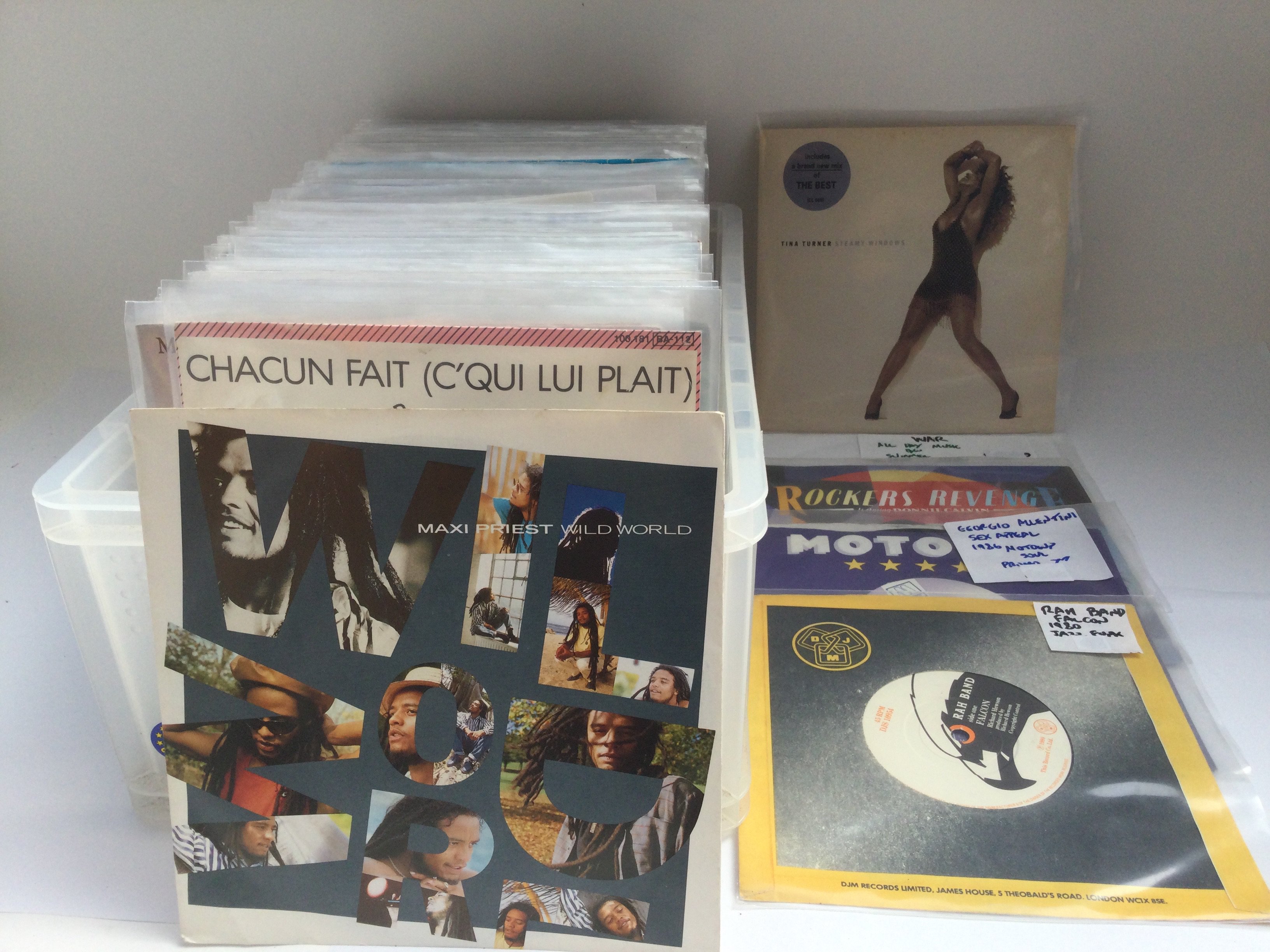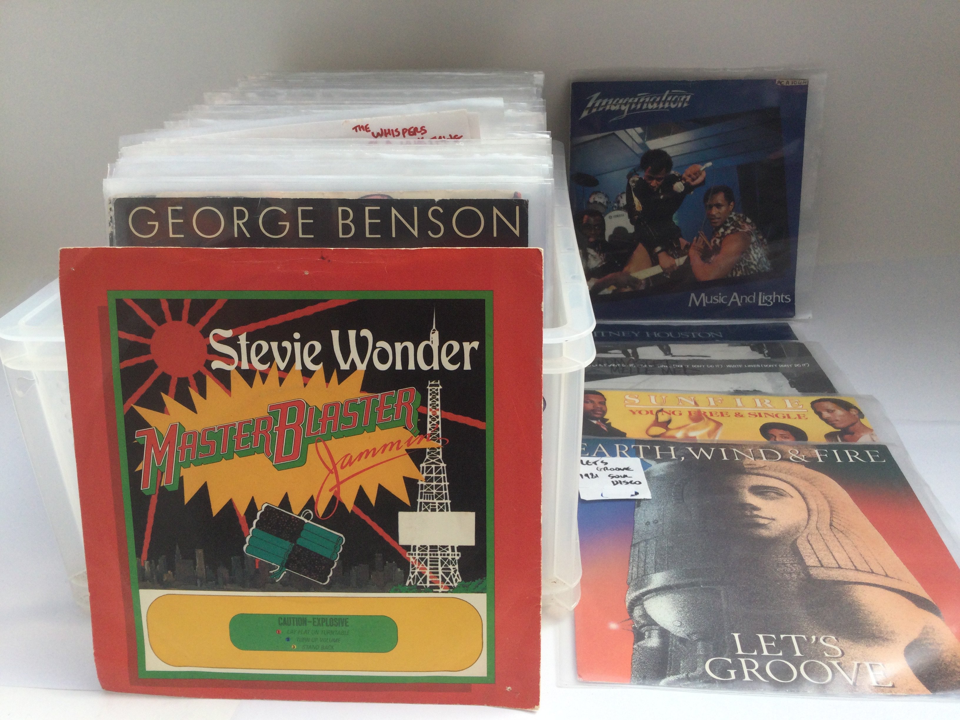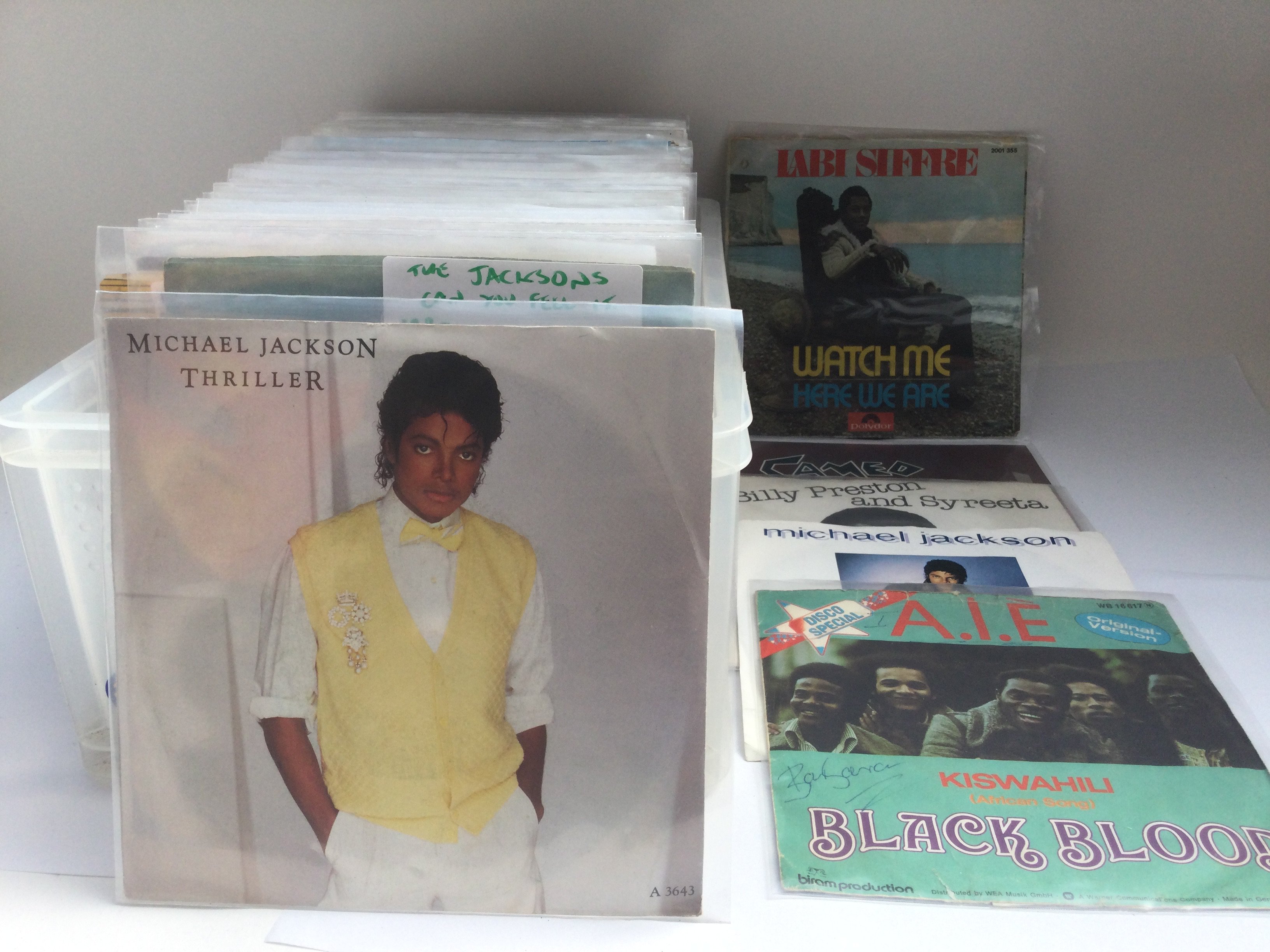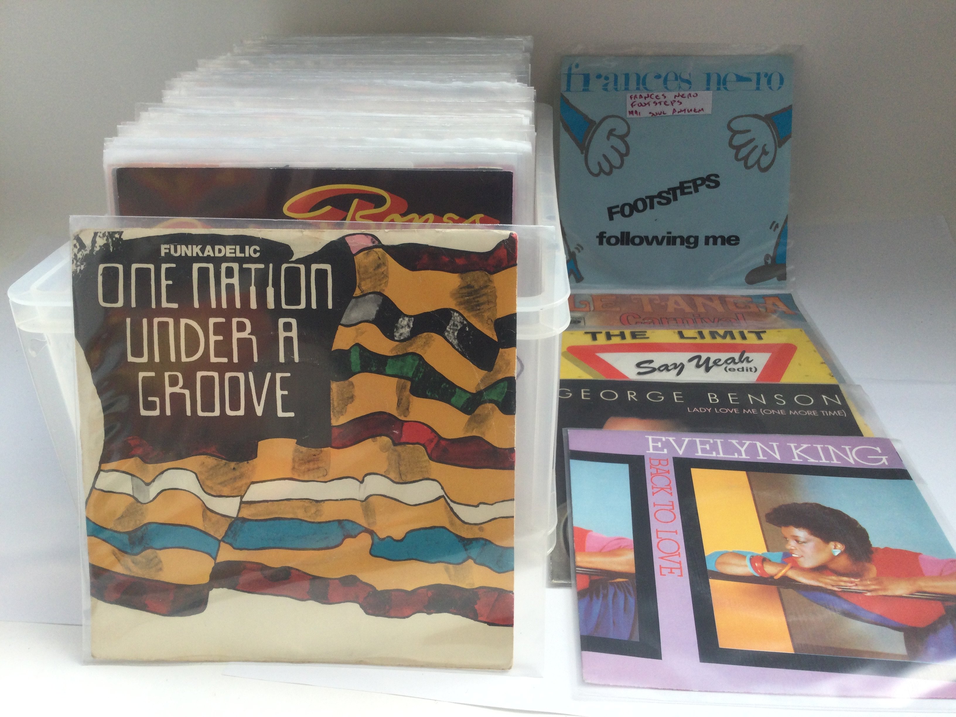 Two boxes of approx 250 soul, funk and disco 7" singles by various artists including James Brown, Funkadelic, Cameo, Stevie Wonder and many more.