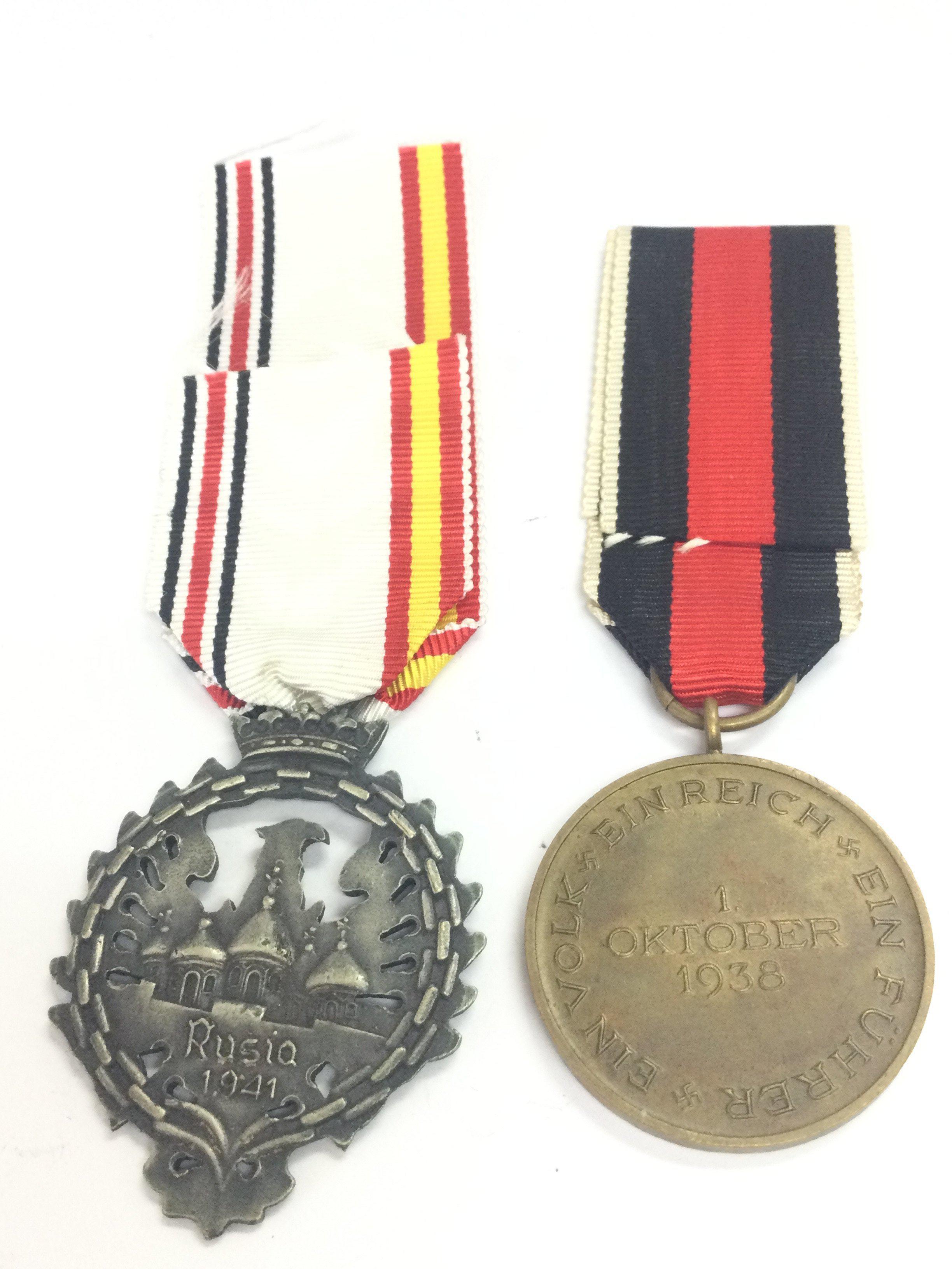 A collection of Third Reich items including a Sports eagle cloth badge, Sudentenland 1938 medal, DRL sports badge, Medal of the Spanish Blue Division Russia Service. Postage category A