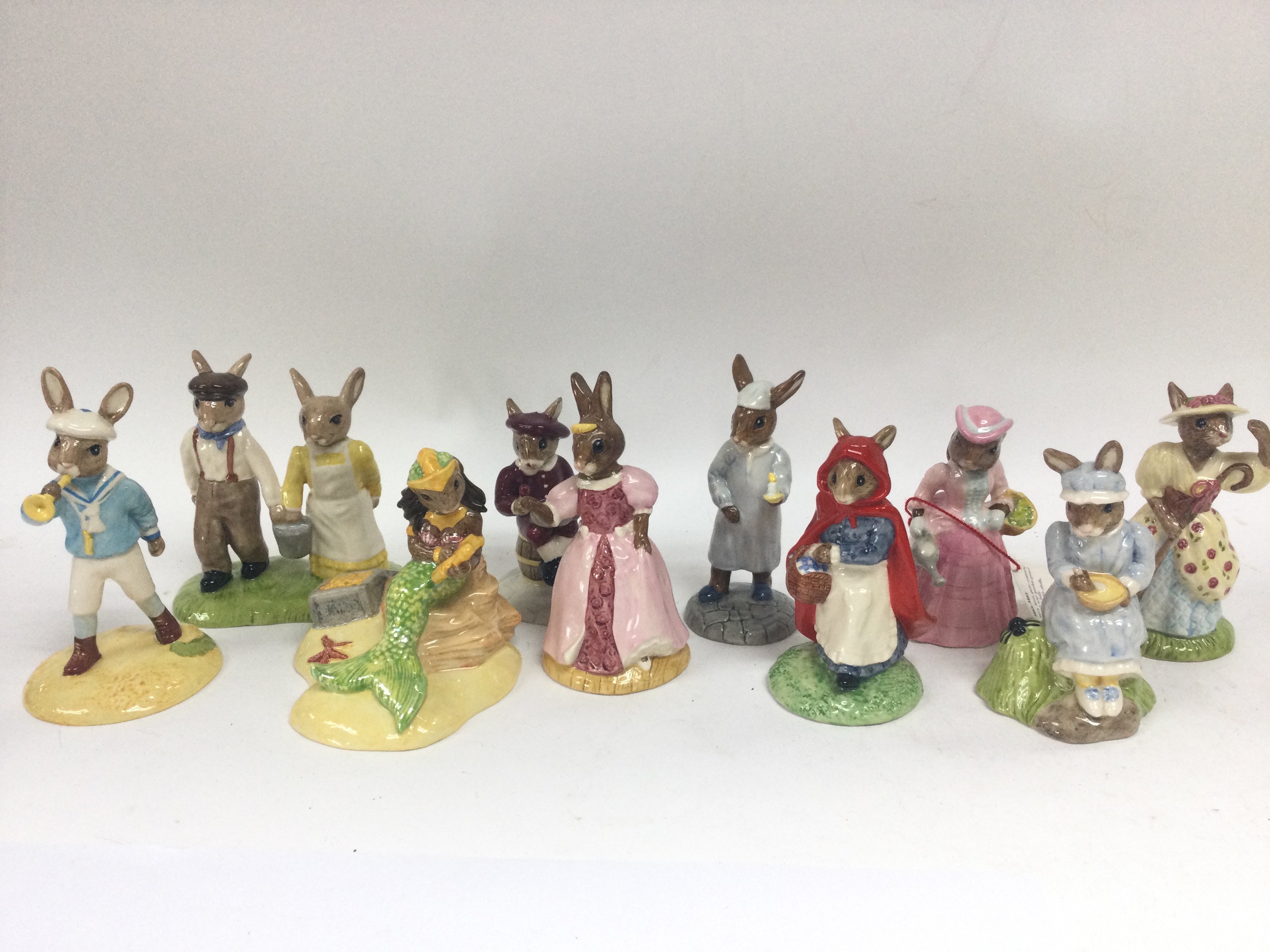 A collection of porcelain Bunnykins figures including Mermaid Bunnykins, Little Bo Peep, Little Boy Blue Bunnykins. This lot cannot be posted