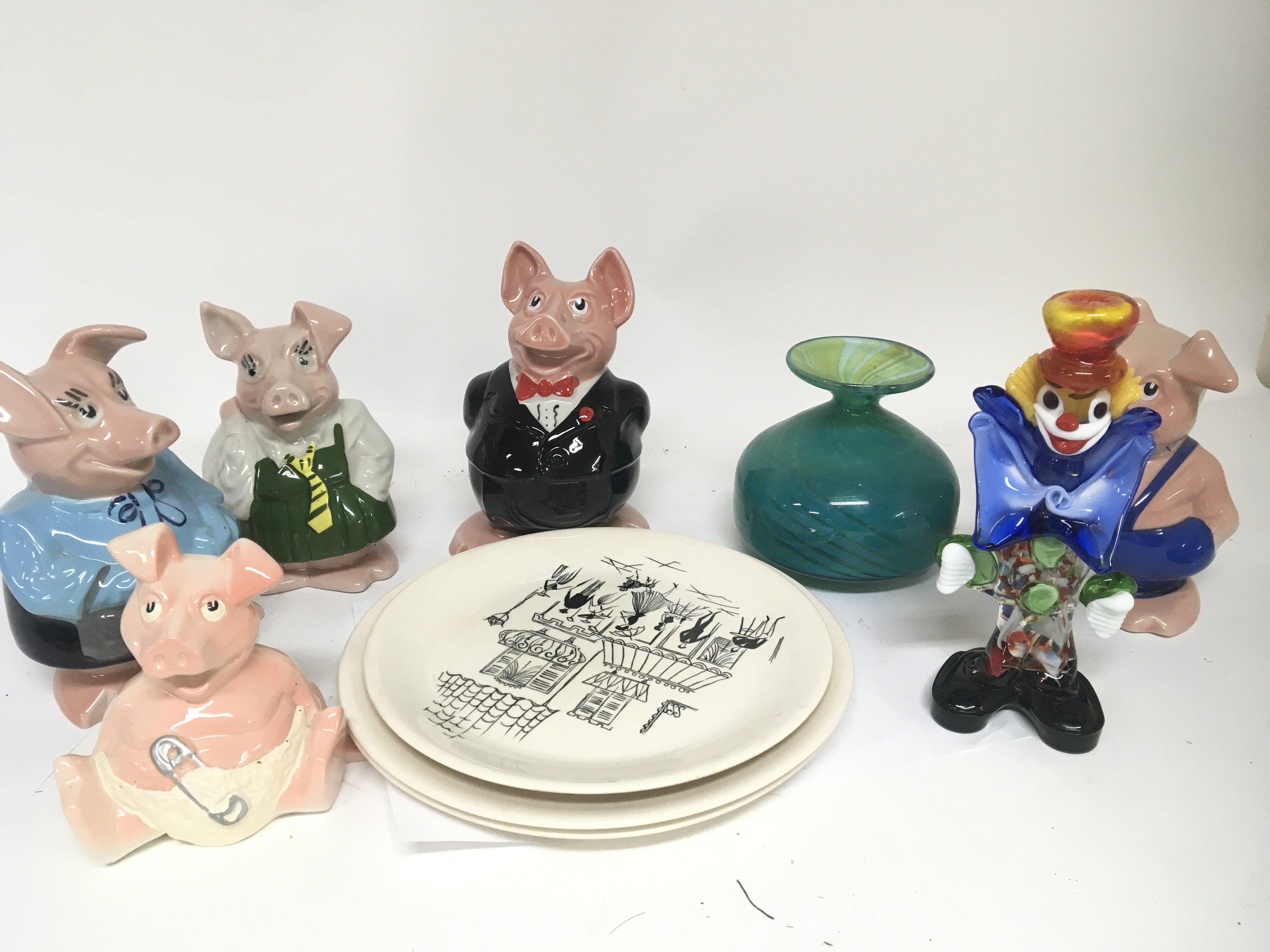 A set of NatWest Pig ceramic money boxes Murano glass and Meakin plates of mid 20th century design and a Medina type glass vase.