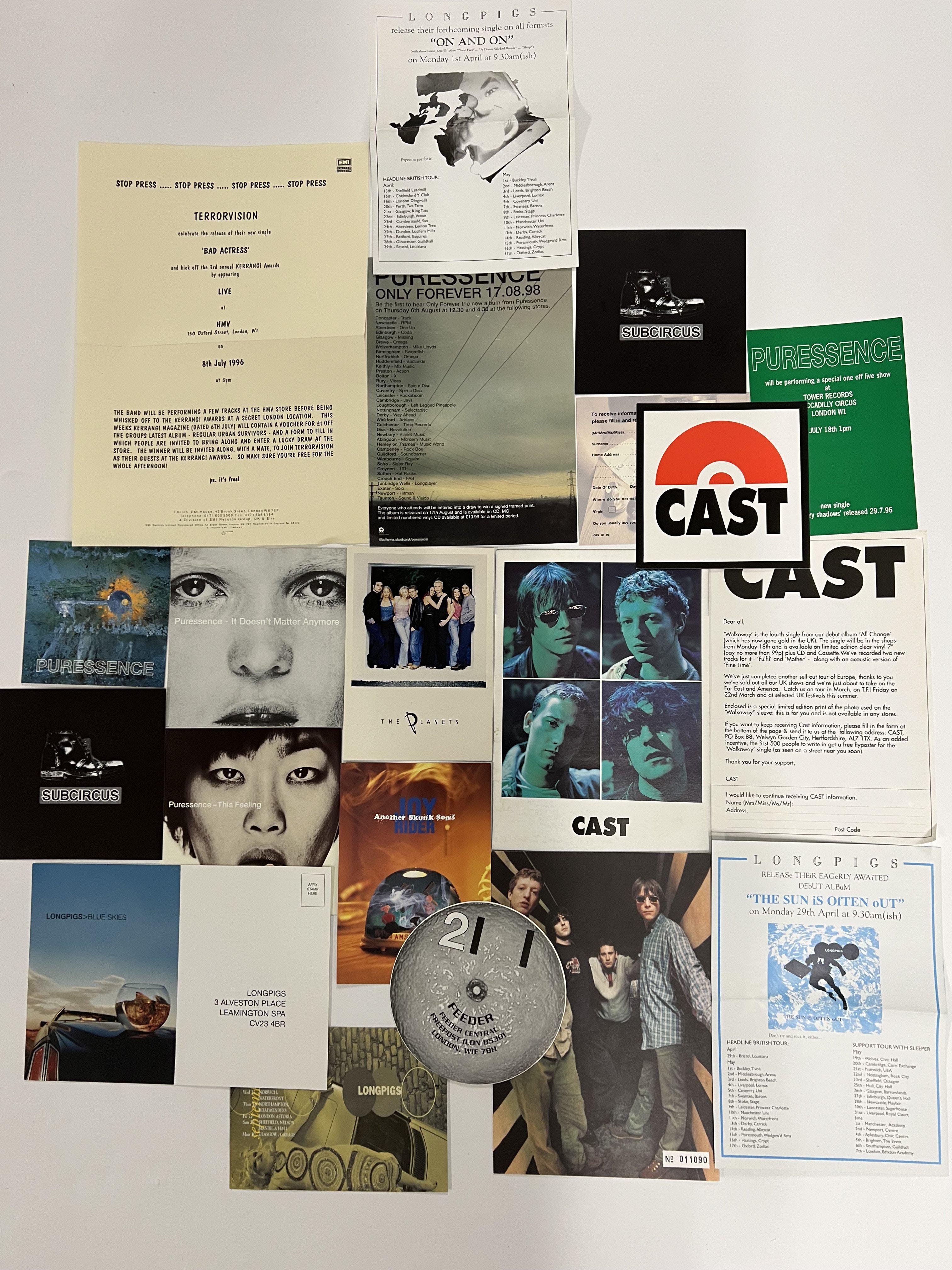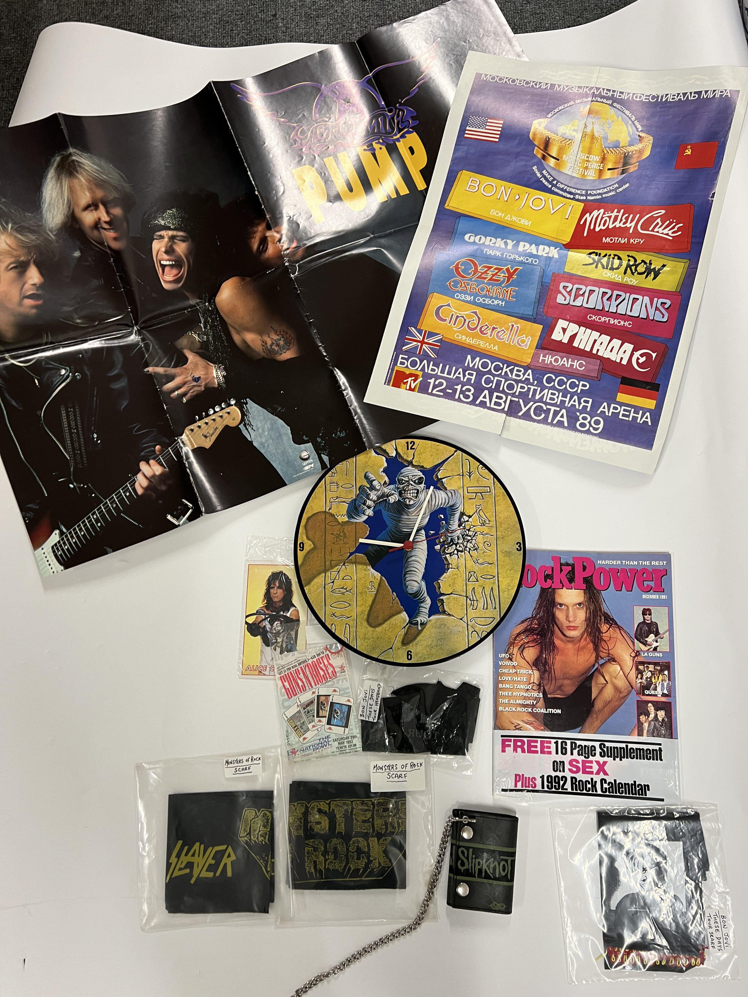 A selection of Heavy Rock, Metal and indie ephemera to include 2 Geffen Records Aerosmith promo poster - printed ephemera for Alice Cooper and Guns N Roses - scarfs for Monsters of Rock and Bon Jovi and an Iron Maiden Clock, flyers etc.