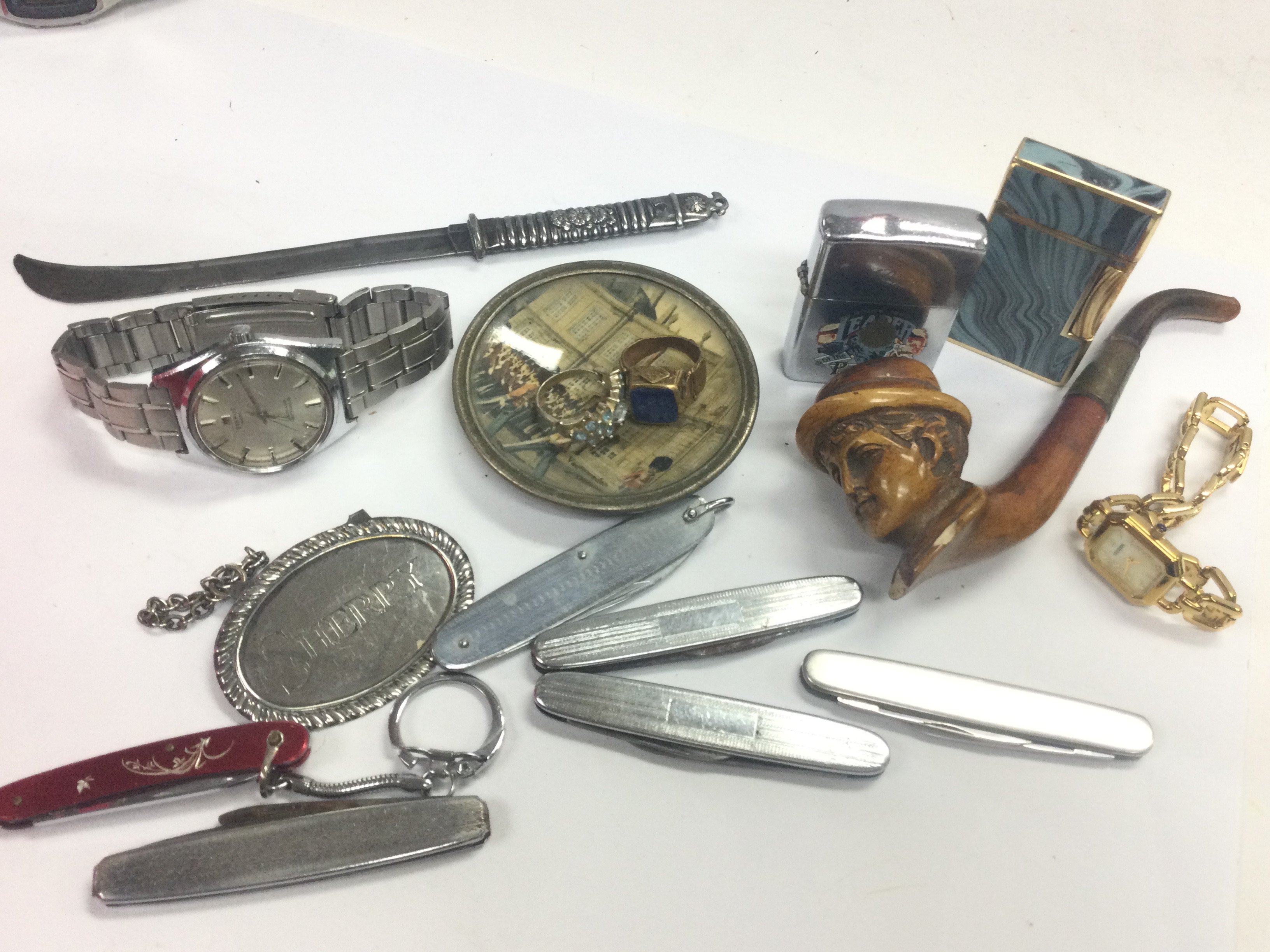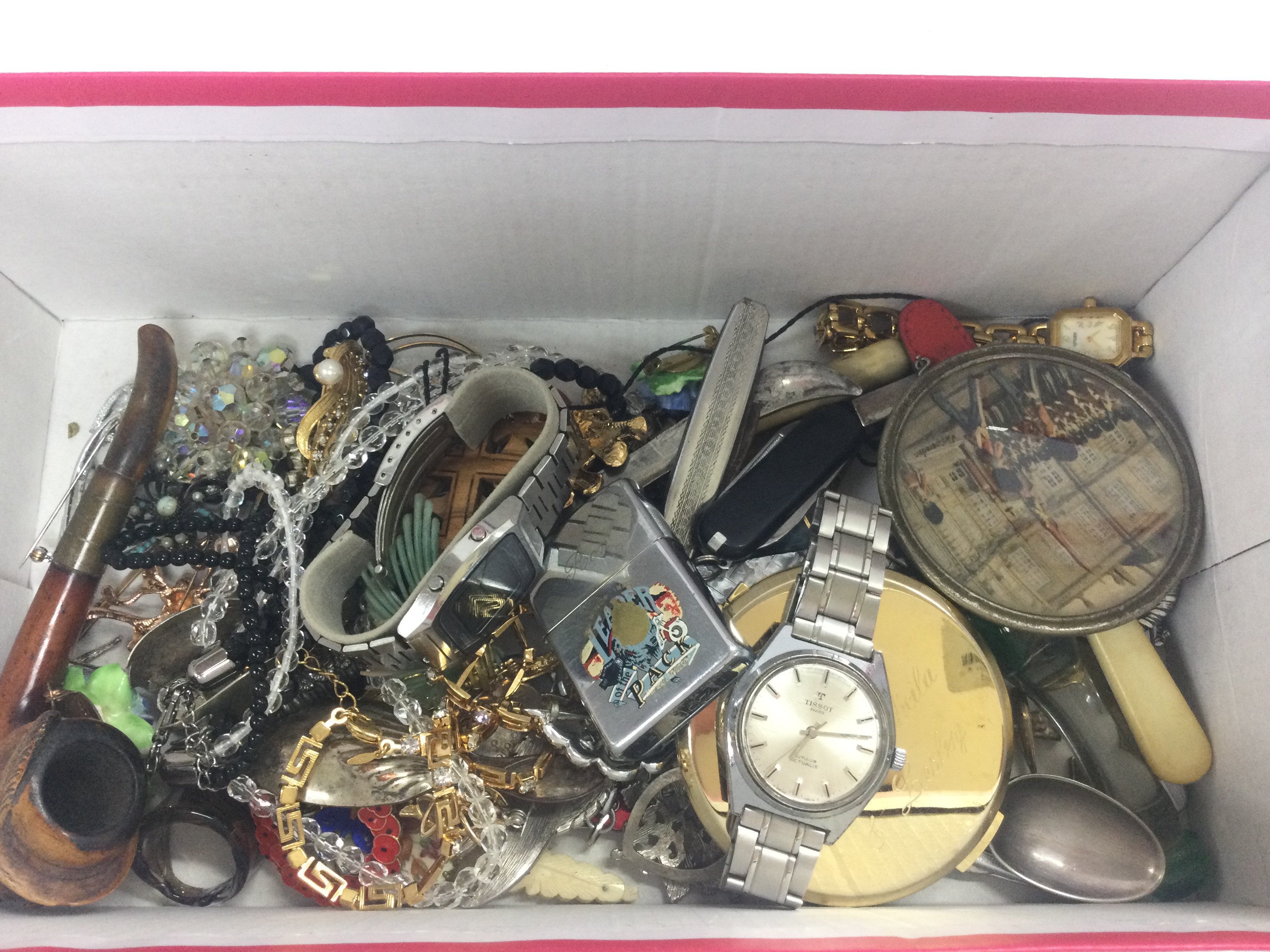 A collection of costume jewellery including a Tissot Autolub Actualis, penknives, wooden pipe, lighters etc. postage category B