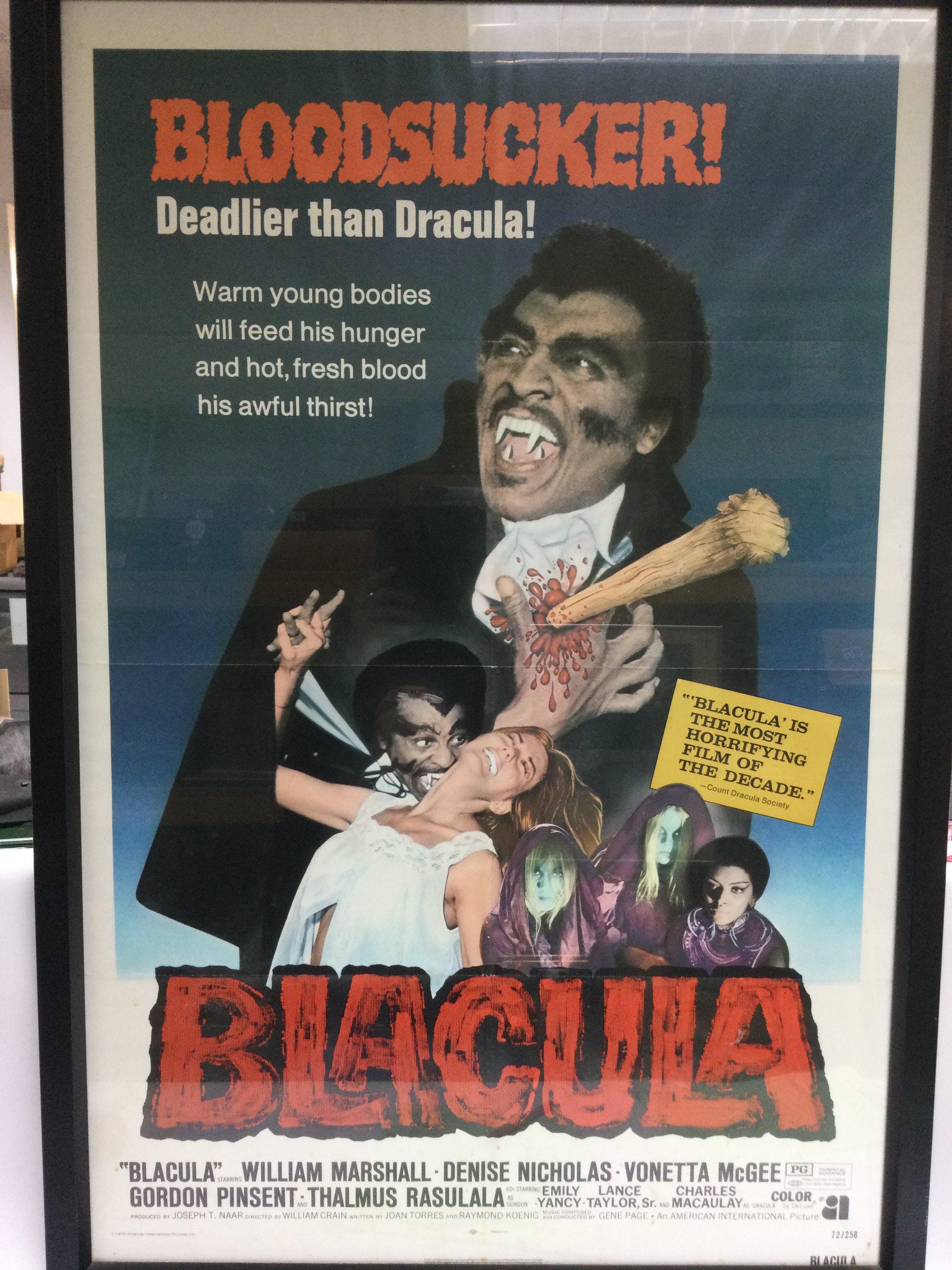 A US one sheet film poster for the 1972 vampire horror film 'Blacula', framed but has been folded, good condition. Approx 75cm x 110cm including frame.