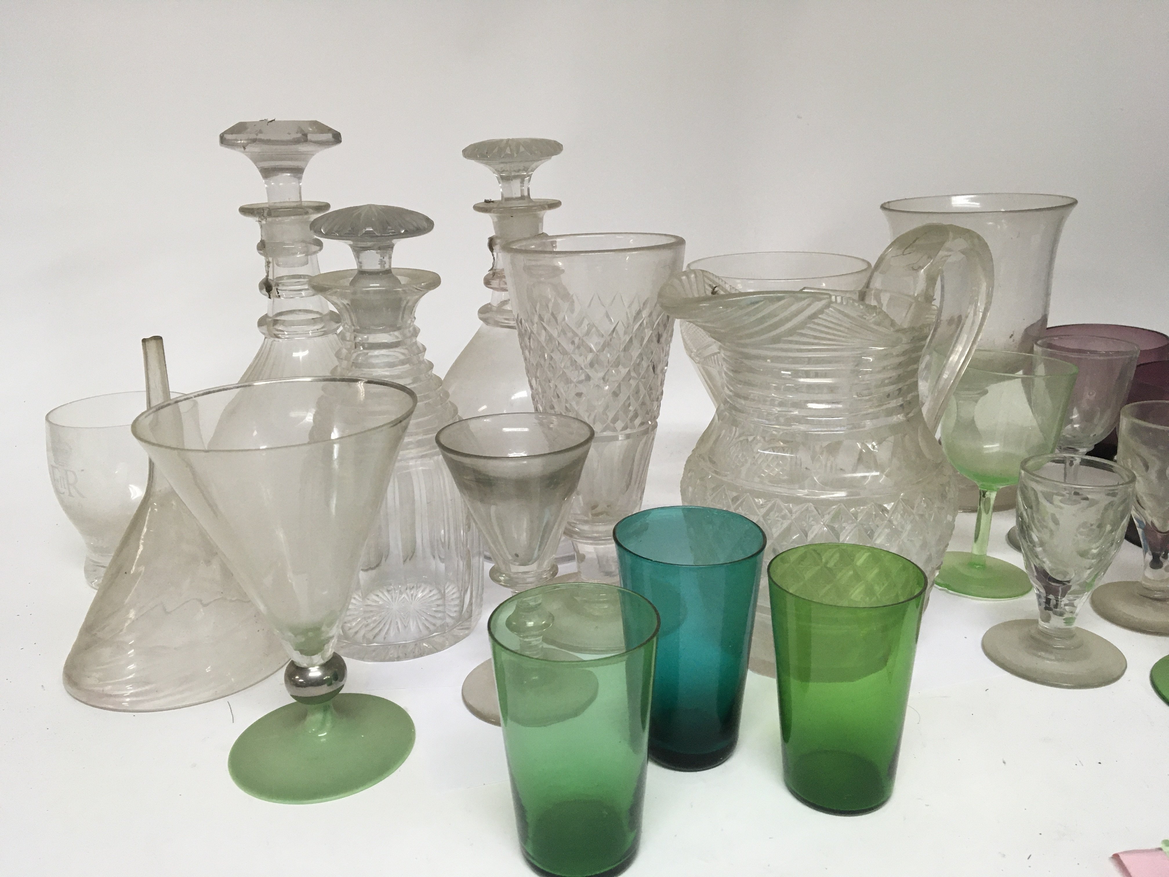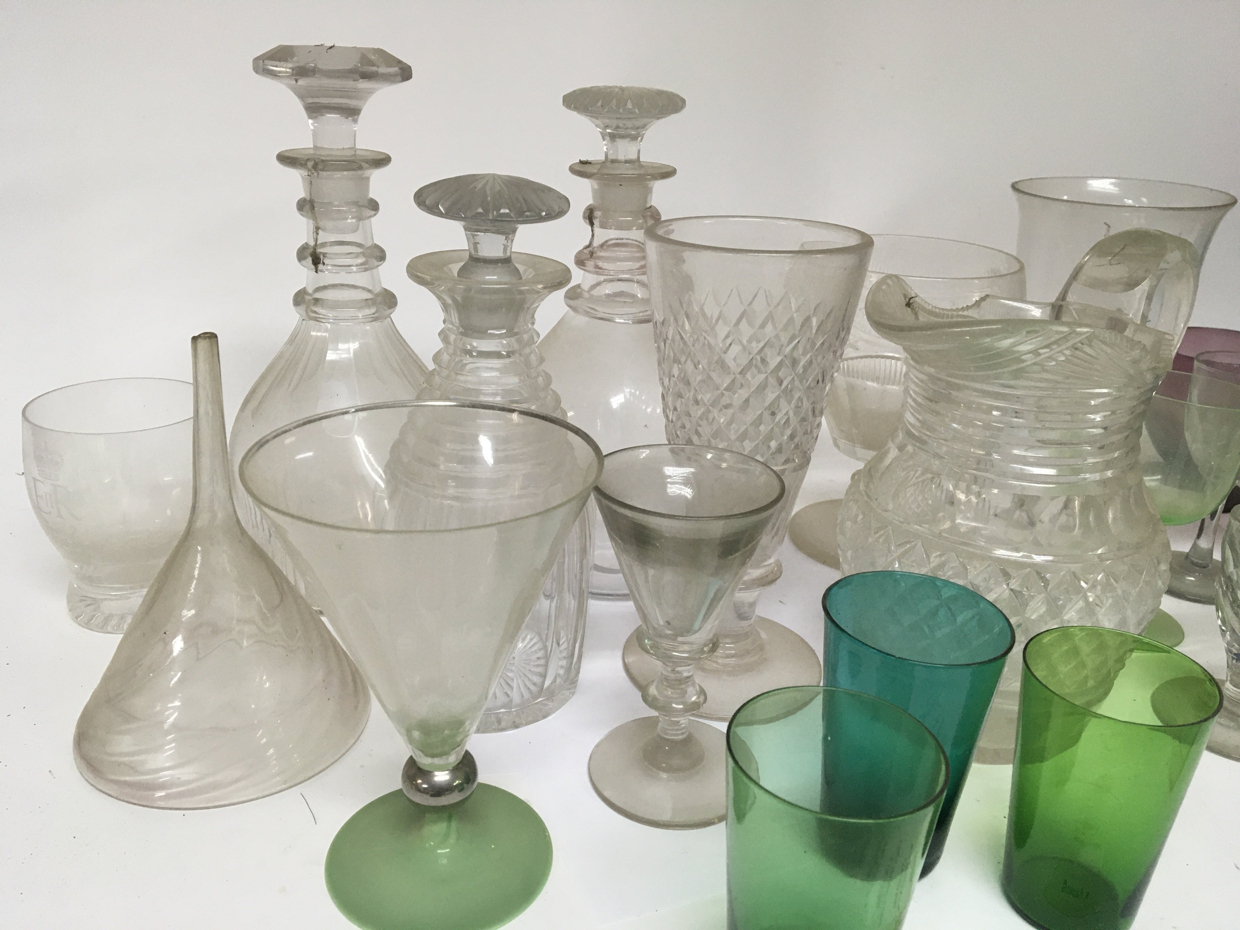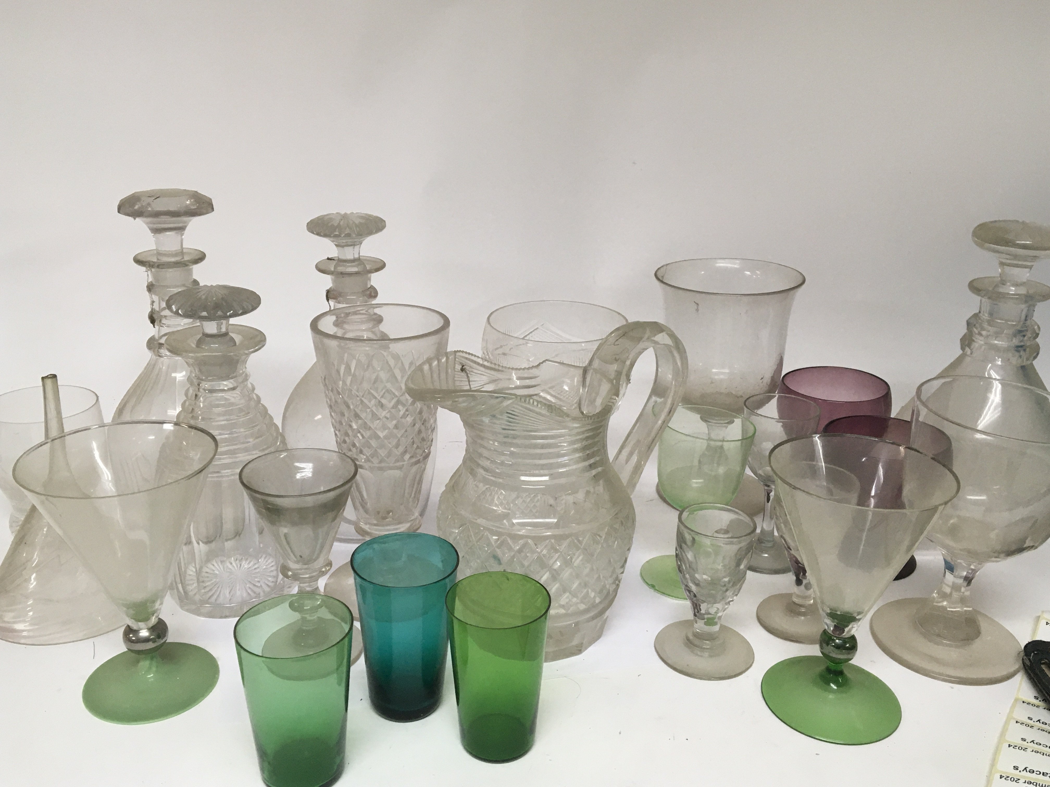 A collection of early and later 19th century glass including George III ring neck decanters a glass wine funnel coloured drinking glasses and other glass.