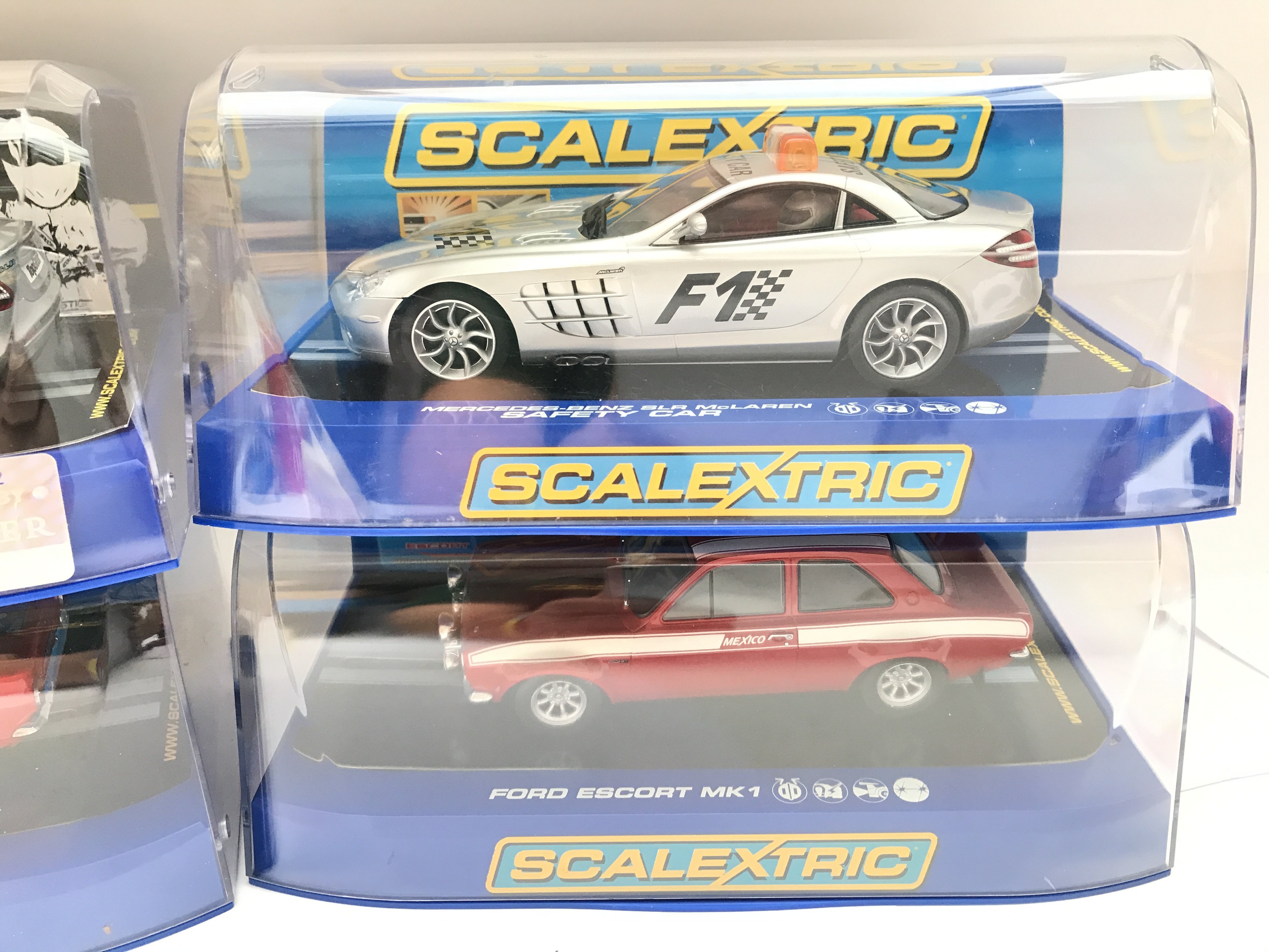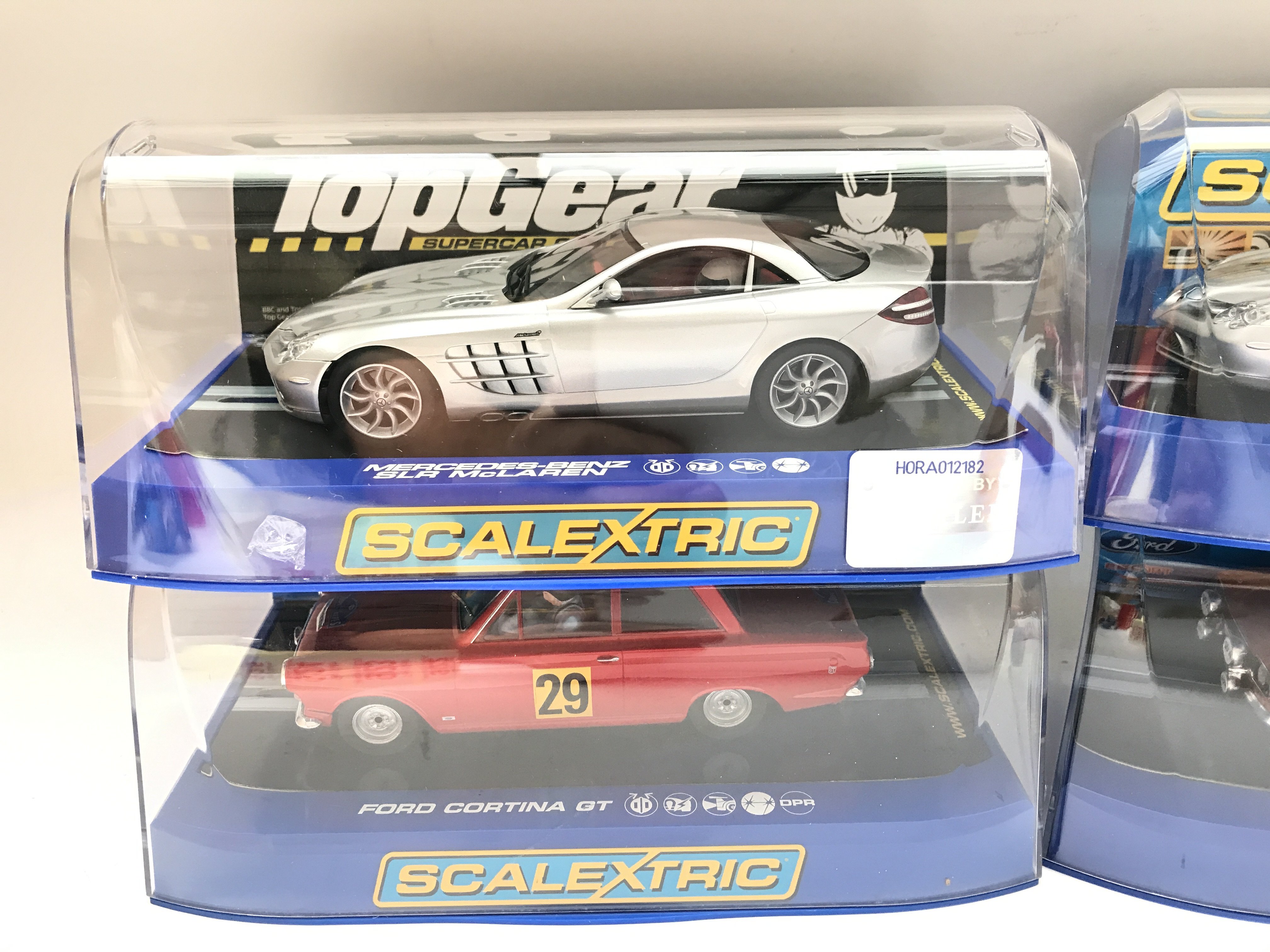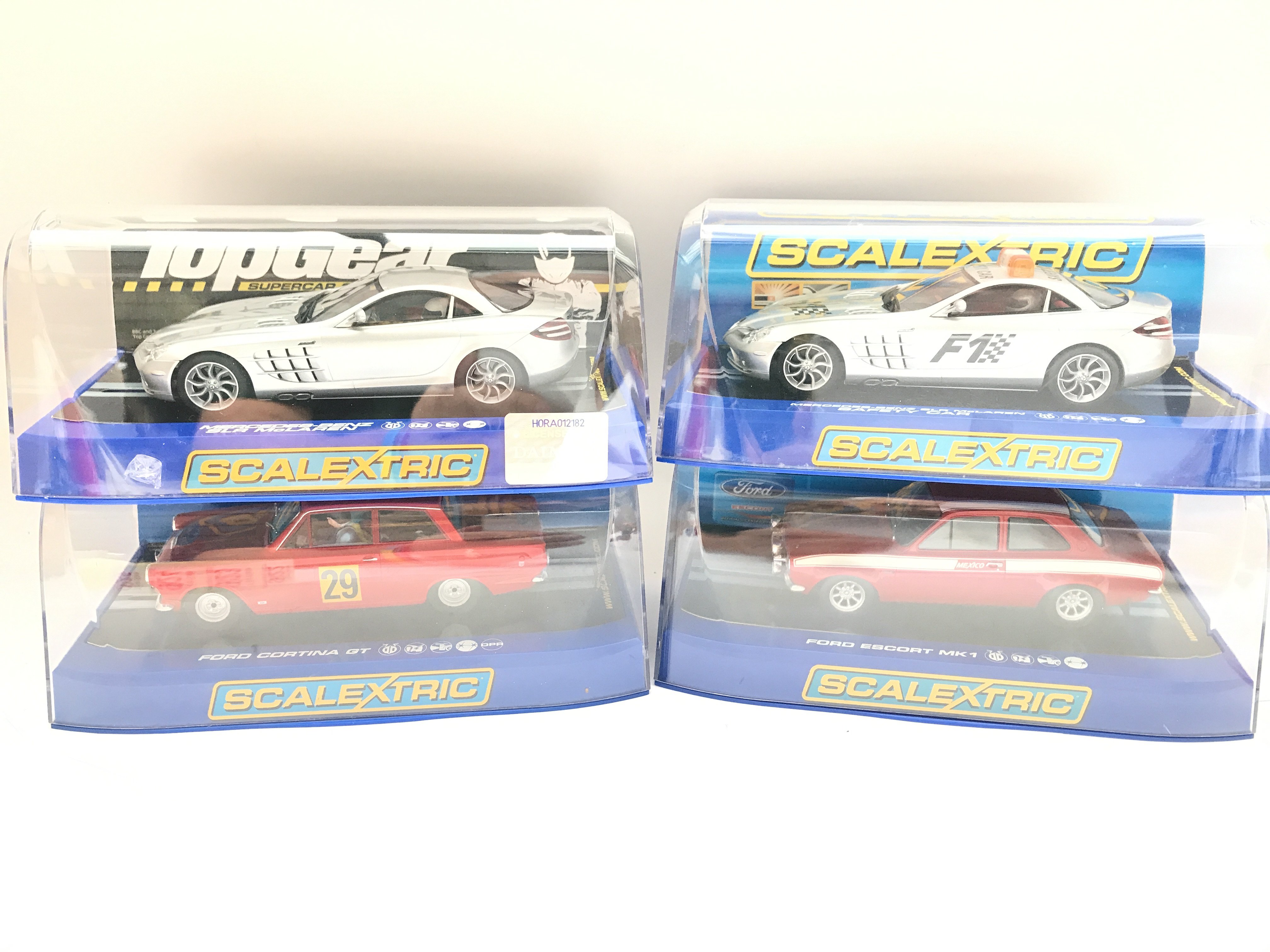 4 Boxed Scalextric Cars including A Ford Cortina. Ford Escort. A Mercedes-Benz SLR McLaren and a Mercedes-Benz SLR McLaren Safety Car.
