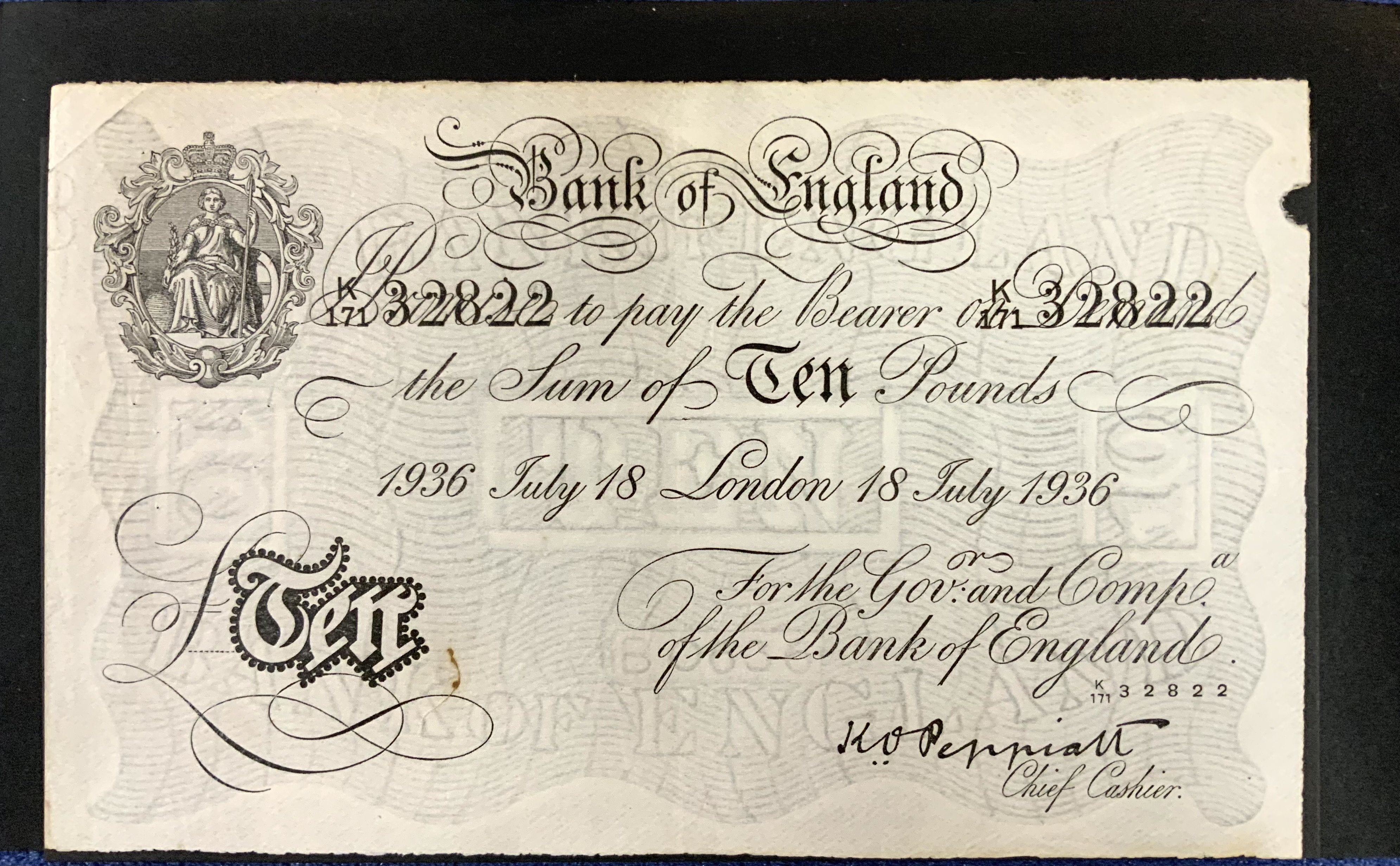 Operation Bernhard - Nazi forgery 1942-44, Peppiatt, £10, 18th July 1936, K171 32822, discolour, NEF, crescent shape missing from top right corner. (A)