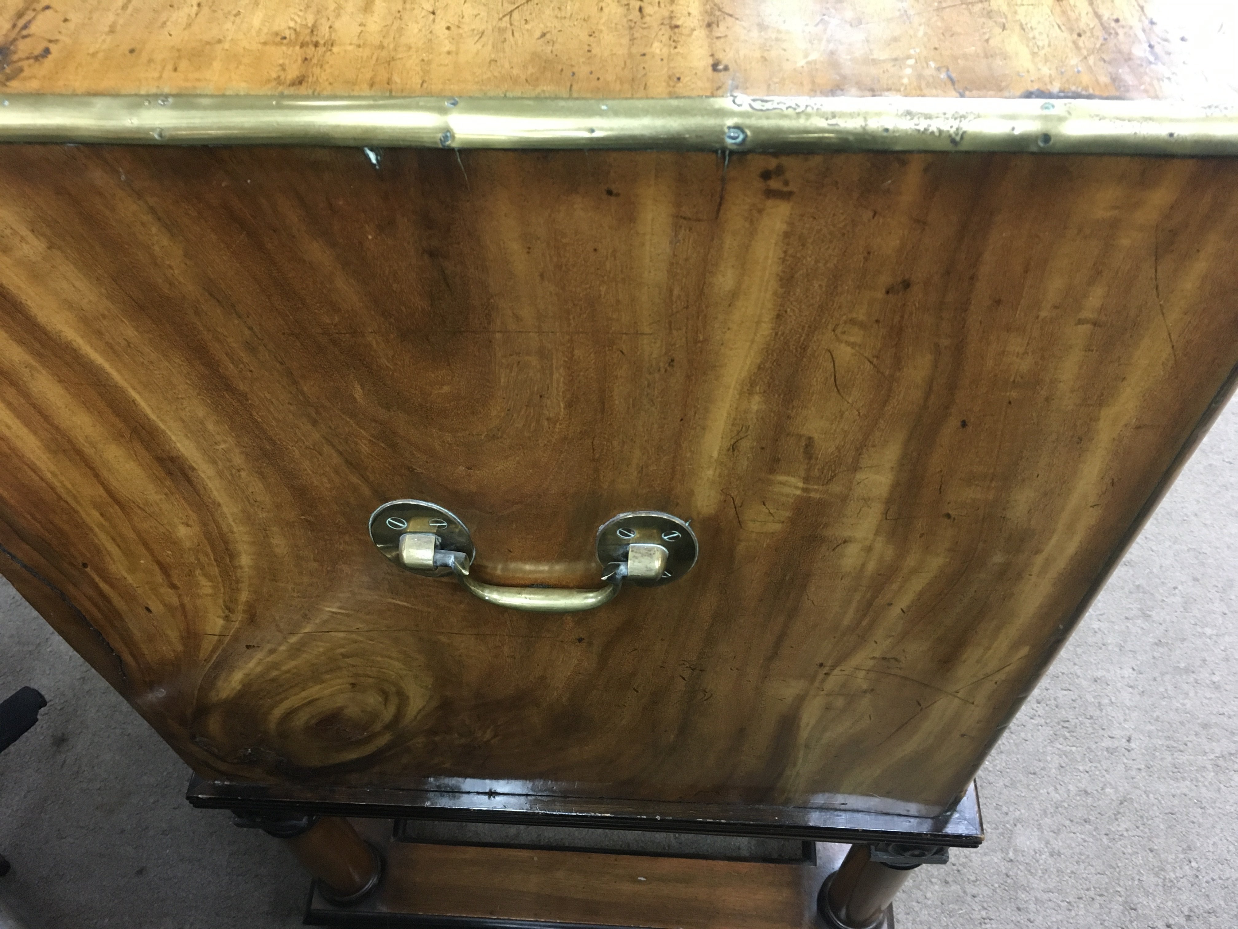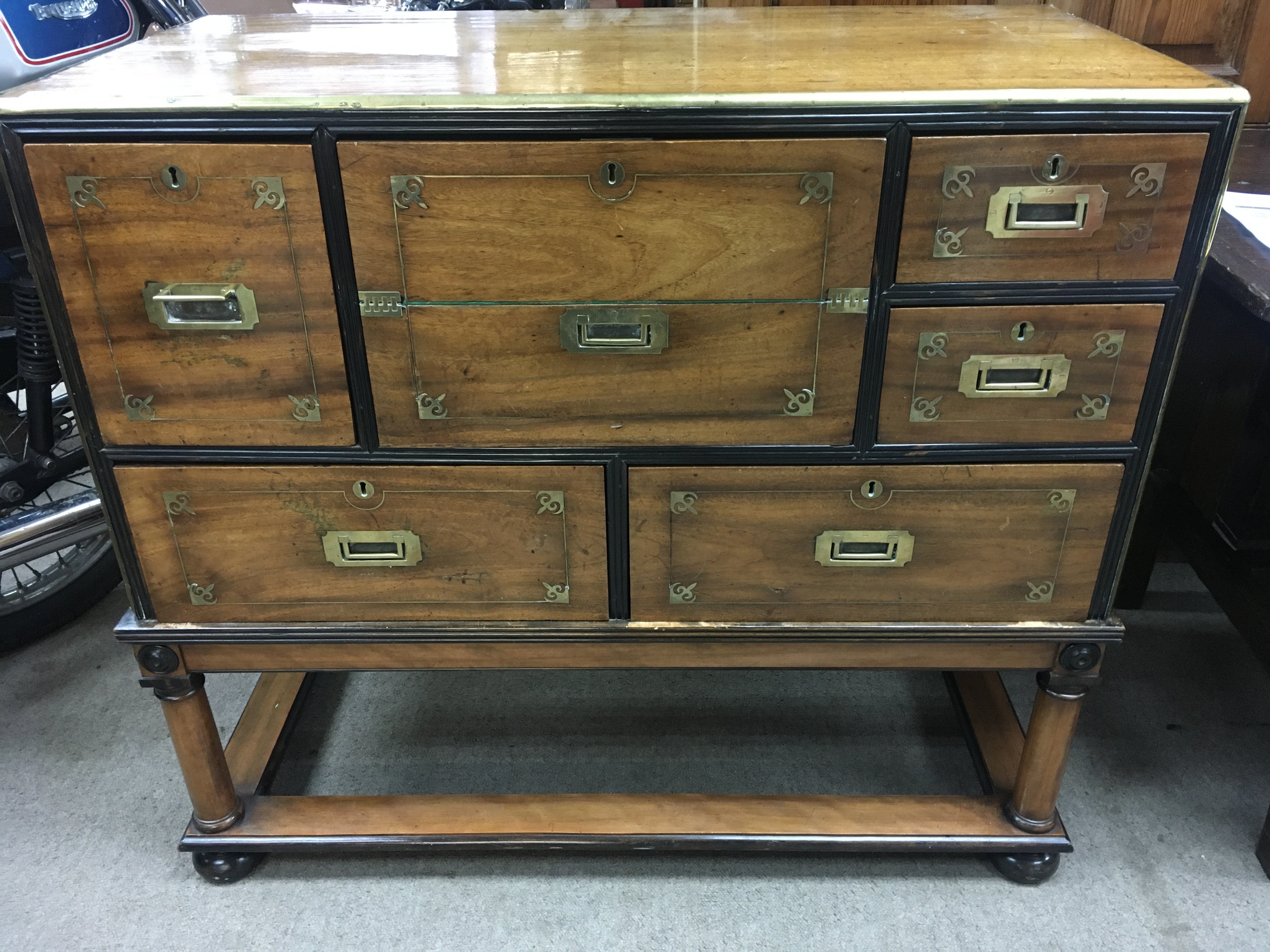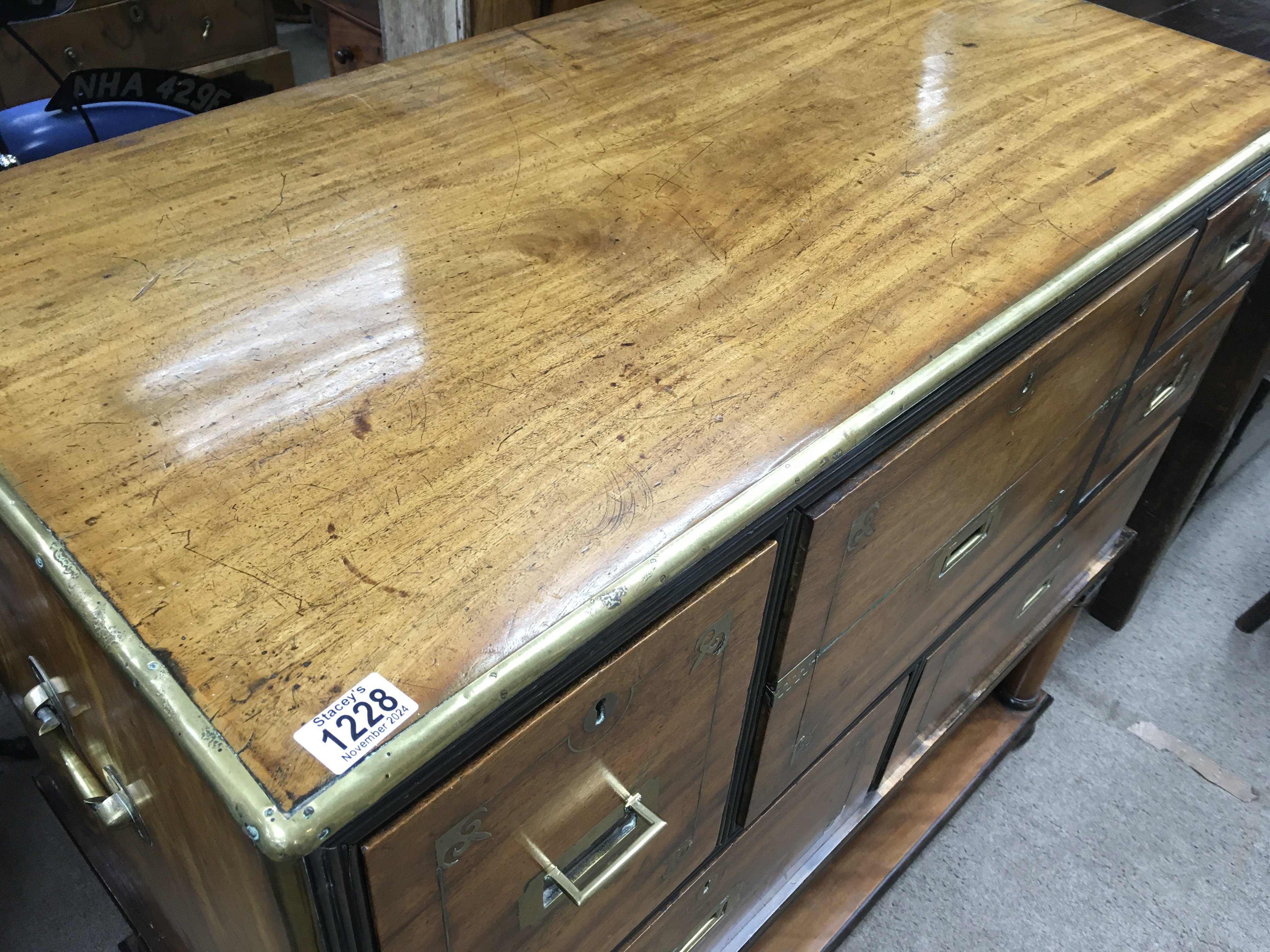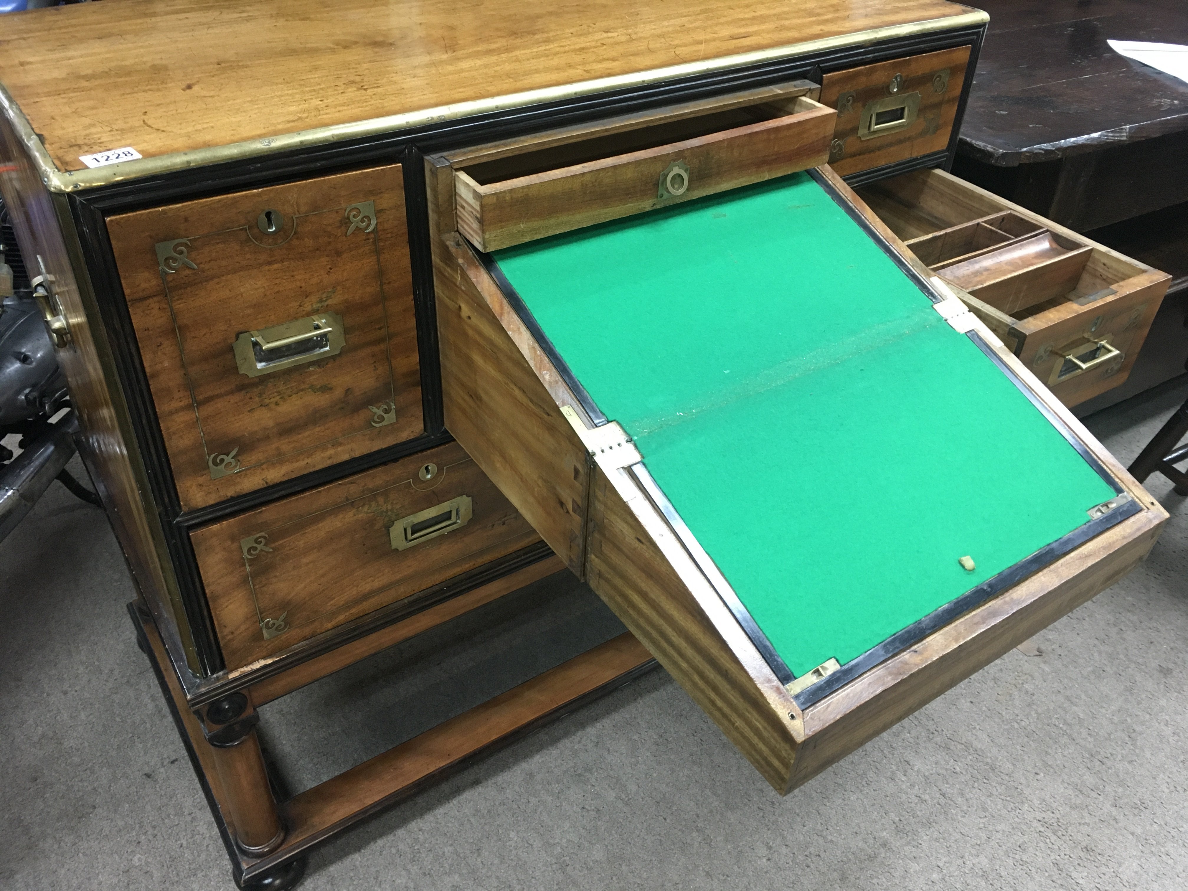 A mahogany brass bound campaign secretaire with five drawers and desk compartment on Stand . 100 cm x 50 cm Height 92 cm .