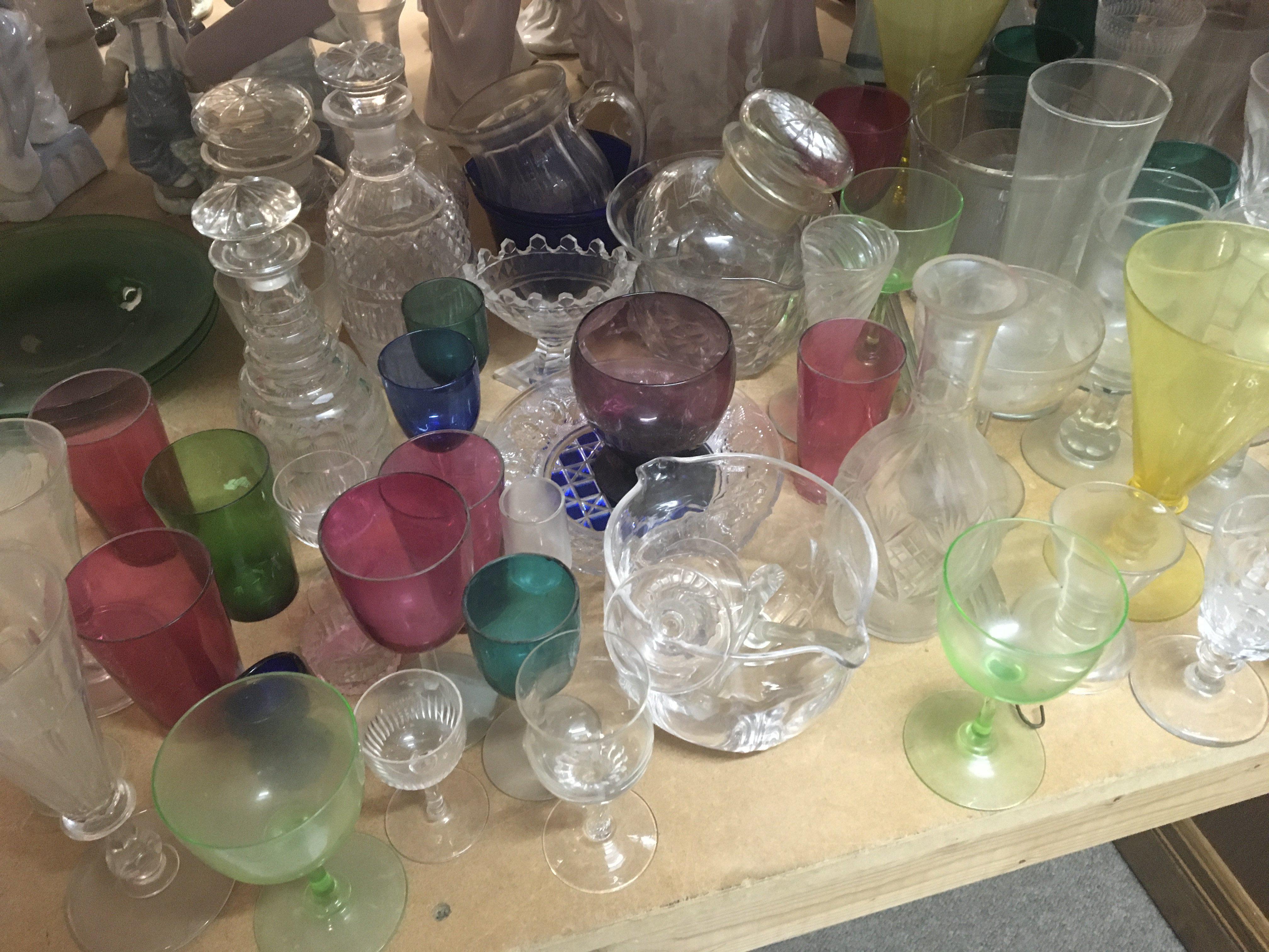 A large collection of interesting glass early 19th century and later including glass mixing bowls coloured glass decanters etc.