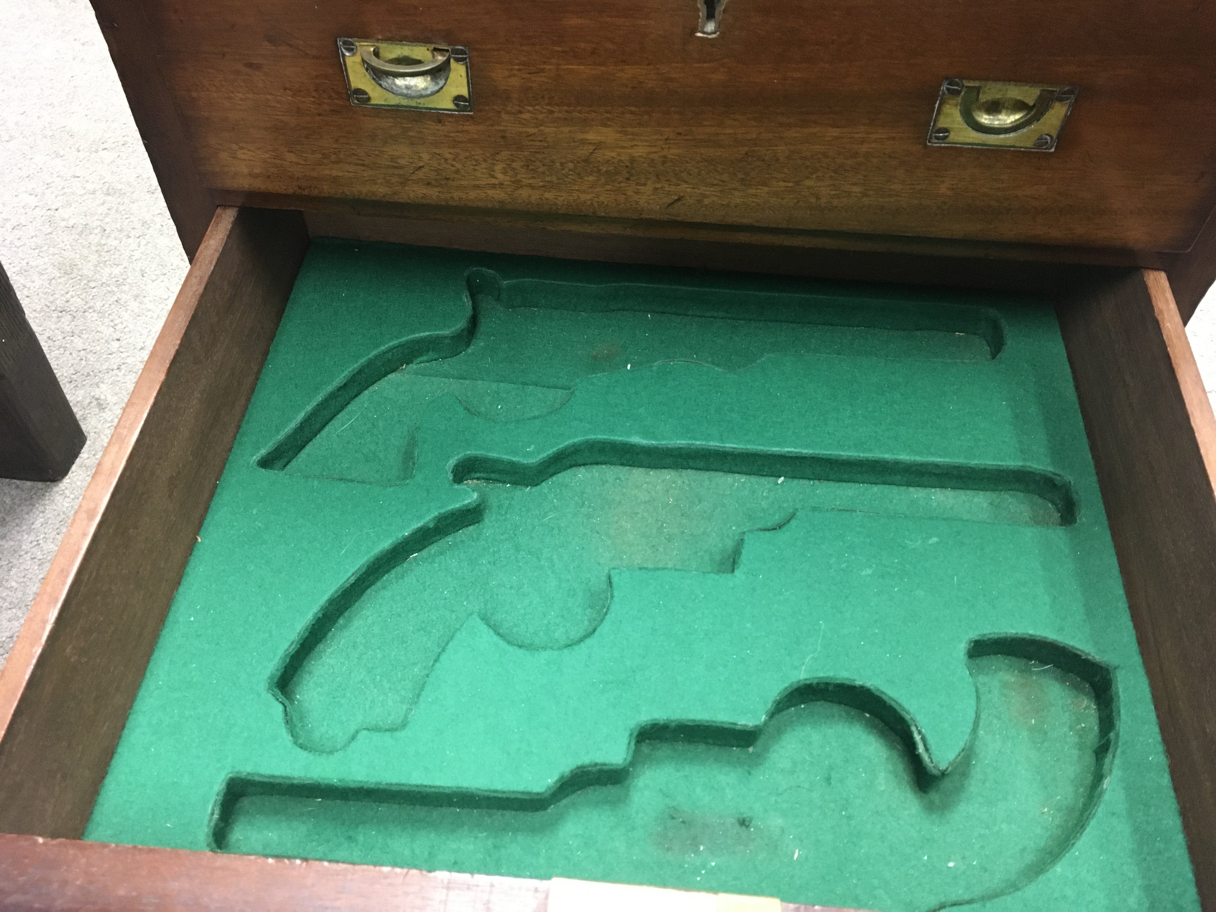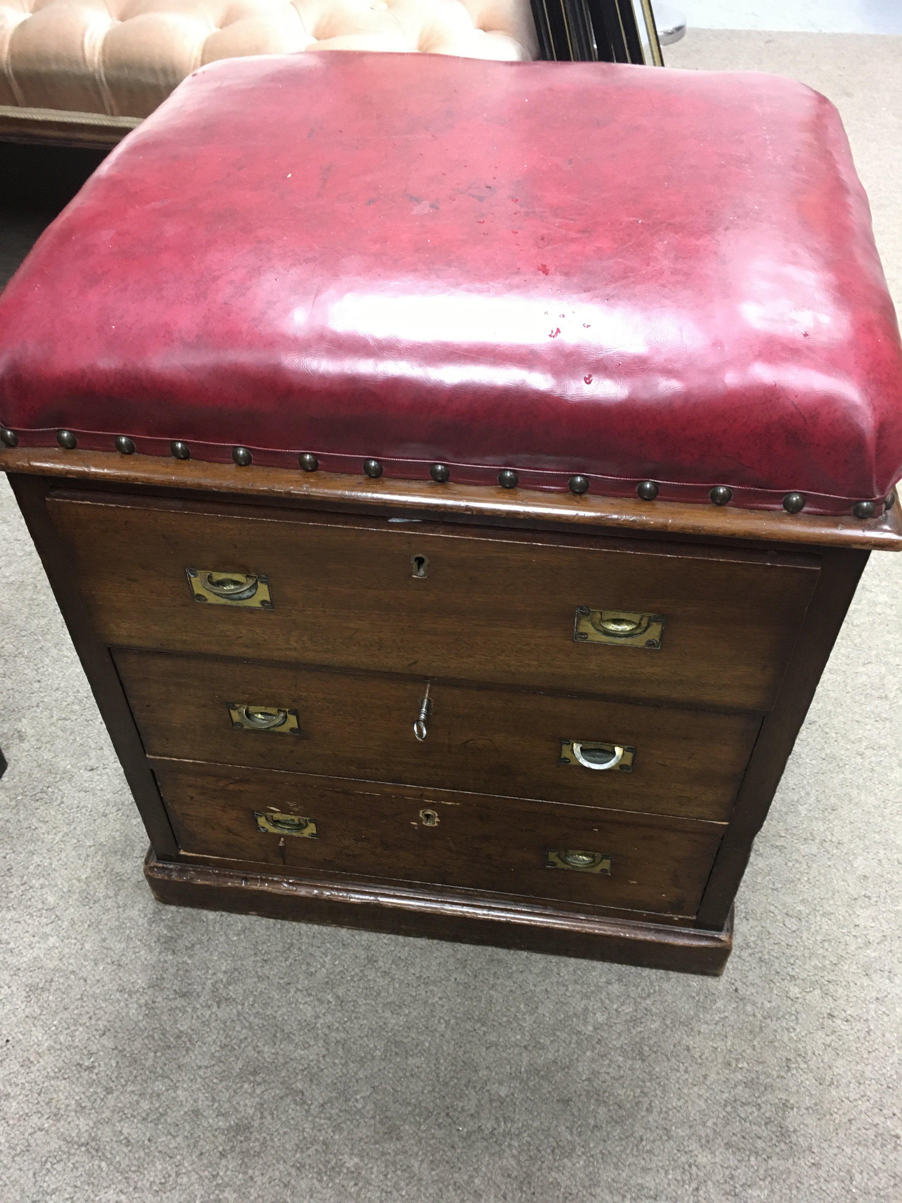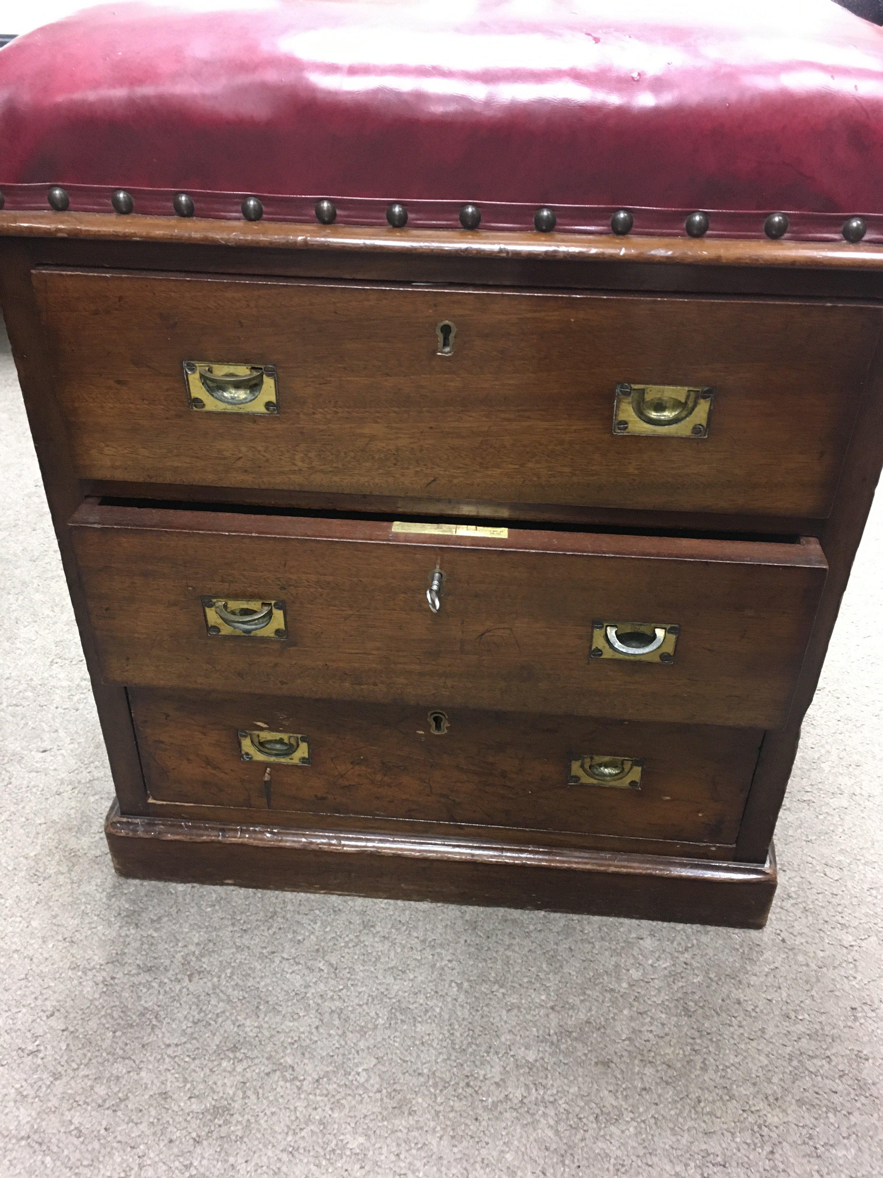 A Unusual small campaign style three drawer gun chest with red Leather seat