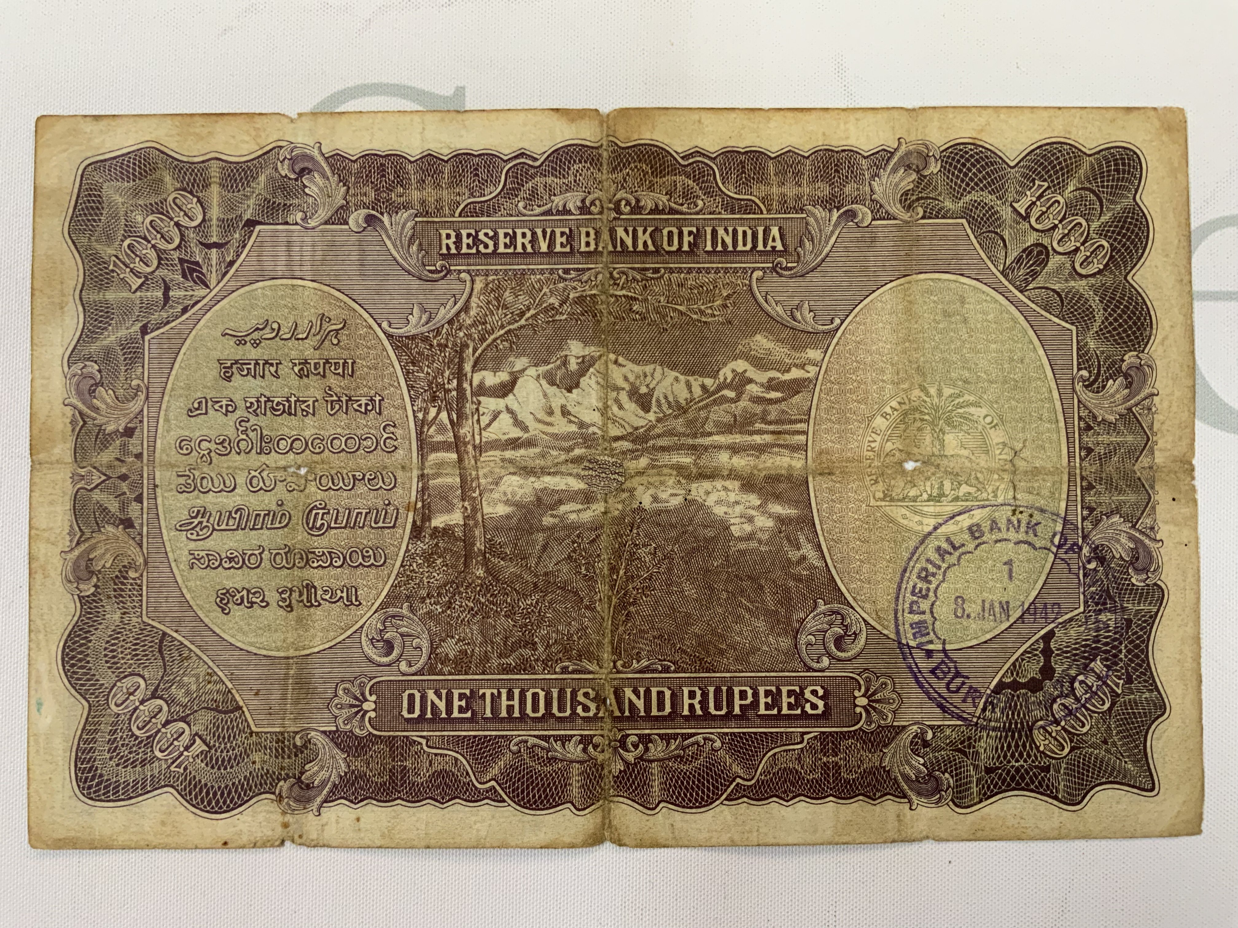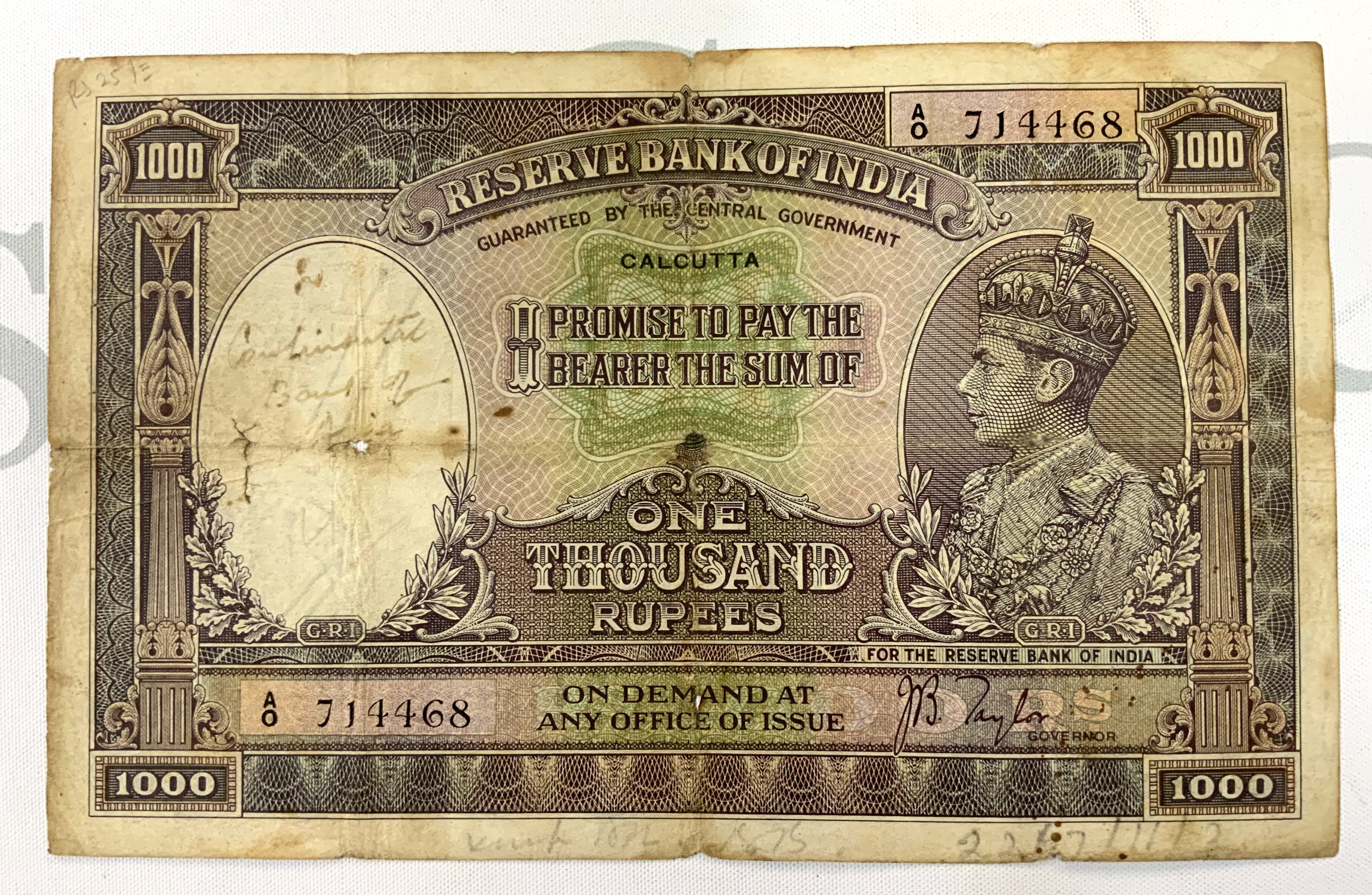 Reserve Bank of India, 1000 rupee, ND (1937), Calcutta, serial number A/O 714468, purple, green and lilac, crowned head of George VI at right, Taylor signature, discolour, hand writing and Printed stamp to reverse