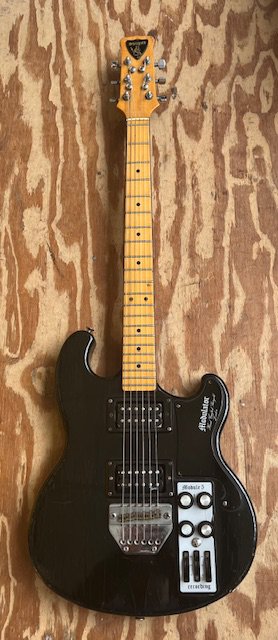 A 1975 Shergold Modulator Guitar with No 5 Recording Module in Cavity. Changed pickups one Parker pickup, Fair to Good condition overall with some playwear and crazing to paint consistent with age and use.