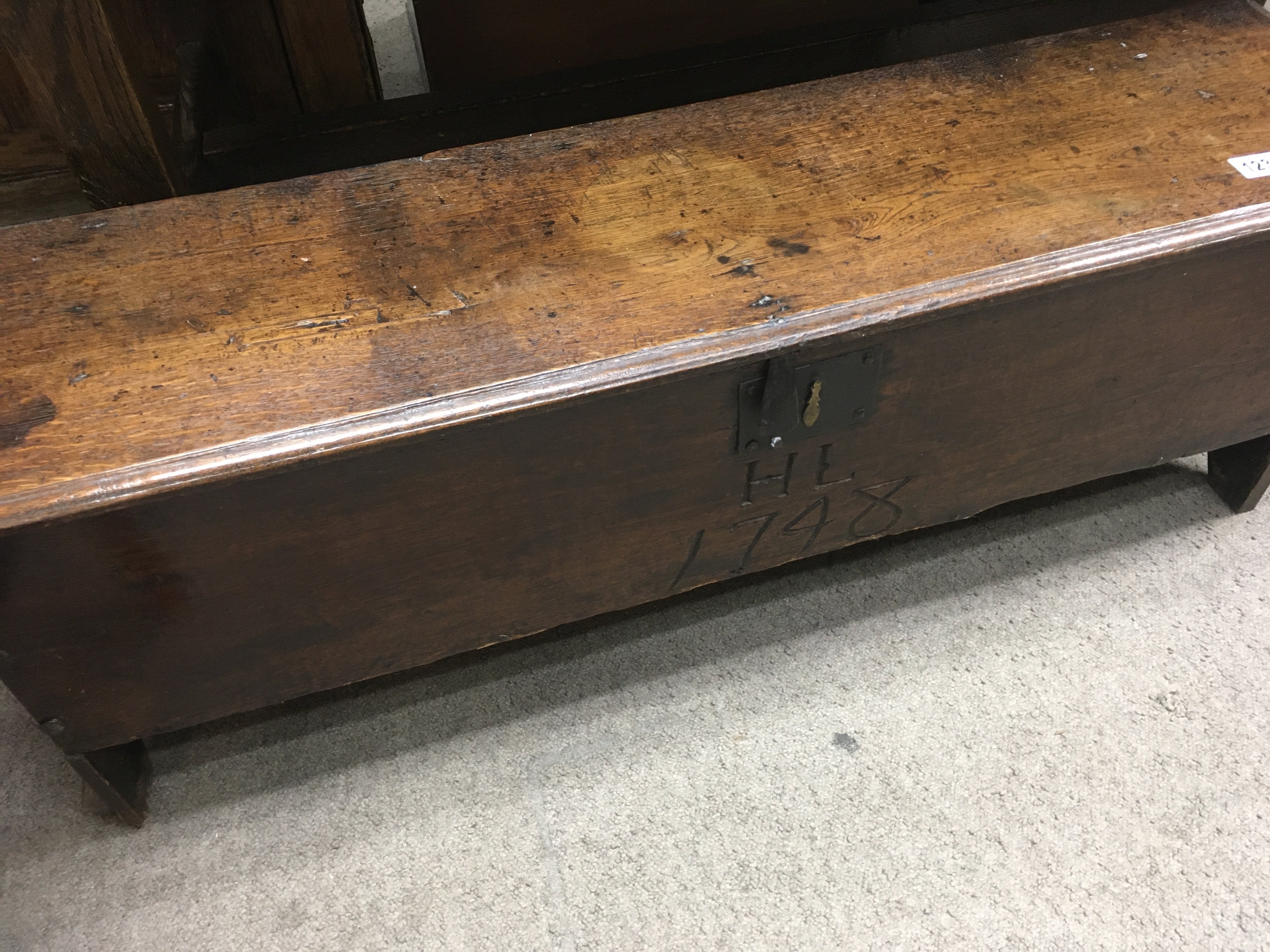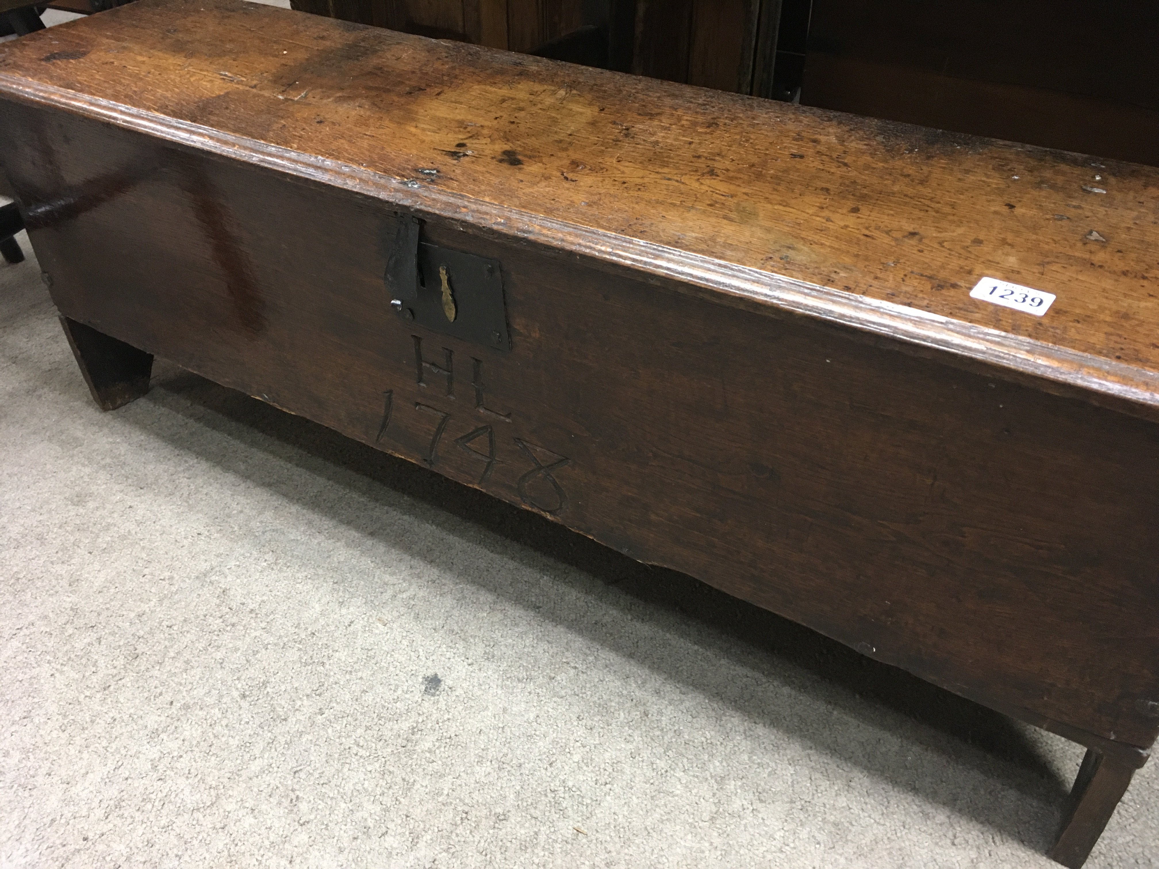 A oak coffer , shepherd’s chest the regular lid above a carved front Dated 1748 .