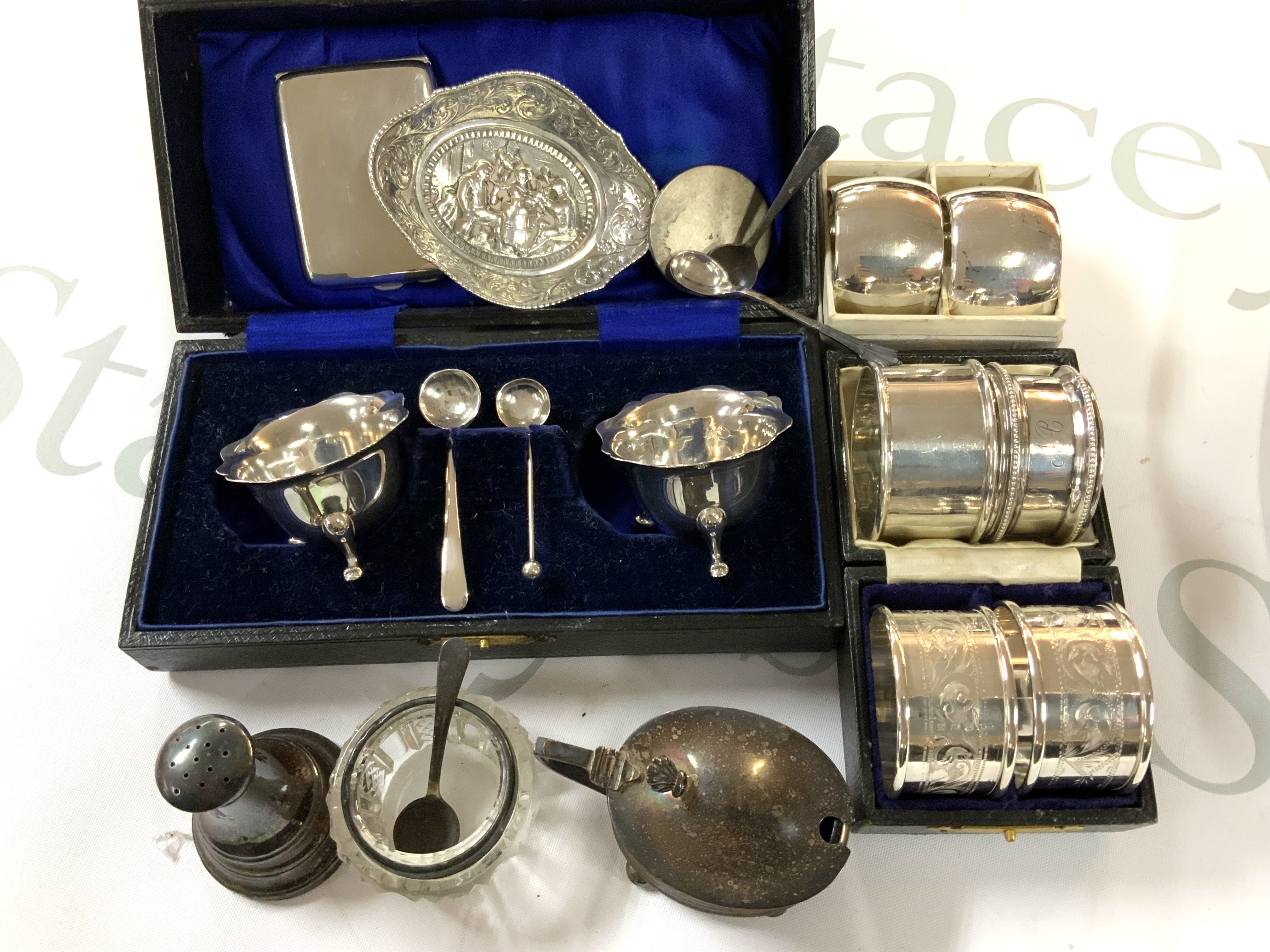 A small collection of hallmarked silver salts and napkin rings. (B)