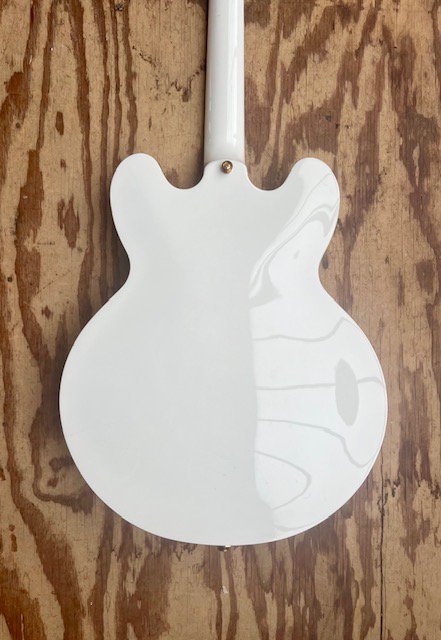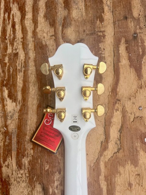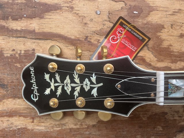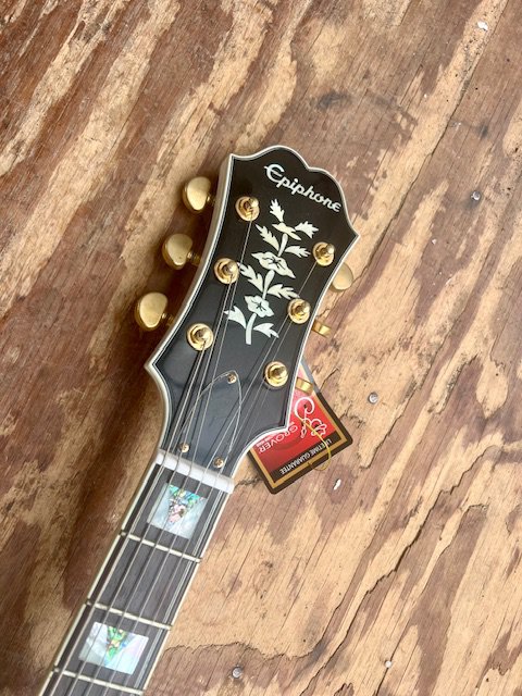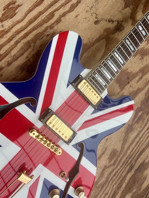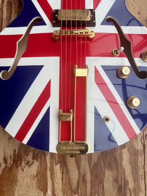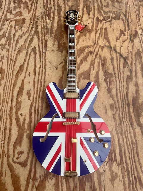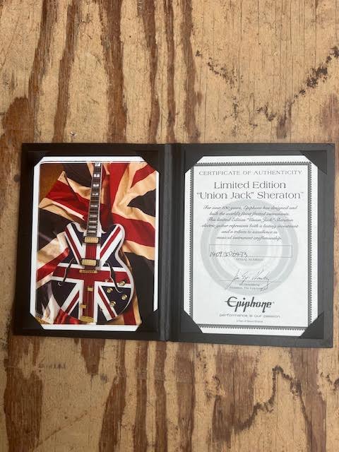 A 1998 Epiphone Sheraton First Run Dot Union Jack Electric Guitar forerunner of the Noel Gallagher Supernova in unplayed condition with hang tags, plastic still on pickup certificate of authenticity and Epiphone grey small logo case.