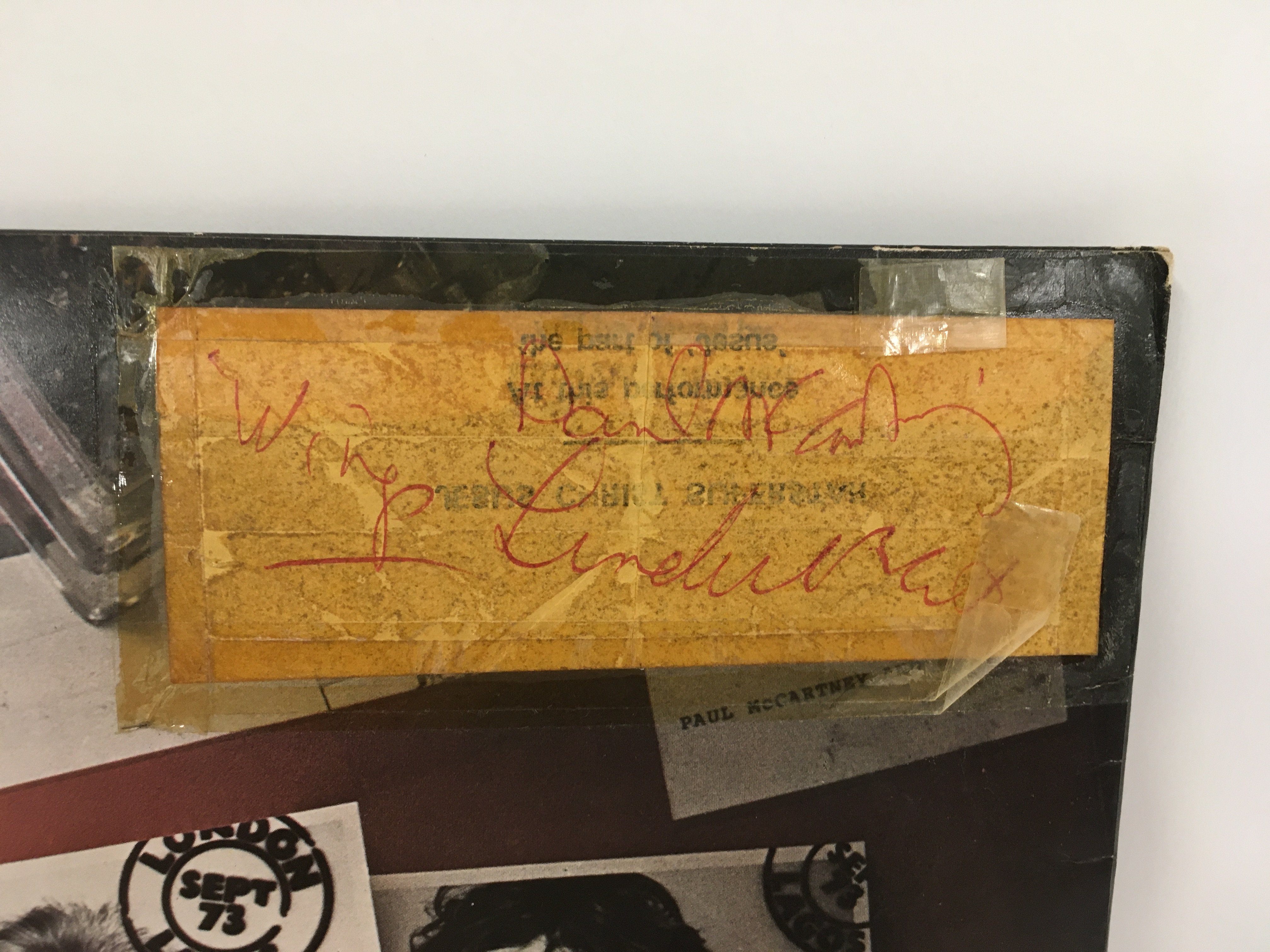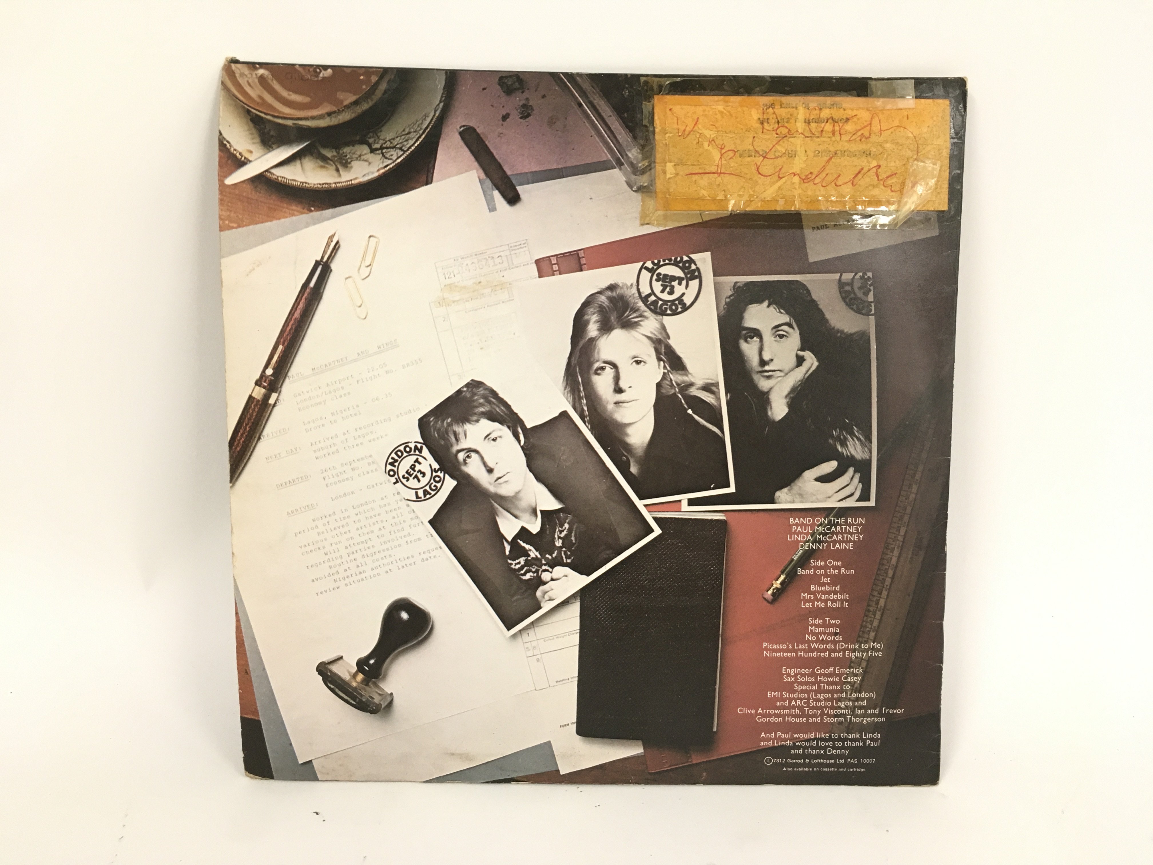 A copy of 'Band On The Run' by Wings with Paul and Linda McCartney's autographs attached to the reverse. Provenance from the vendor as follows. I was at school at Appleton in Benfleet and Mr Hammond our drama teacher took my class on a school trip to Jesus Christ Superstar at the Palace theatre It was my first school trip and my first visit to a London musical. I think it was in 1973 at the start of the Autumn term In the theatre and one of the actors was replaced by an understudy and a paper slip was put in the programme. In the interval we all went up to the bar and I spied Paul and Linda sitting at a table enjoying a drink I went across and asked if they were Paul and Linda McCartney and if they were could I have an autograph. None of the rest of my group noticed who they were and actually no one else was bothering them. They were incredibly kind and they sat me down, bought me a lemonade and found the slip in my programme which they both signed. Paul told me all about his new band that he had called Wings and that in a few months there would be an album out called Band on the Run. Linda told me that is was very healthy to be Vegetarian and that she never ate meat. Paul was dressed in a very smart pale blue suit and Linda was in a Kaftan in more muted shades. They were incredibly nice kind and polite to me. The album came out in the December and I bought it immediately. I loved it and I stuck the autographs to it and that's where they have been ever since. I never did like like Linda's veggie sausages though which I also dutifully tried when they came out many years later.