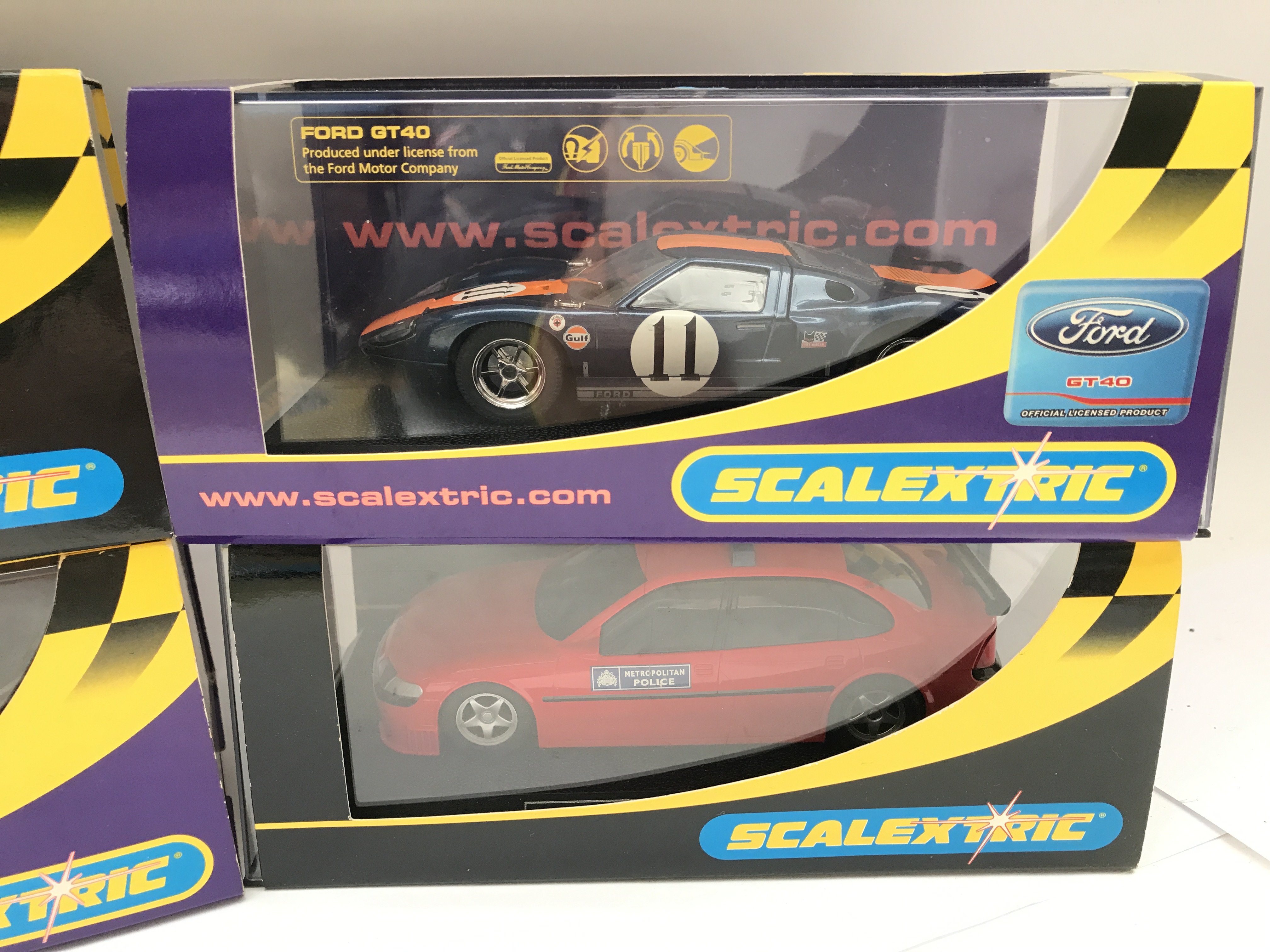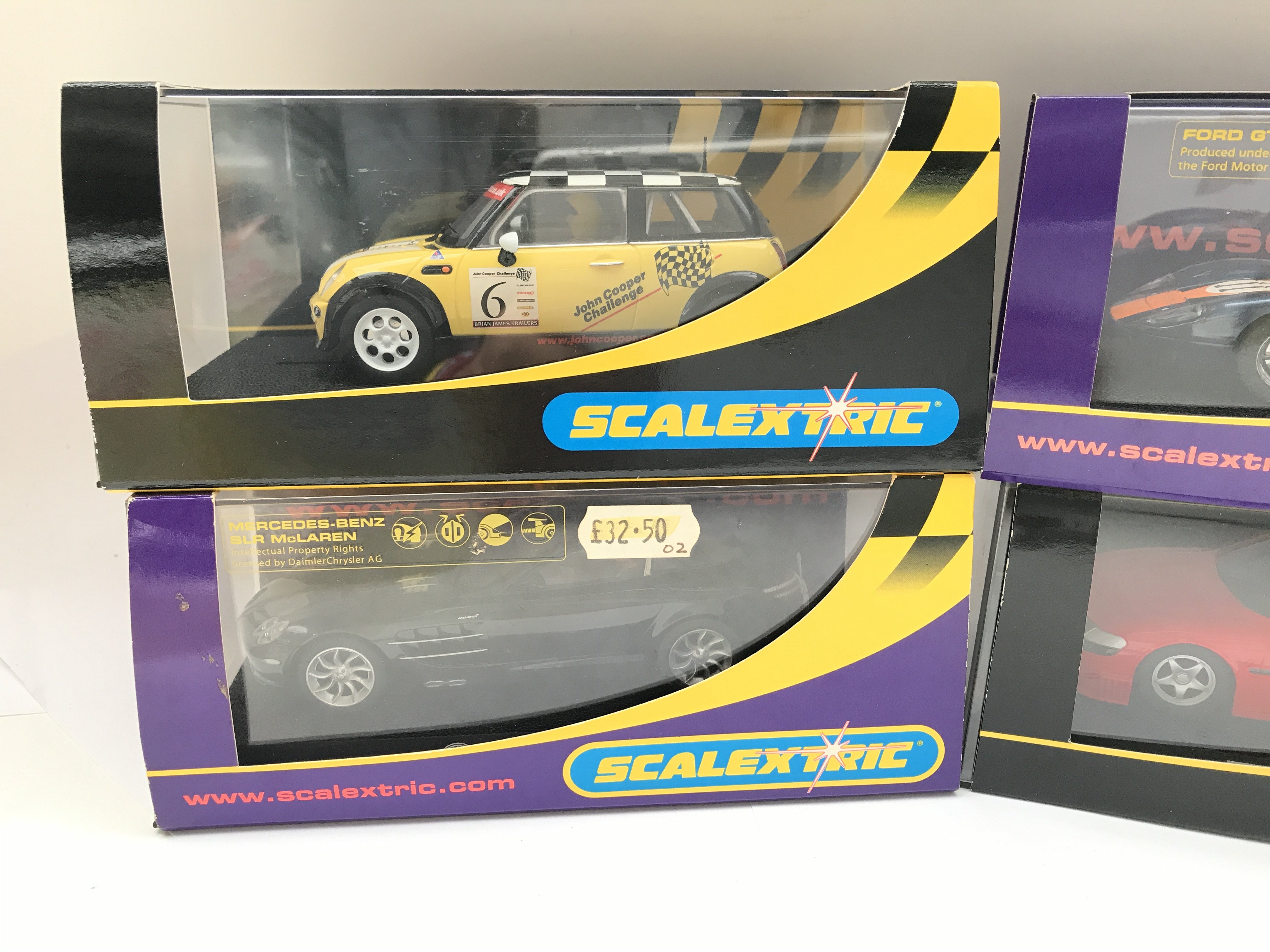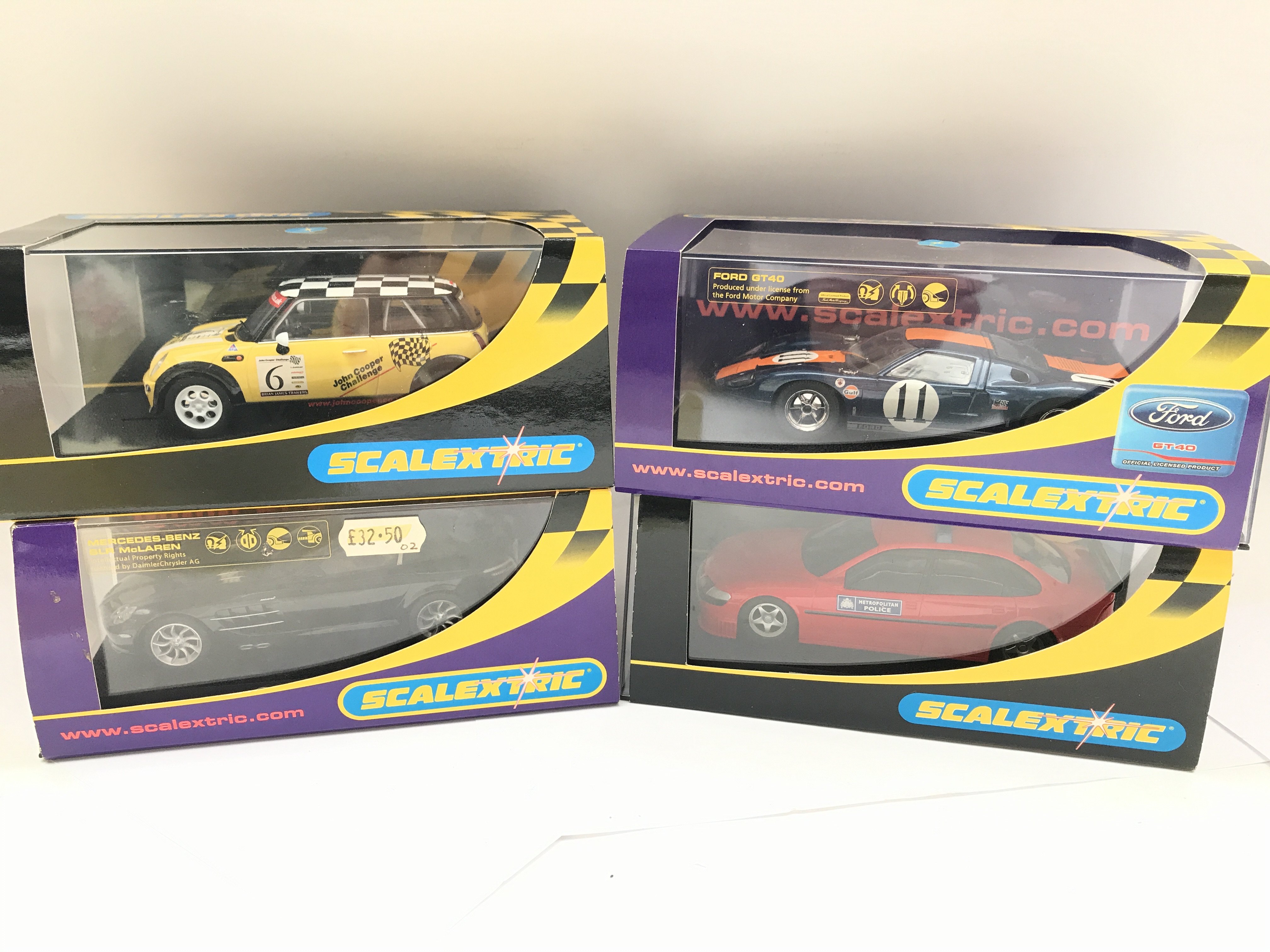 4 X Boxed Scalextric Cars. A Mini Cooper. A Mercedes-Benz SLR McLaren. A Ford GT40 and a Vauxhall Vectra.