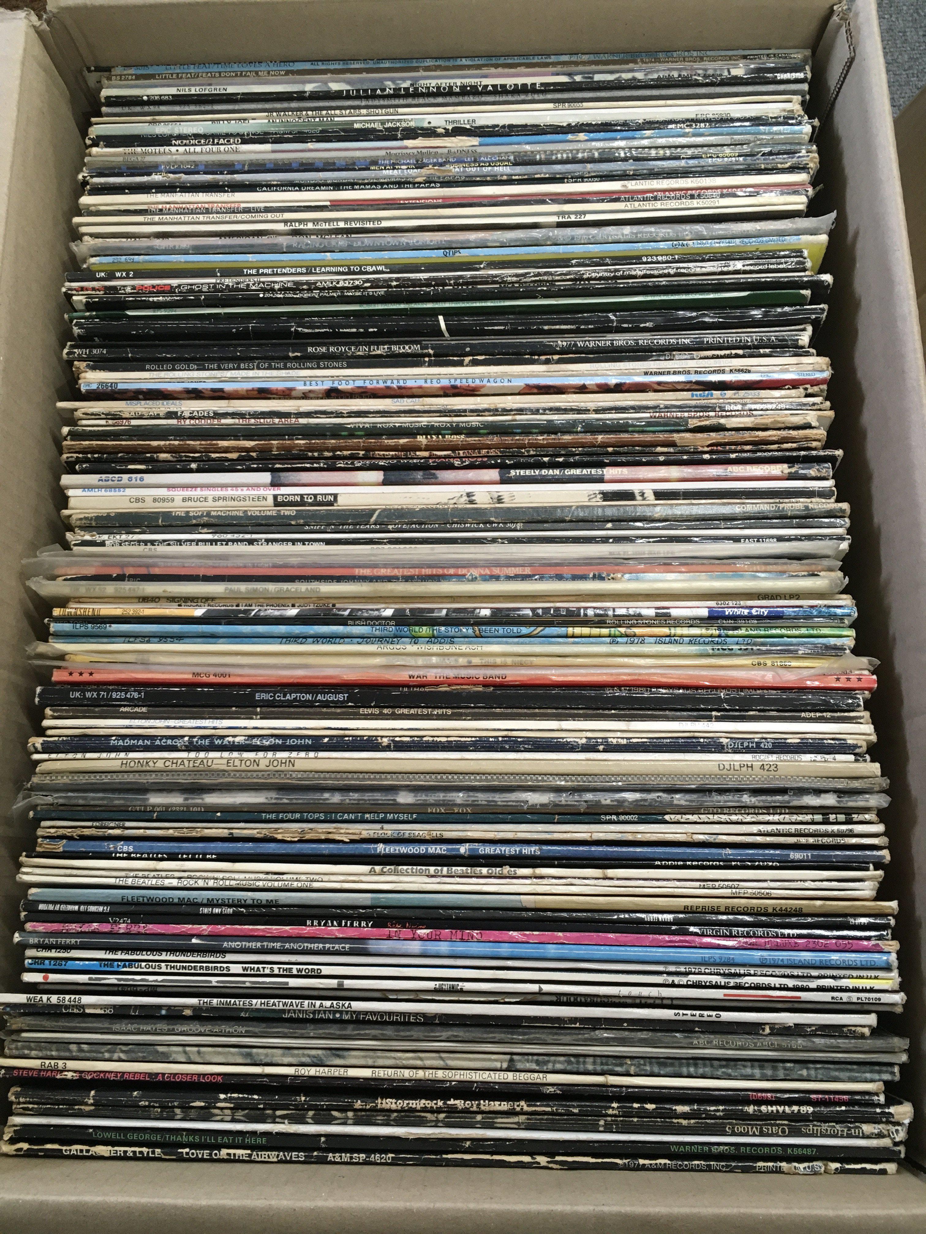 A box of LPs and 12" singles by various artists including The Beatles, Steely Dan, Soft Machine and many more,