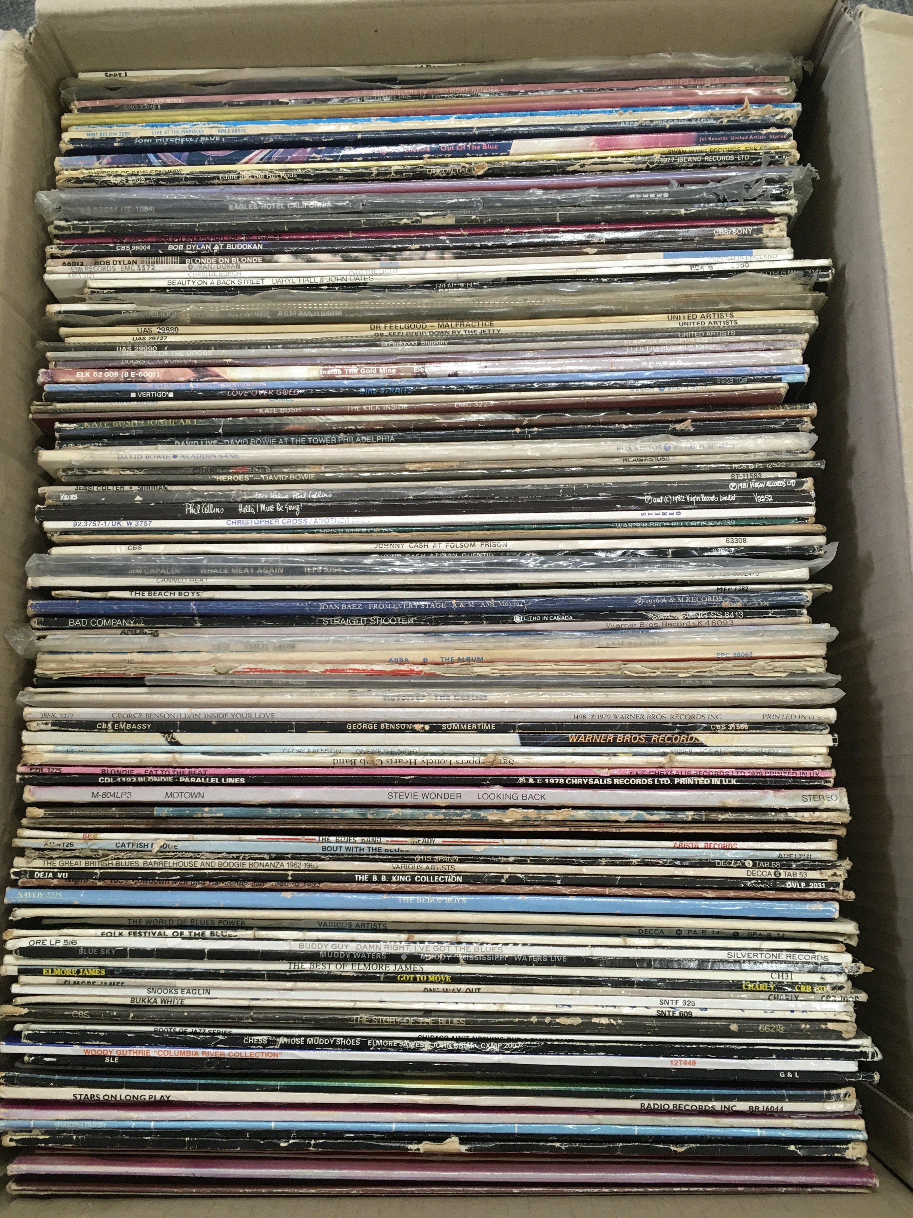 A box of LPs and 12" singles by various artists including David Bowie, Kate Bush, The Damned and many more.