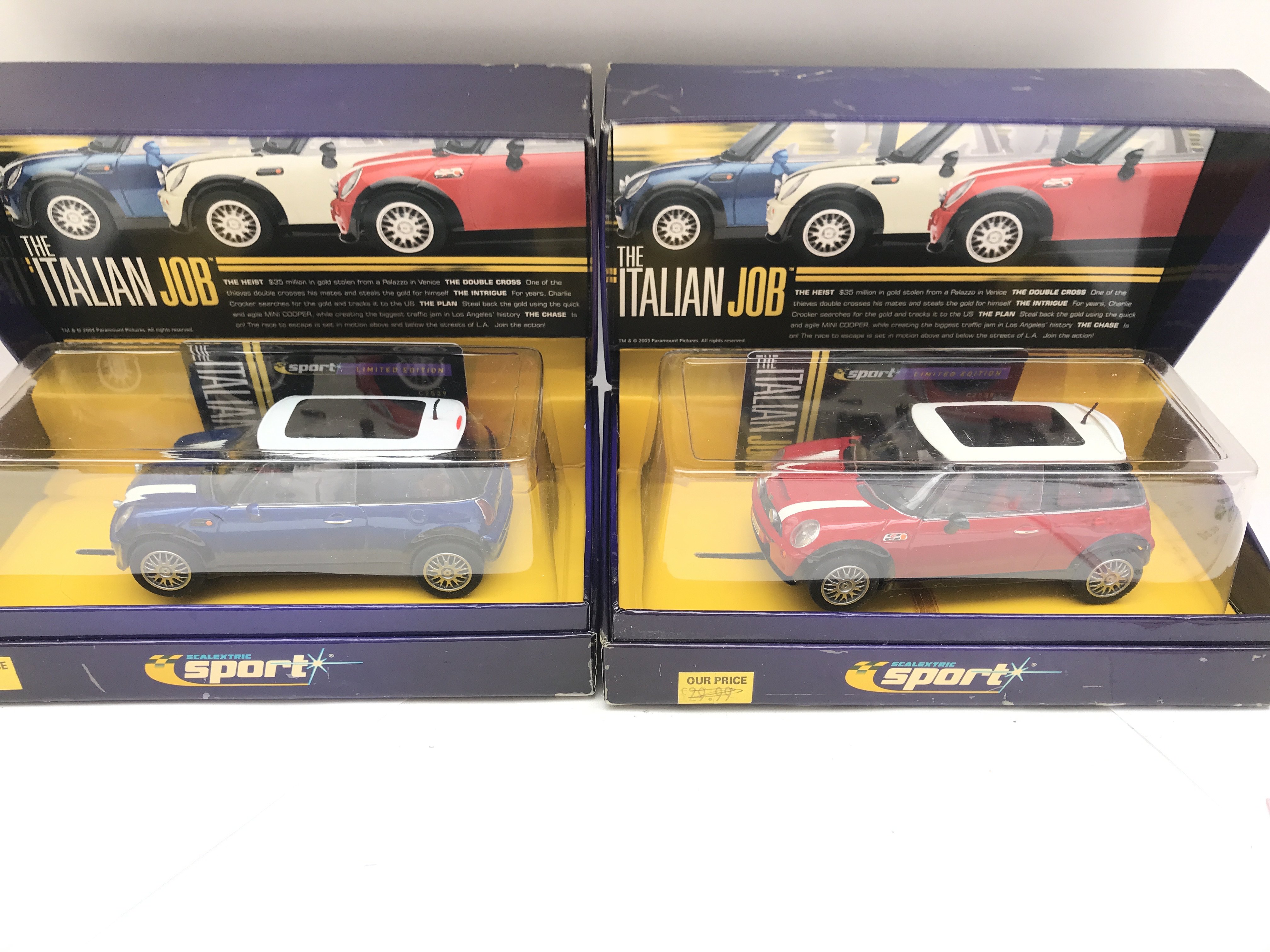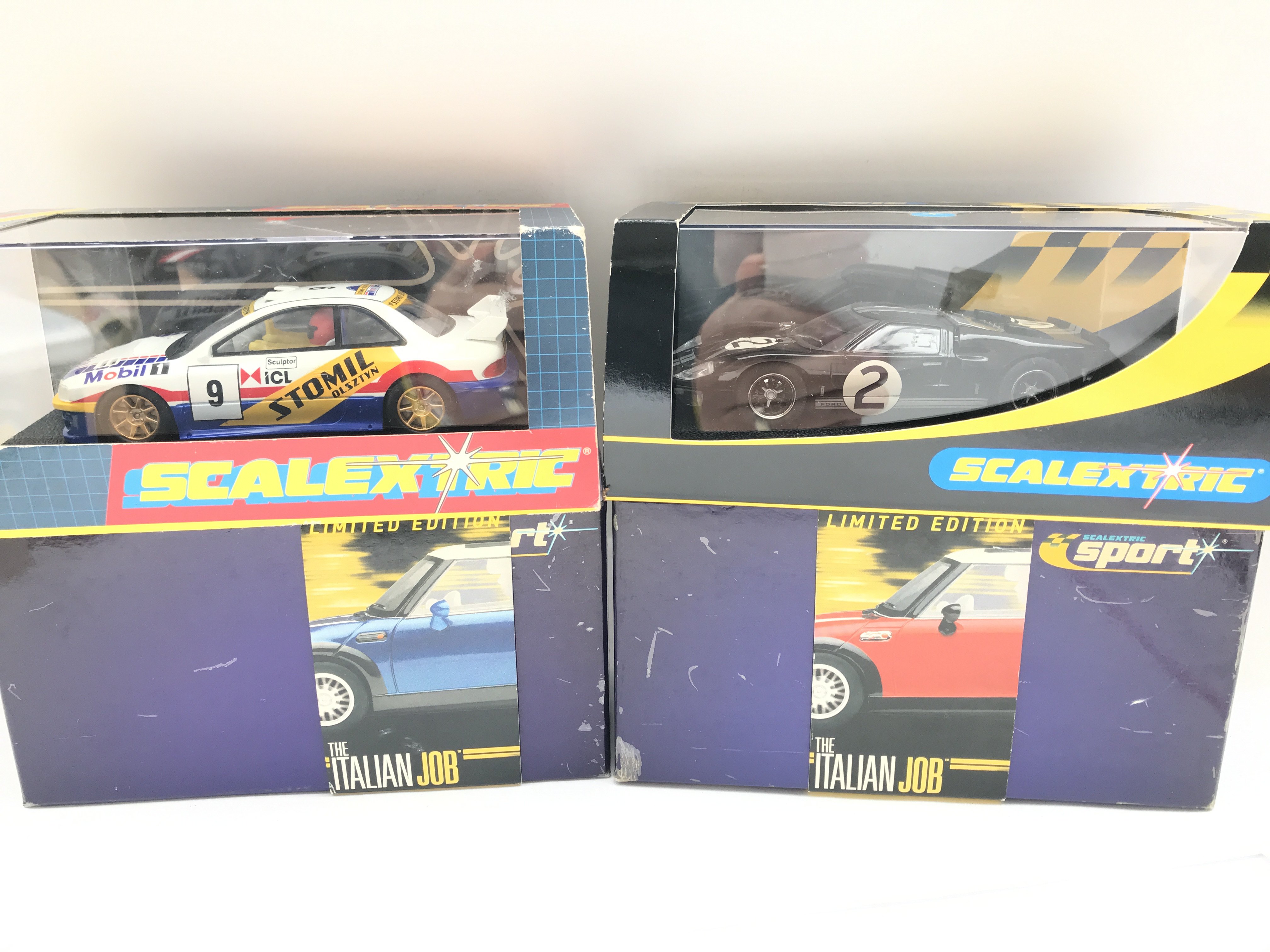 4 X Boxed Scalextric Cars. Including 2 Italian Job Minis. A Subaru Impreza and a Ford GT MK II.