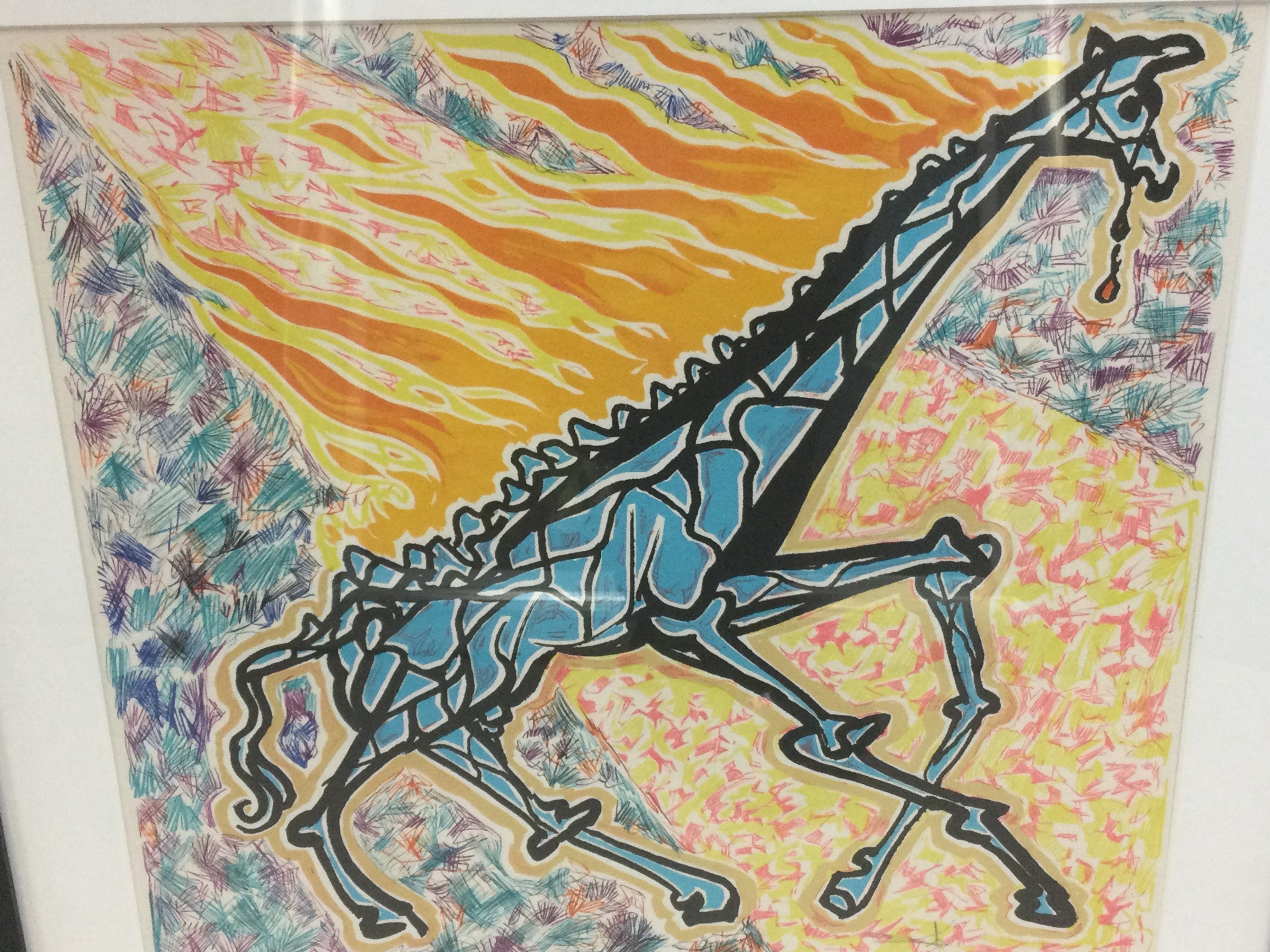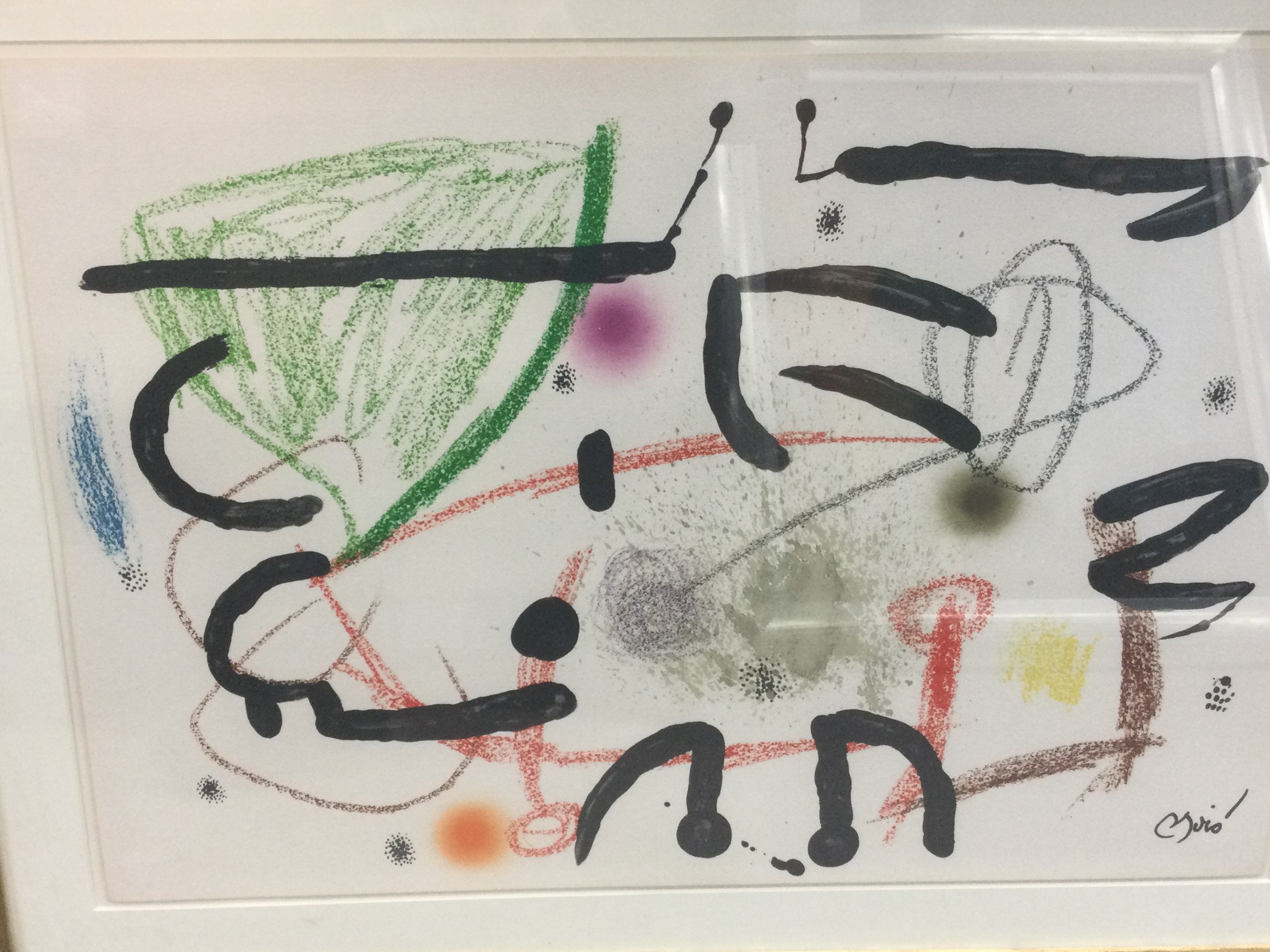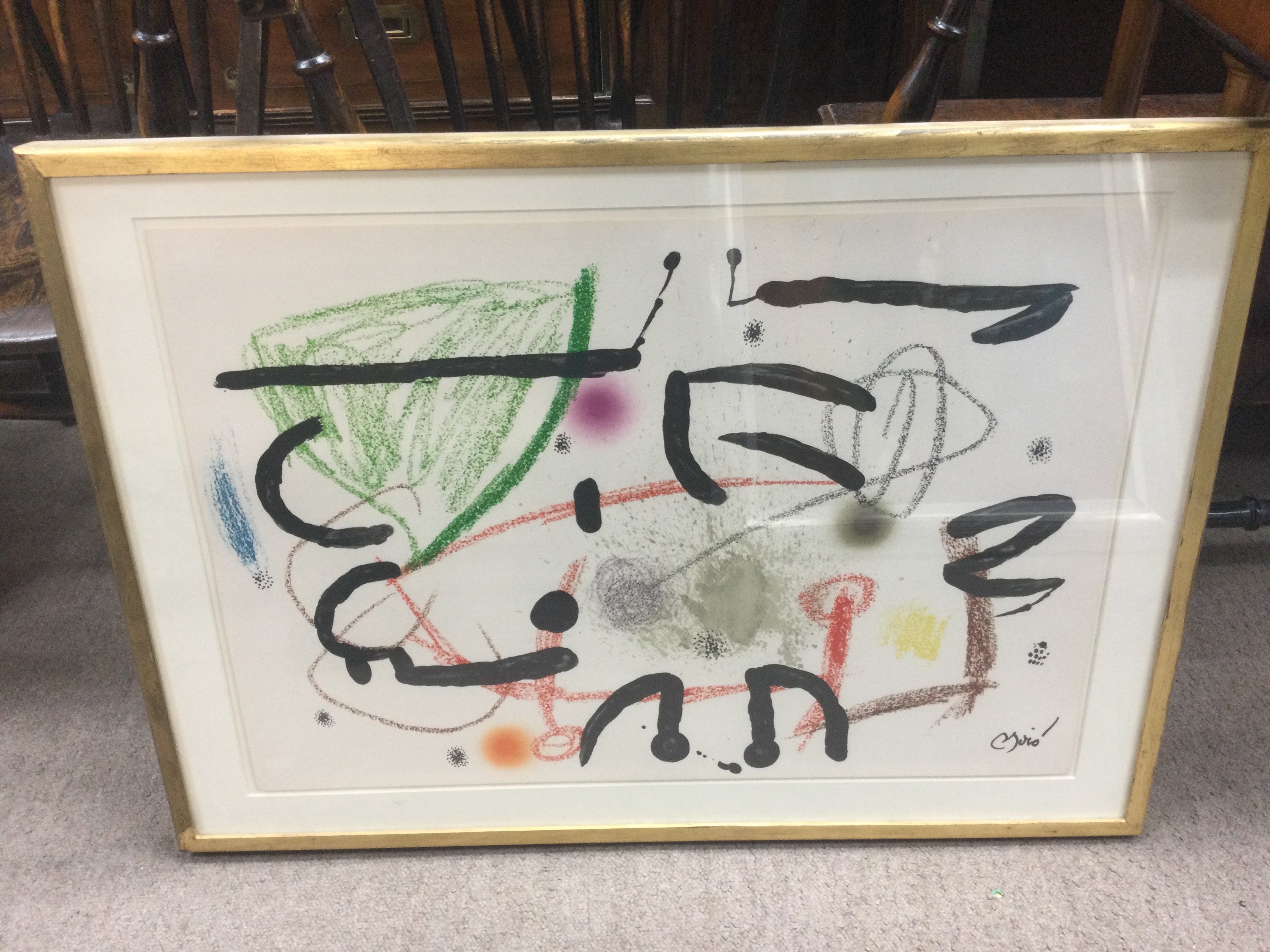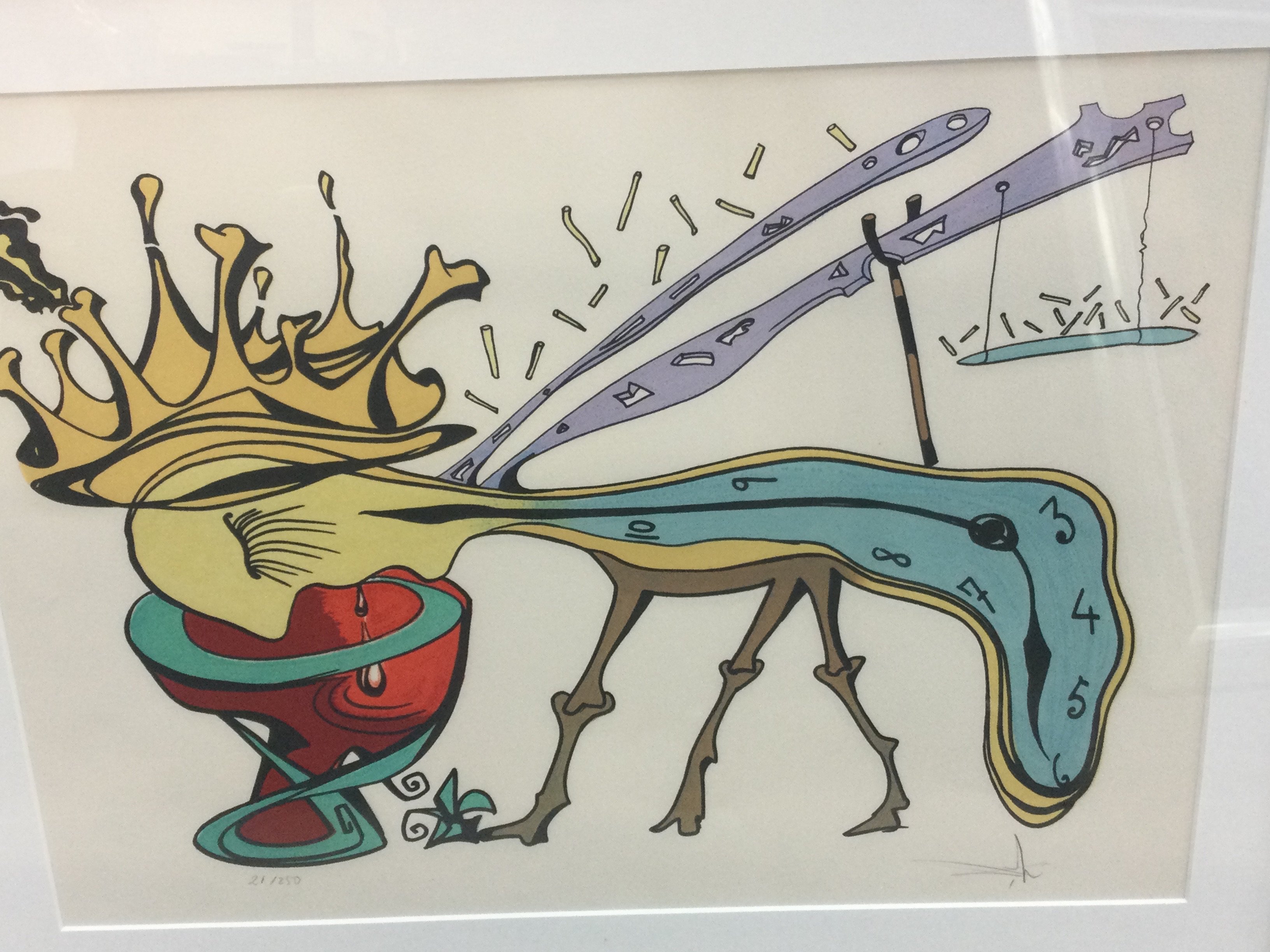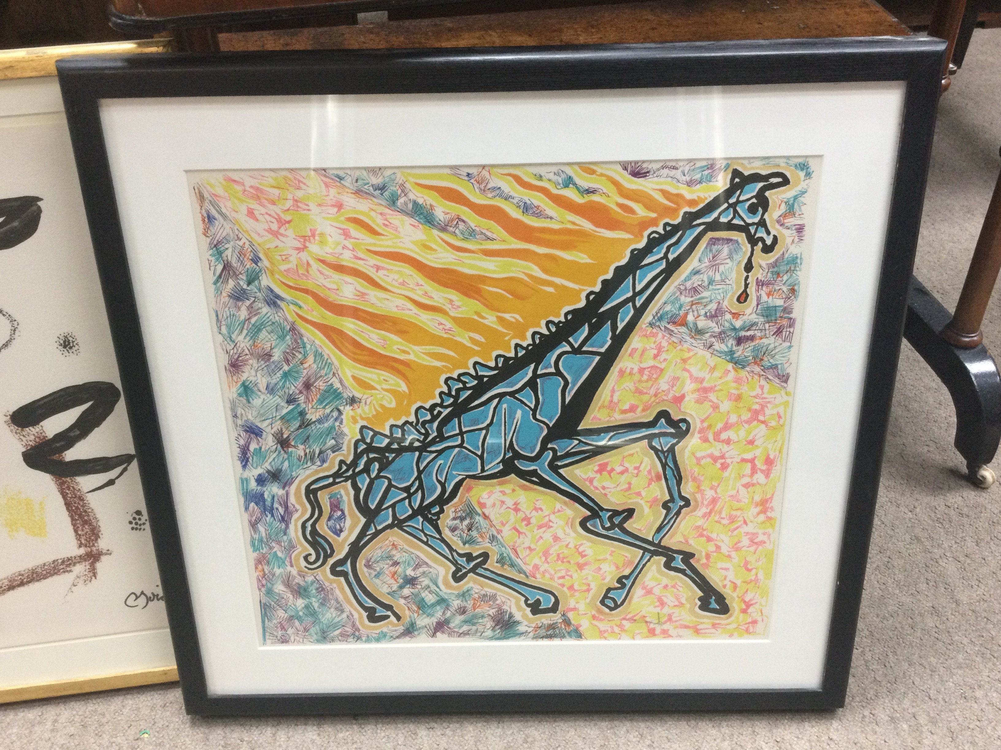 A collection of framed prints including a Joan Miro Wonders with aristocratic variation, Salvador Dali Royal Insect from Vitraux and Giraffe on fire. Dimensions 87x62, 75x59, 65x65cm. This lot cannot be posted