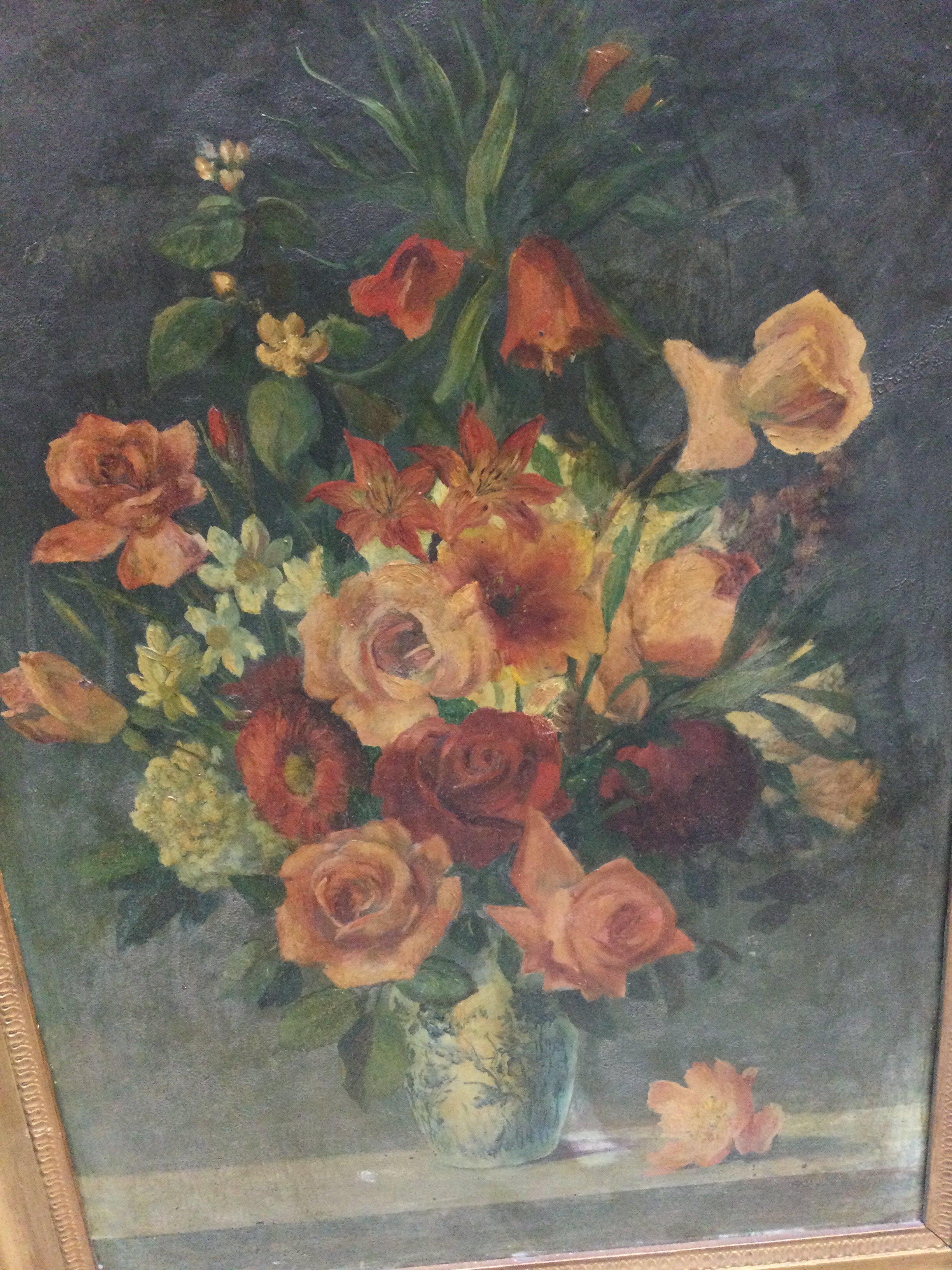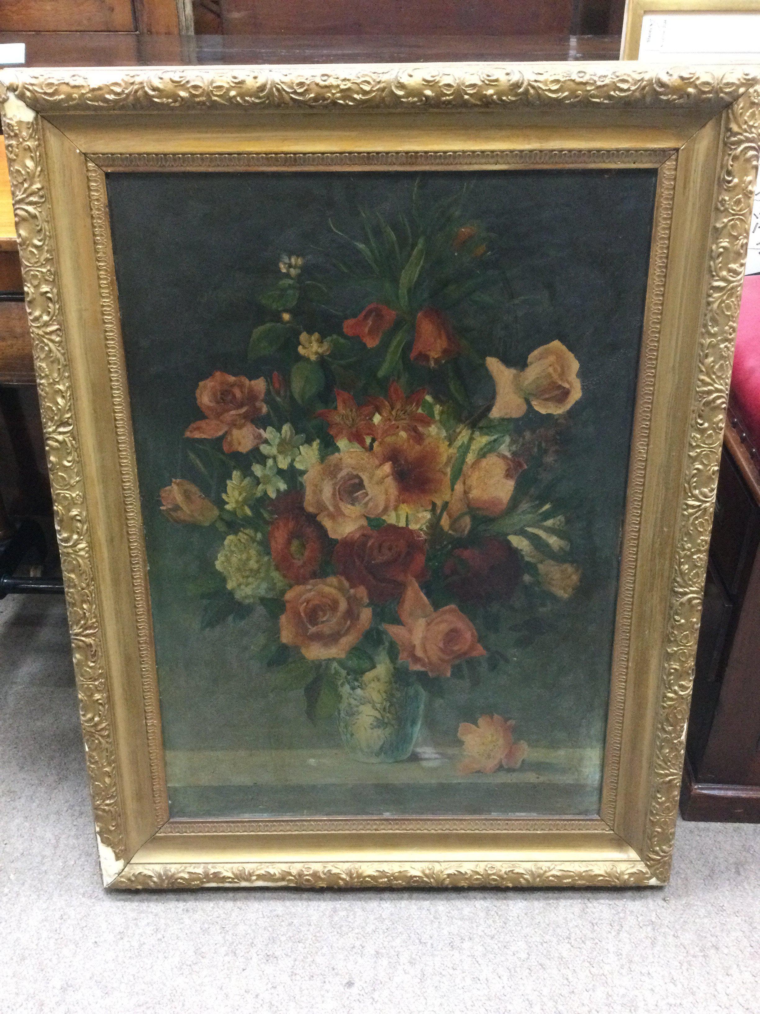 A gilt framed still life oil painting of a vase of roses, dimensions 67x88cm. This lot cannot be posted. No reserve