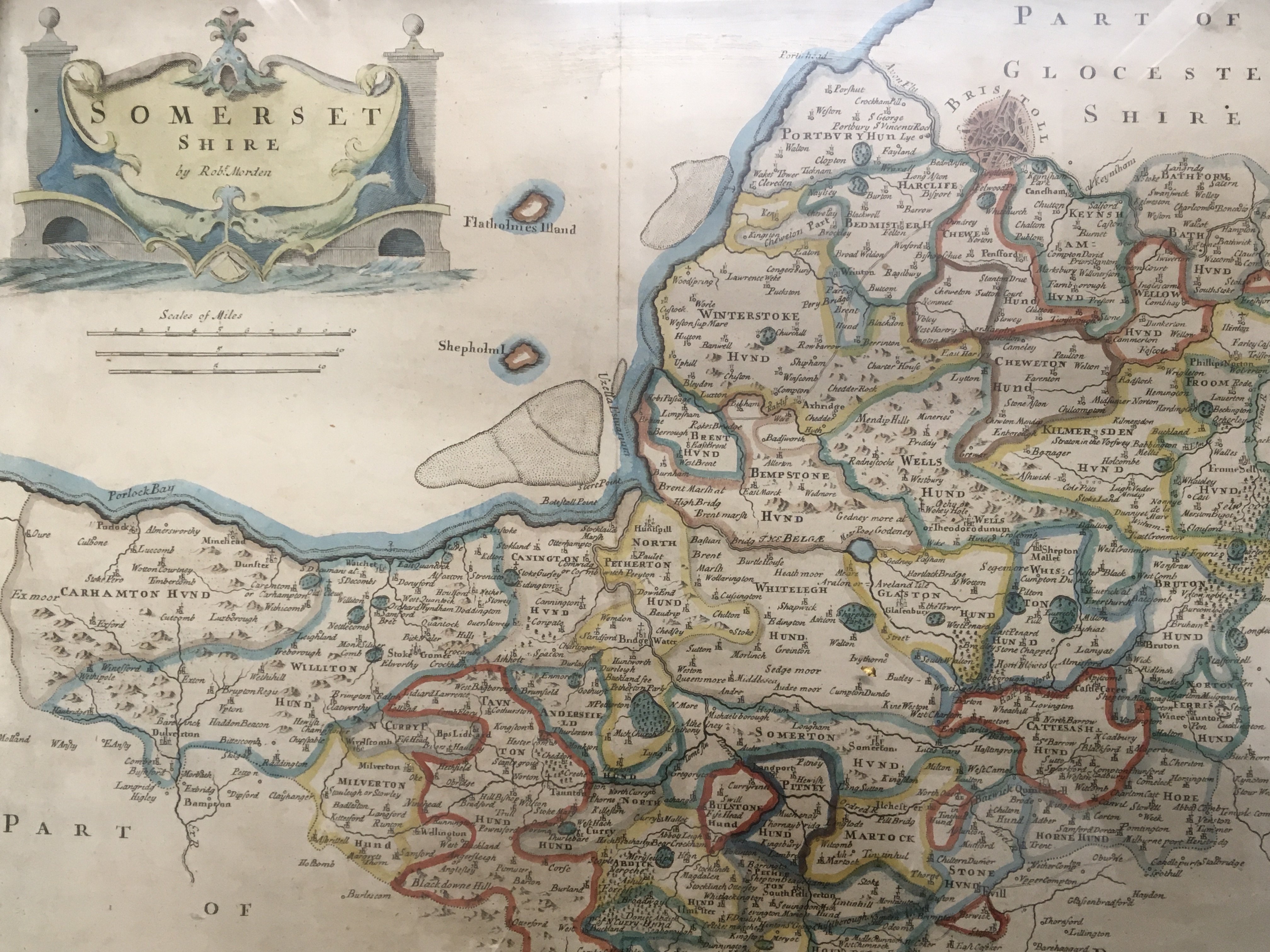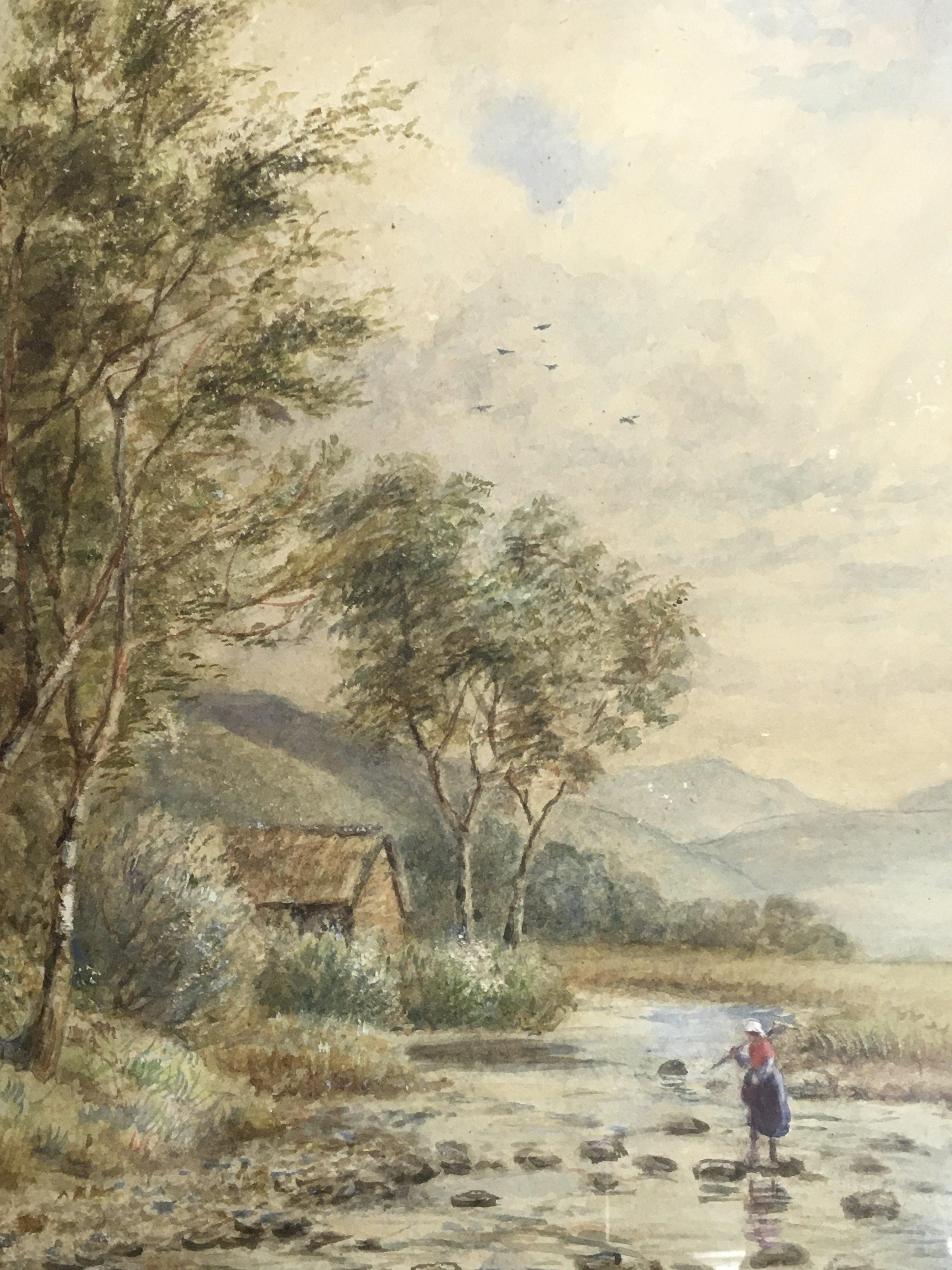 A framed Antique map of Somerset Shire by Rob Morden and two framed late 19th century watercolour study of flowers and a rural scene with a figure in a shallow river (3)