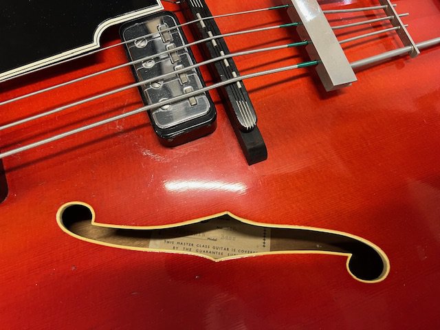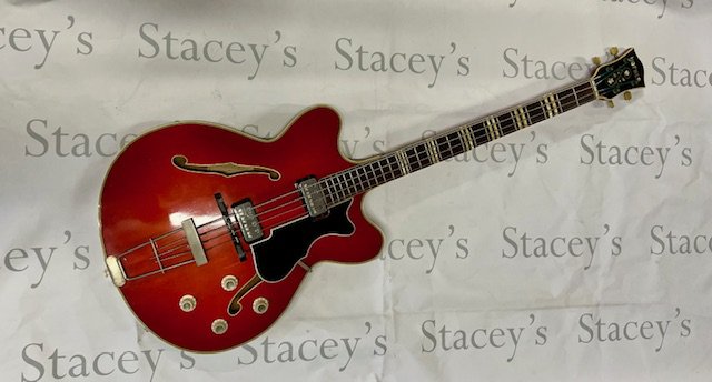 A 1964 Hofner Verithin Bass Guitar. Semi sold body with all original parts and finish, Label still in place and serial number is 316. Condition very good + overall consistent with age and use. Comes with original light oatmeal Hofner fitted case. Wear and marking to case outer, extensive wear to handle.