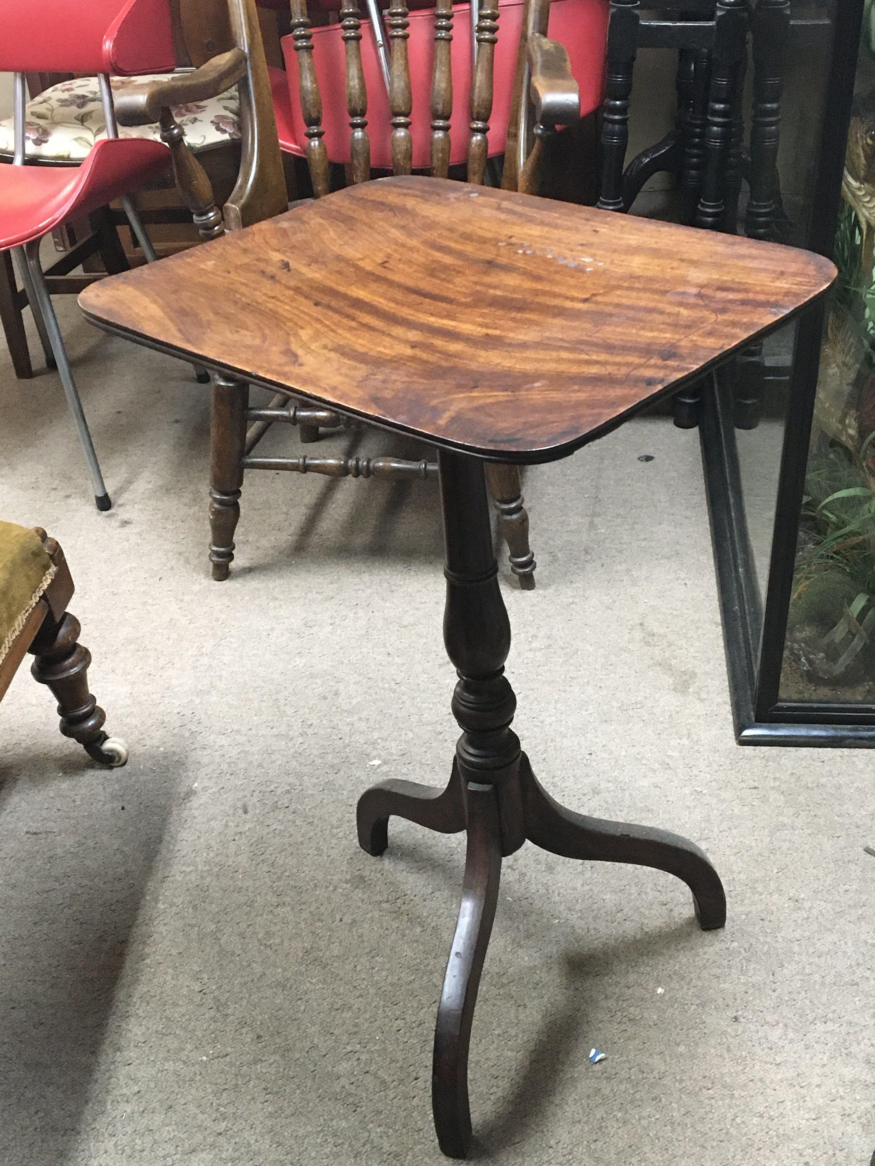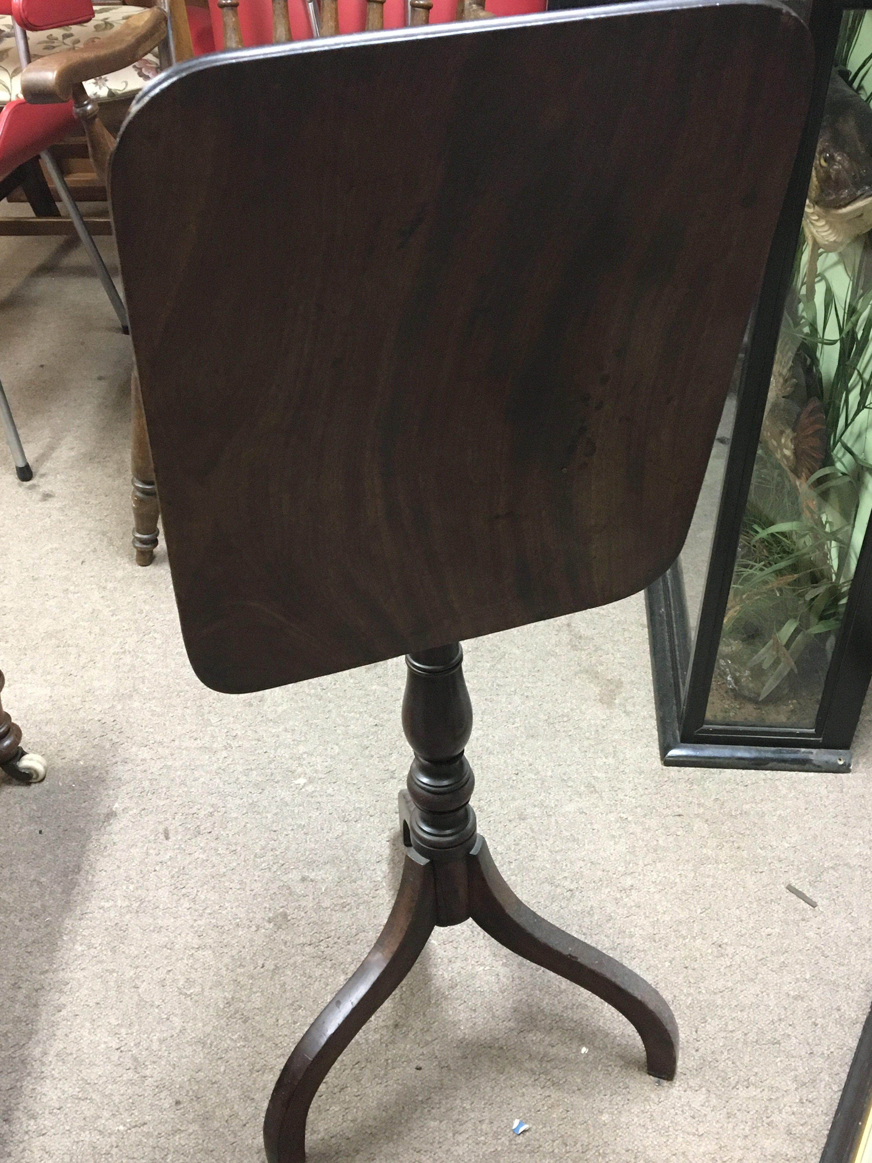 A George III mahogany occasional table with a hinged top on a turned column and splayed legs.