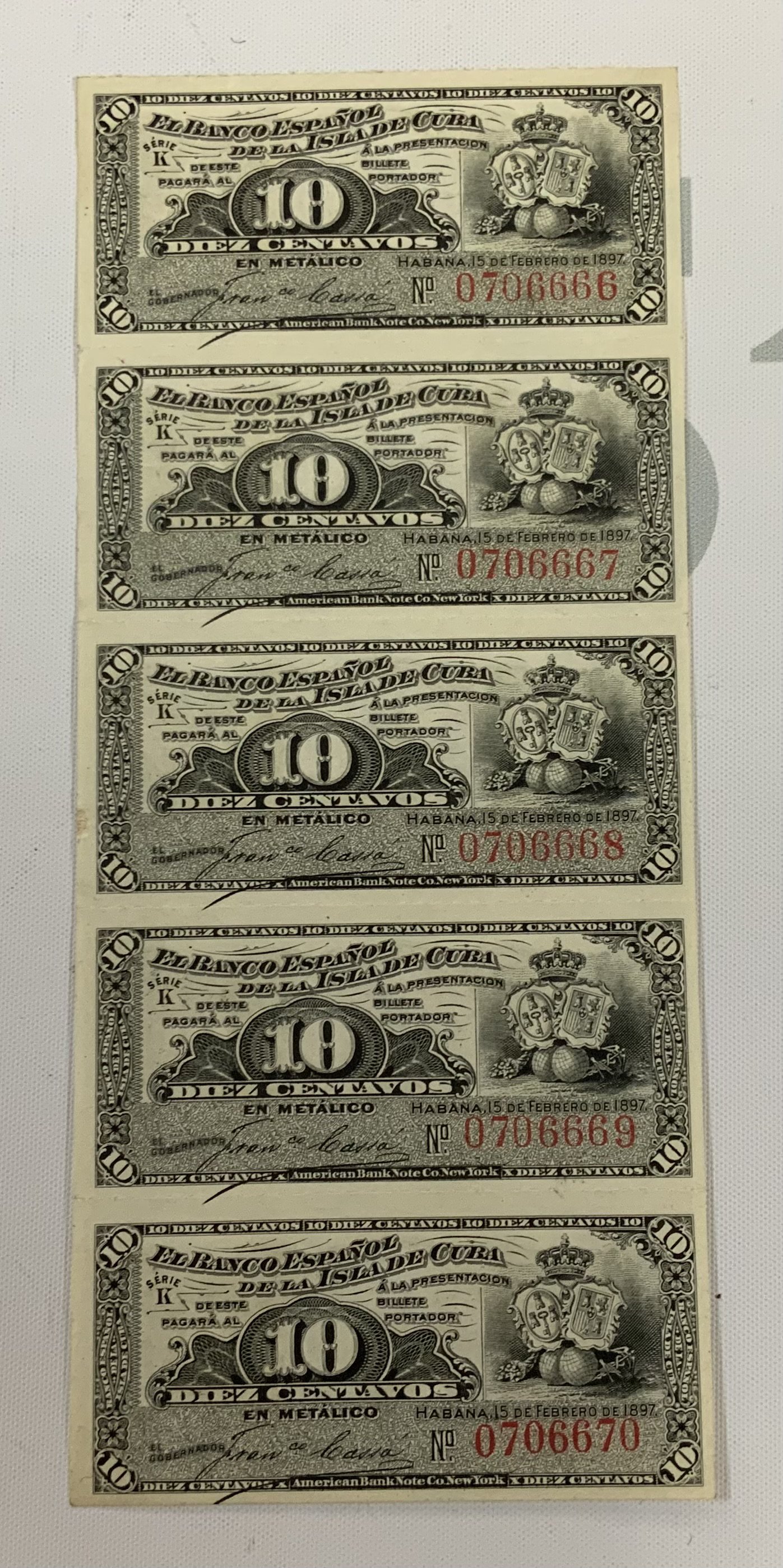 1897 El Banco Espanol FIVE Uncut Consecutive serial, 10 Ctvs. (A)