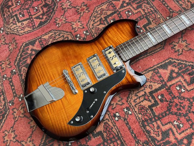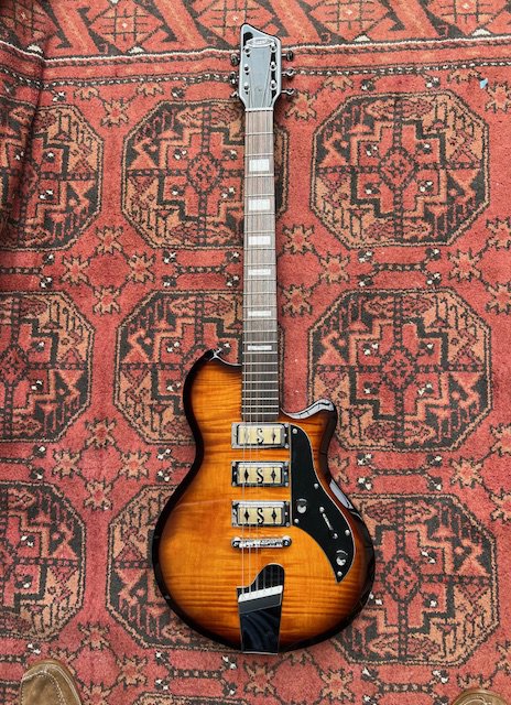 This is a Supro Hampton Flamed Maple Electric Guitar from 2017 in very good condition - largely unplayed with the factory plastic on the pickguard, the very light marking in the cutaways suggests very light playwear. Comes with Supro Branded GigBag