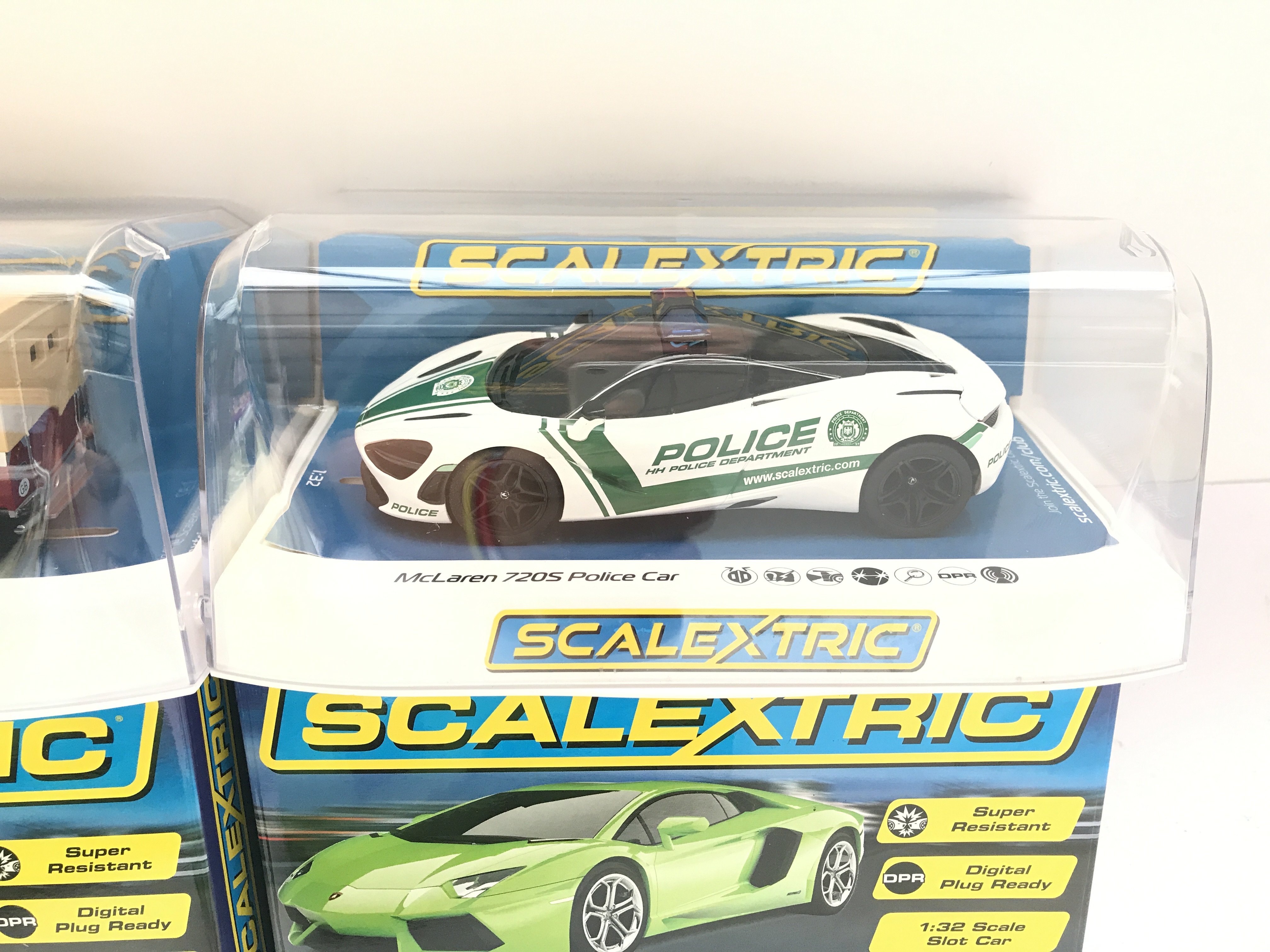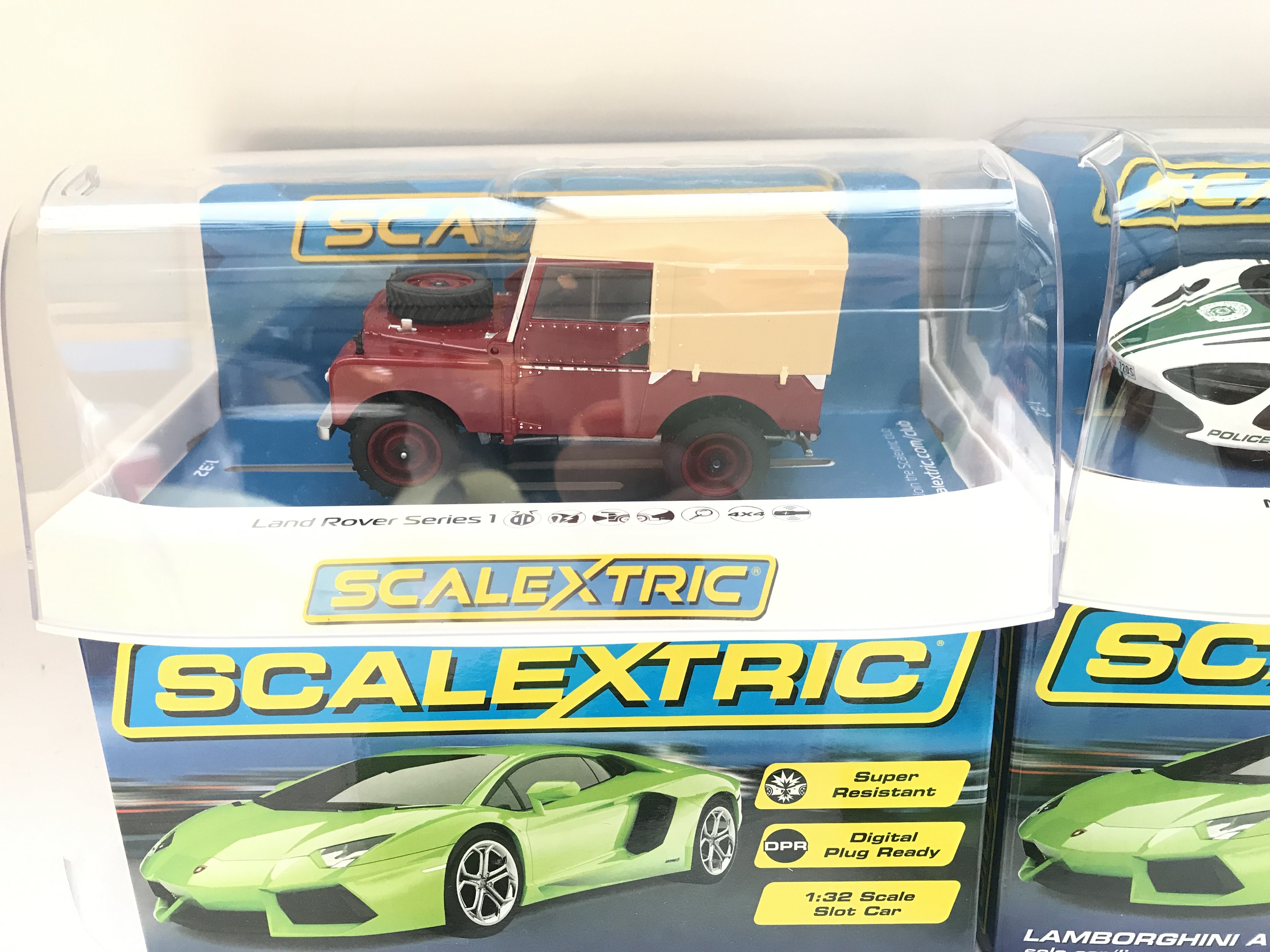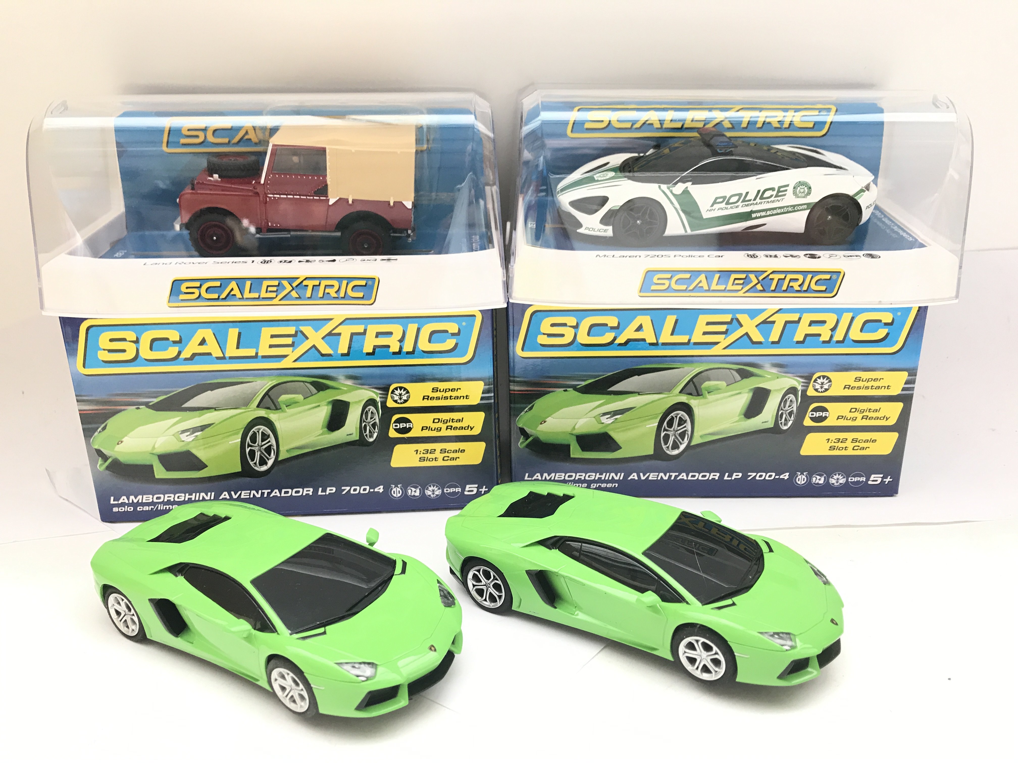 4 X Boxed Scalextric Cars. 2 X Lamborghini Adventador LP 700-4. A Land Rober Series 1 and a McLaren 720s Police Car.