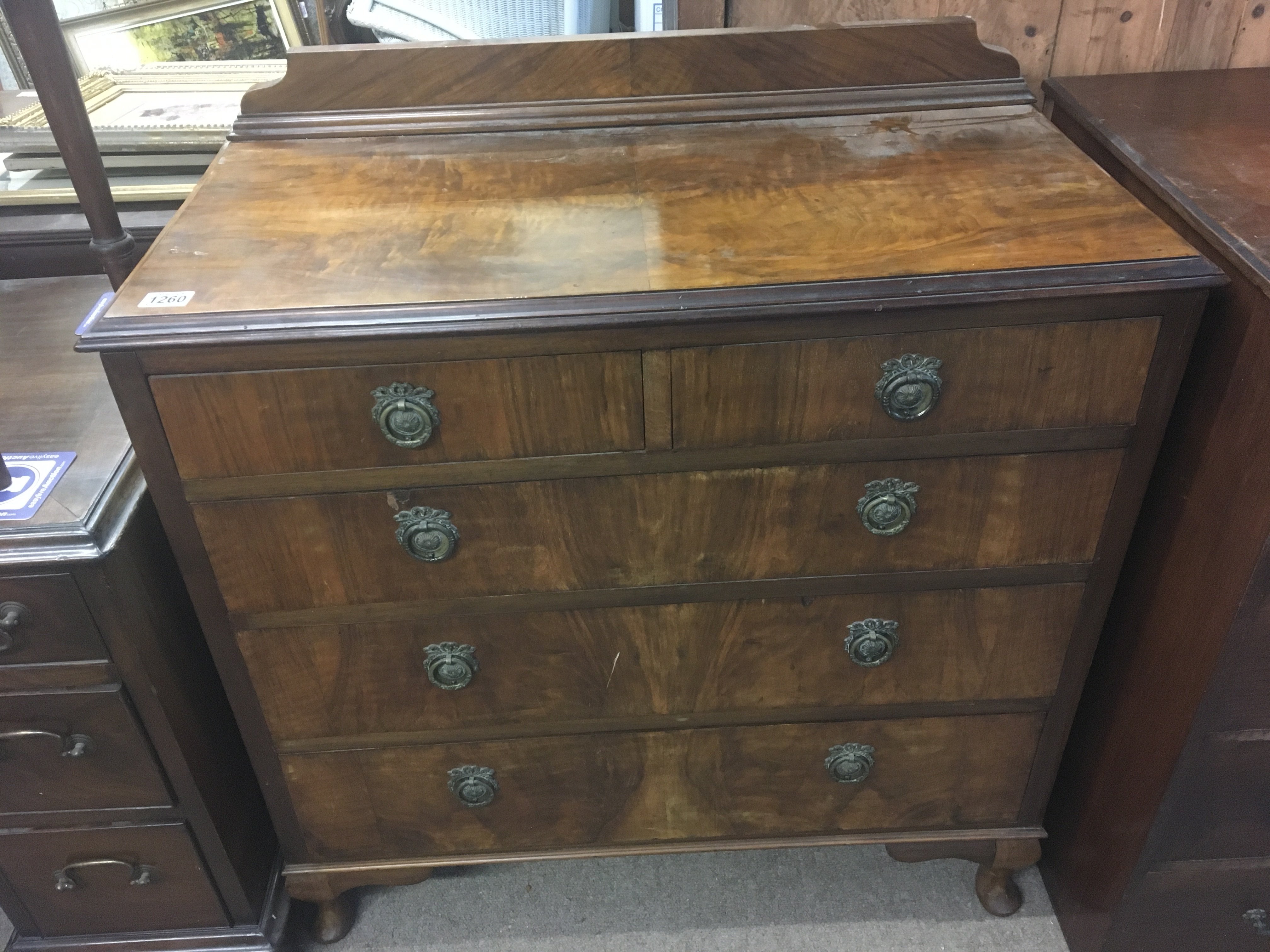 A walnut chest of drawers fitted with two short and three long drawers on small feet.