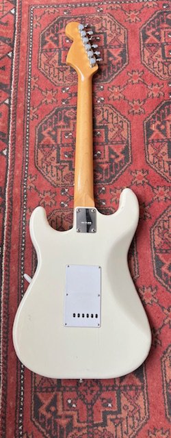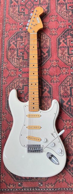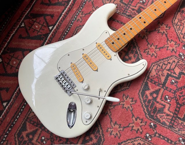 A 1970's CMI Lawsuit era copy of a Fender Stratocaster electric guitar in white with all original parts. Made at the Matsumoto Factory. Slight wear and damage to the vibrato arm tip otherwise in very good overall condition with play wear consistent with age and use.