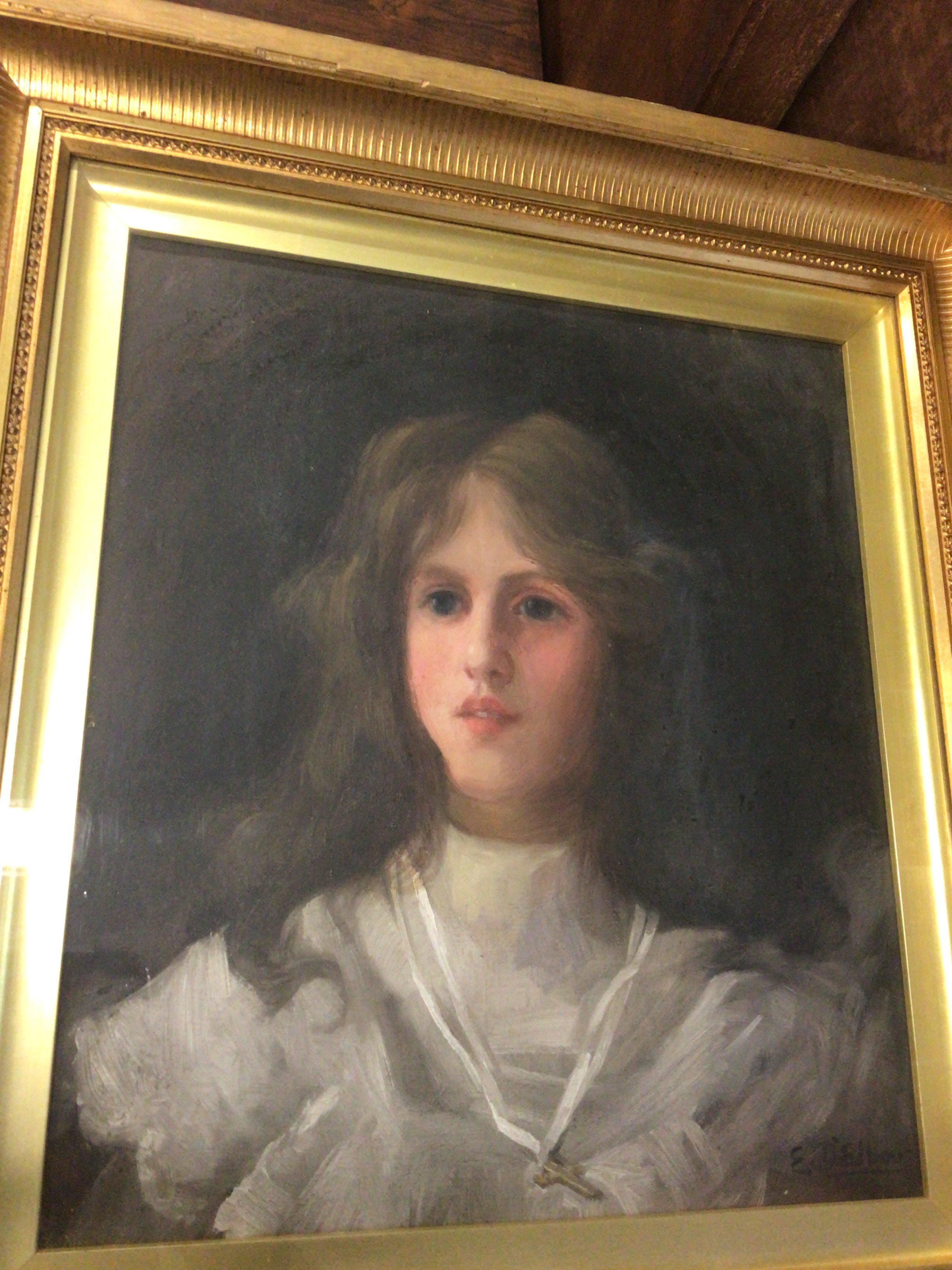 A gilt framed oil painting on canvas Portrait of a young Victorian girl signed E De Labourne. 66x58cm