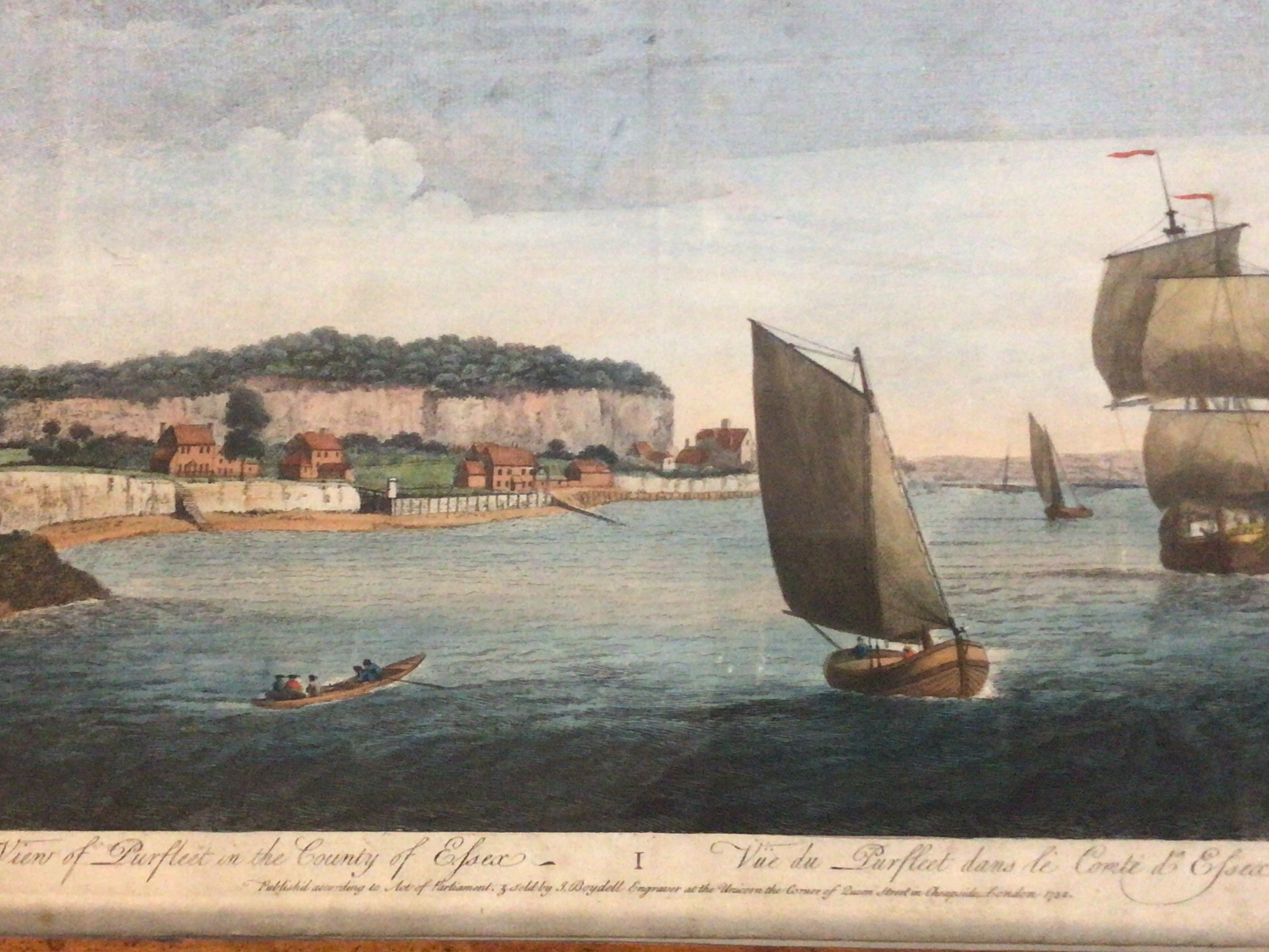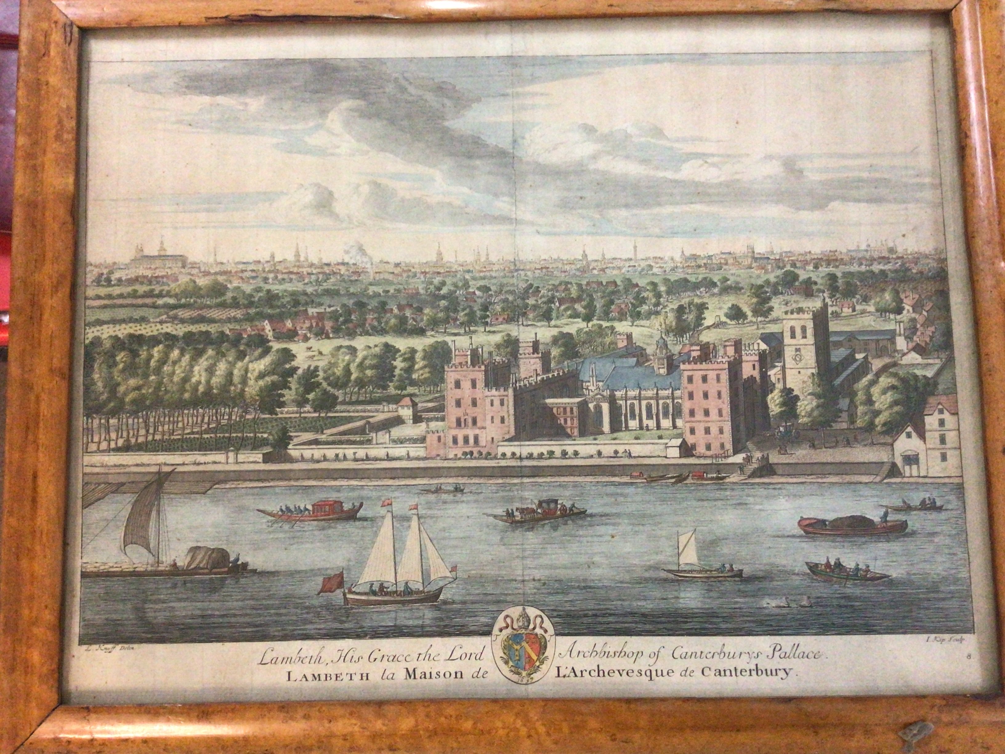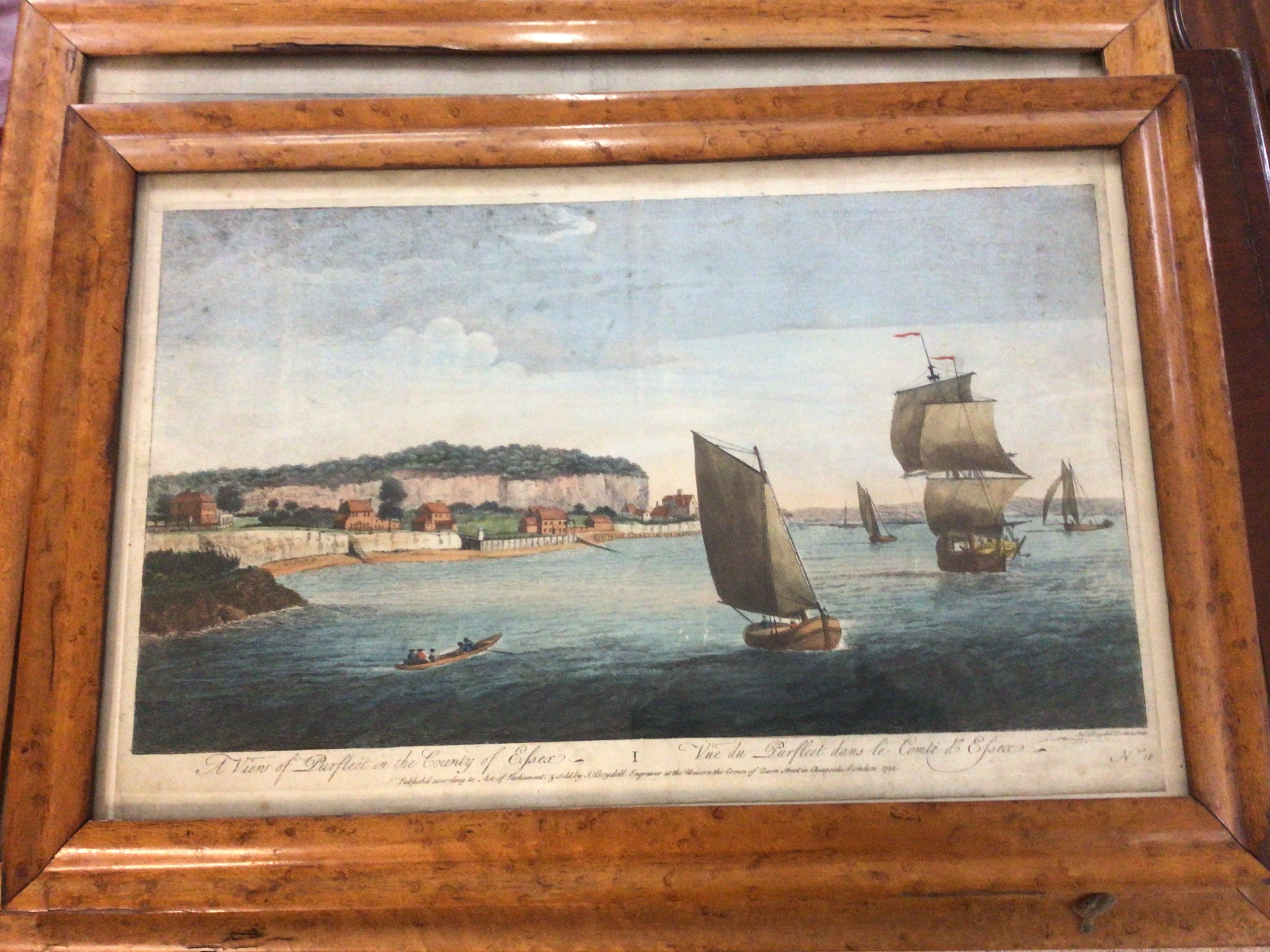 Two interesting 18th century maple framed coloured prints A view of the coat Perfleet Essex and the Mansion at Lambeth The Archbishop of Canterburys Palace.57x45cm and 50x35cm (2)