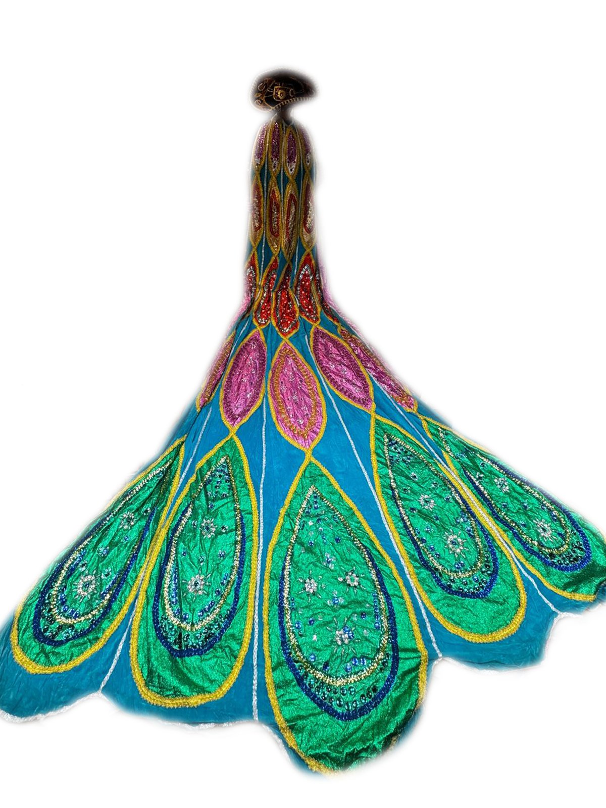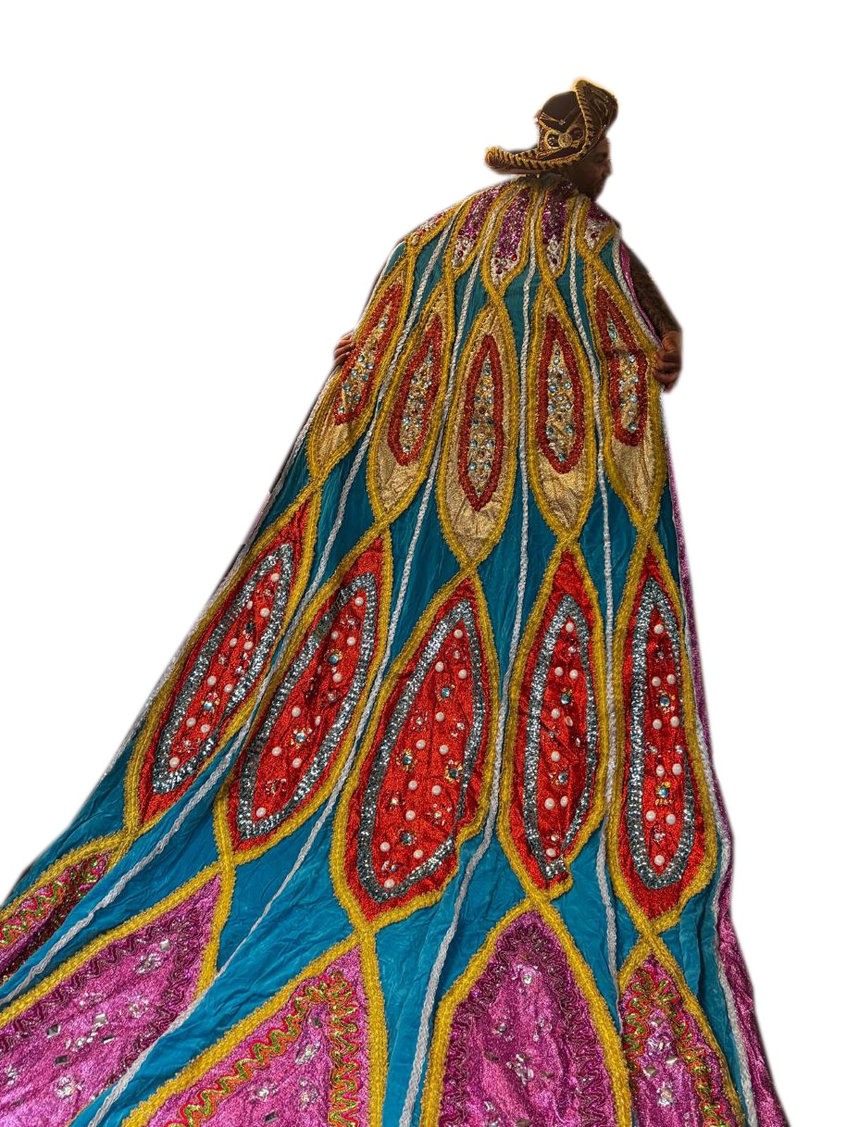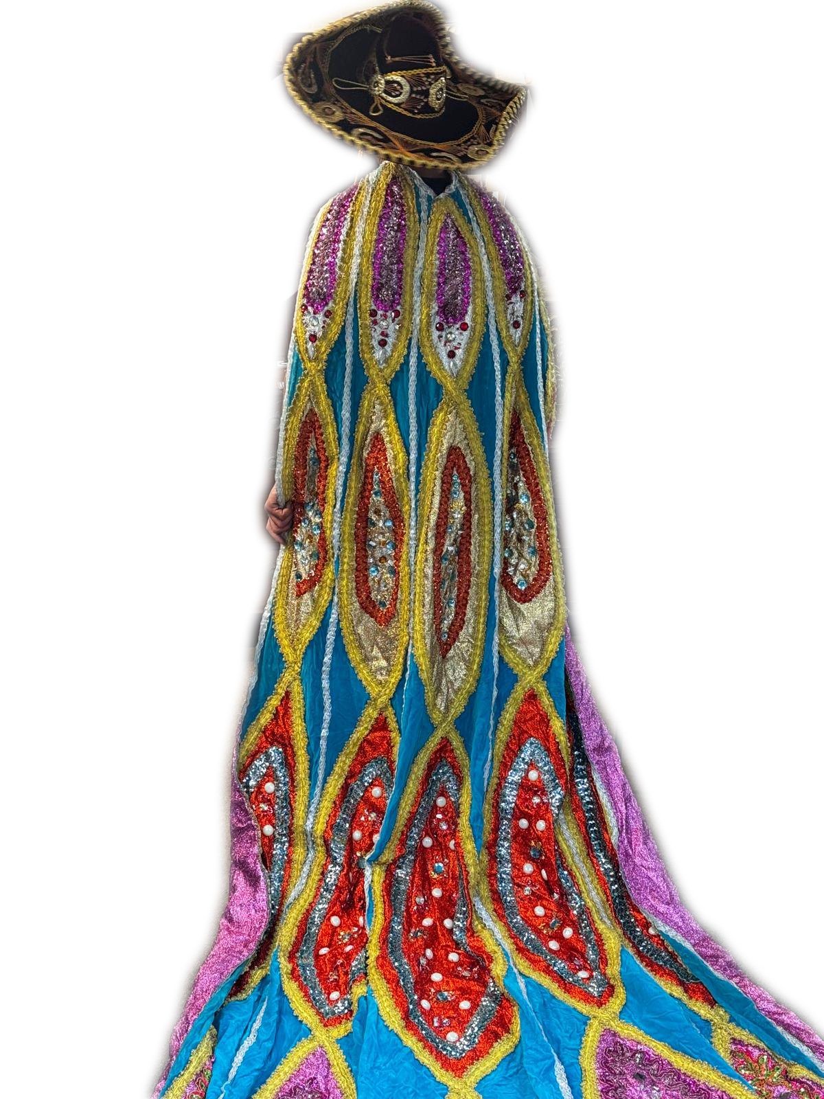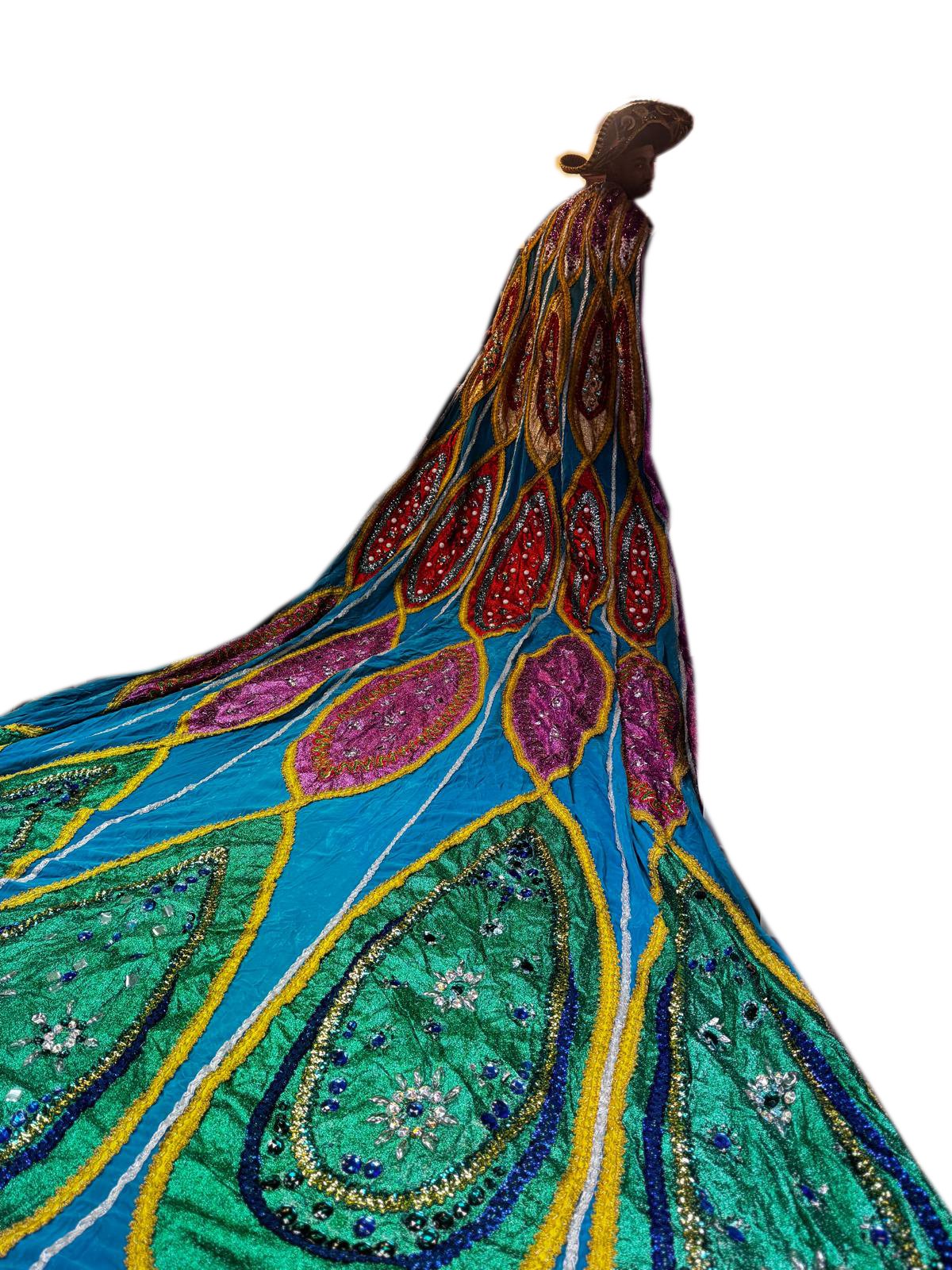 A large impressive hand made mermaid design cape from the estate of Danny La Rue together with an oversized burgundy and gold embroiderd sombrero. (D)