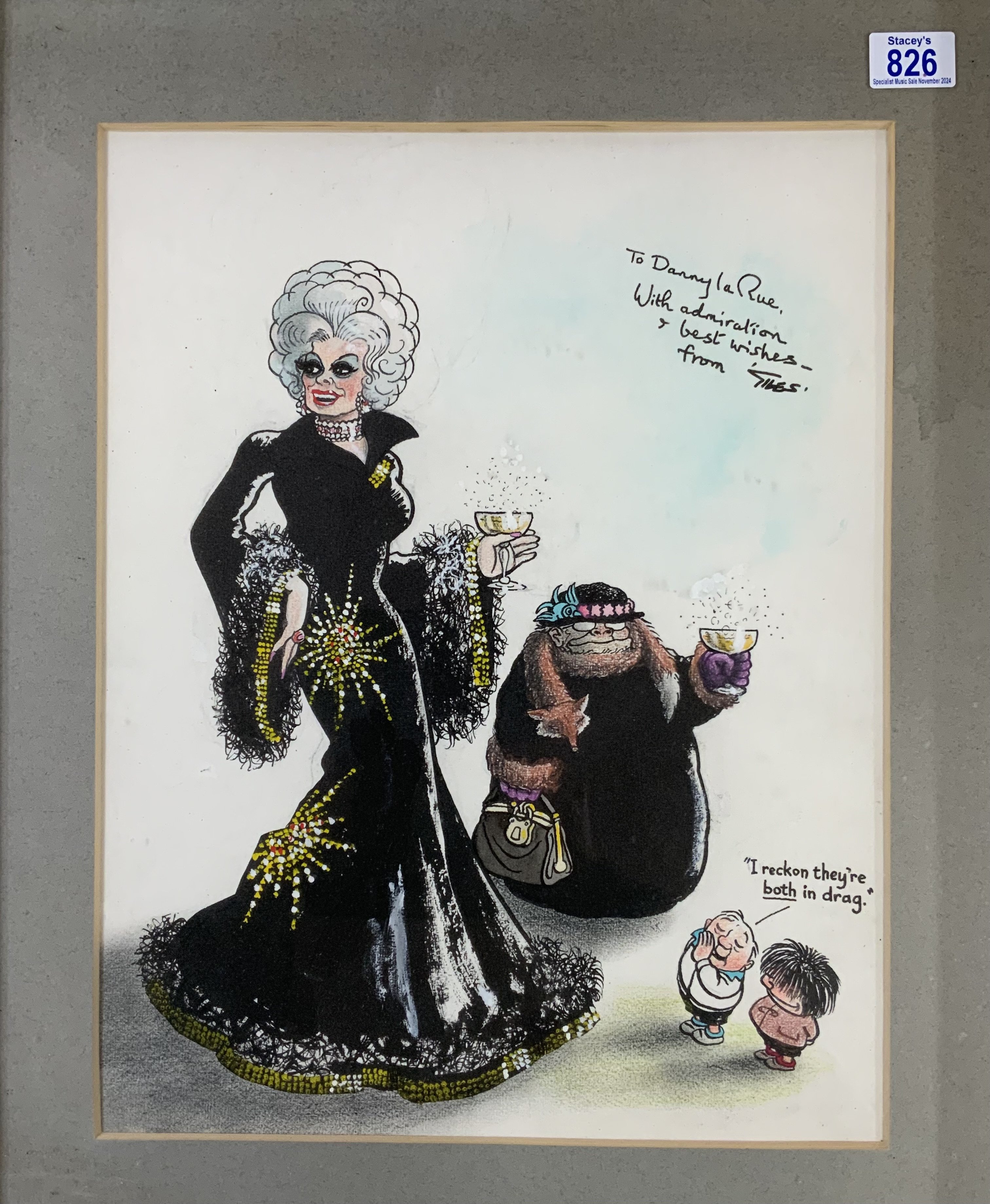 From the personal collection of Danny La Rue, a personalised ink and watercolour sketch by Giles 63.5cm x 52cm