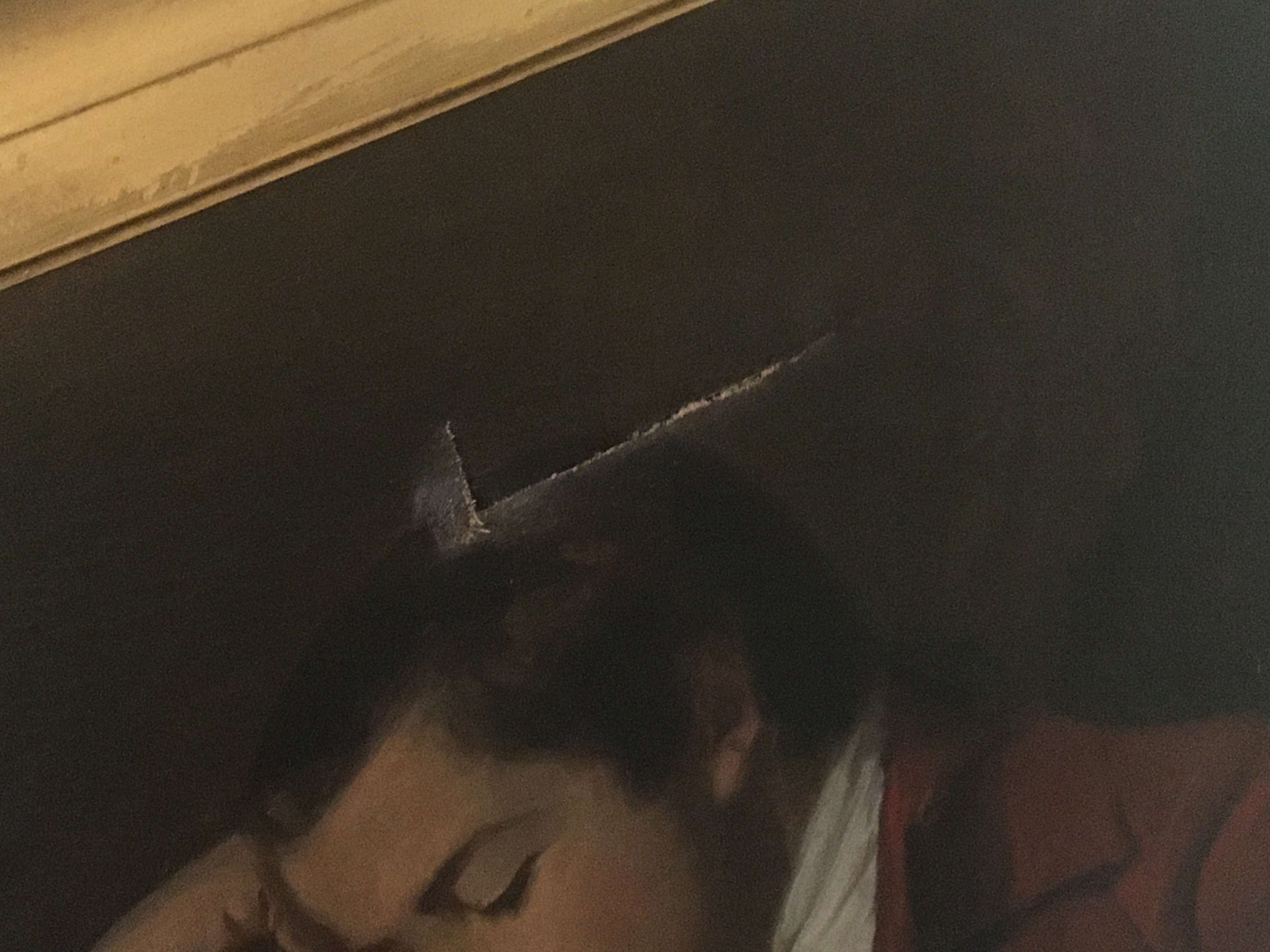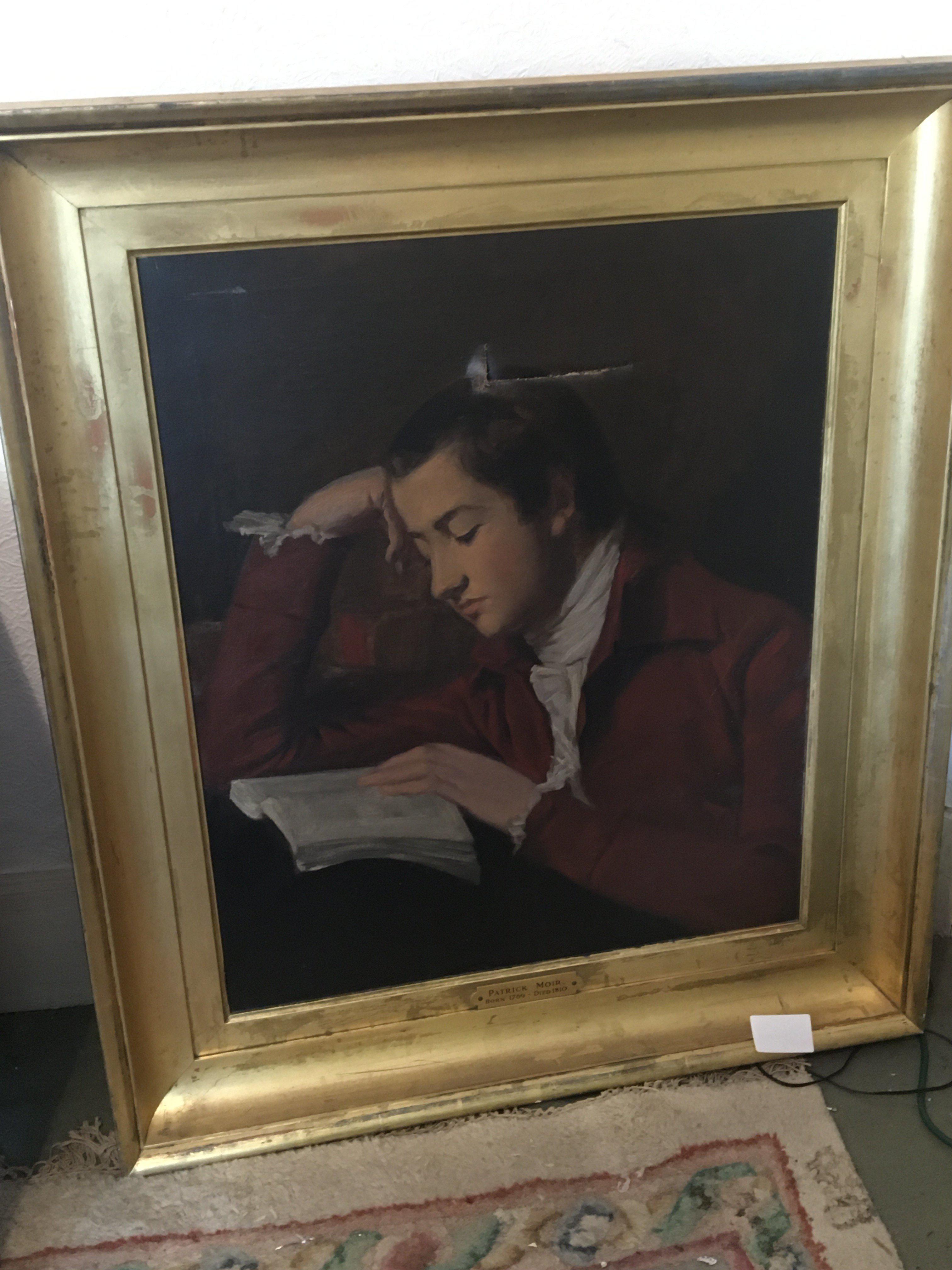 A 19th century oil painting portrait of a gentleman reading literature in a gilt frame. Canvas damaged. Study of Patrick Moir born 1769 died 1810.unsigned. 98x83cm