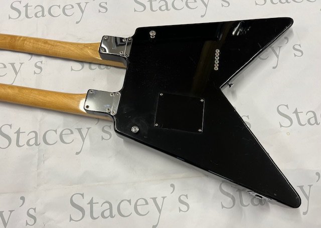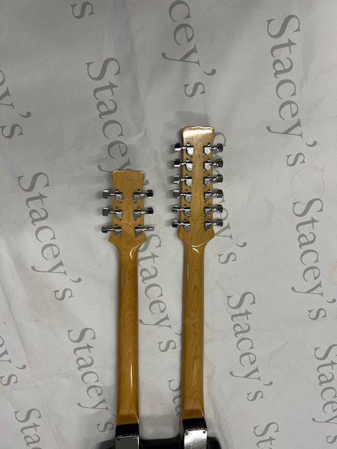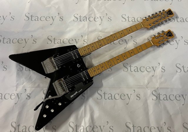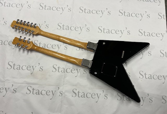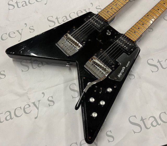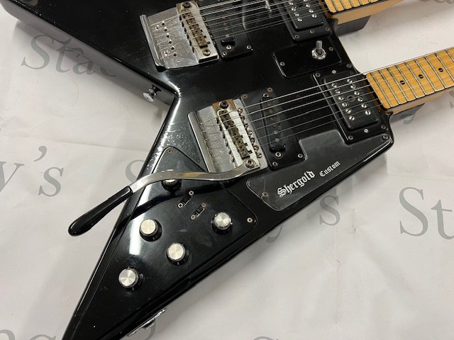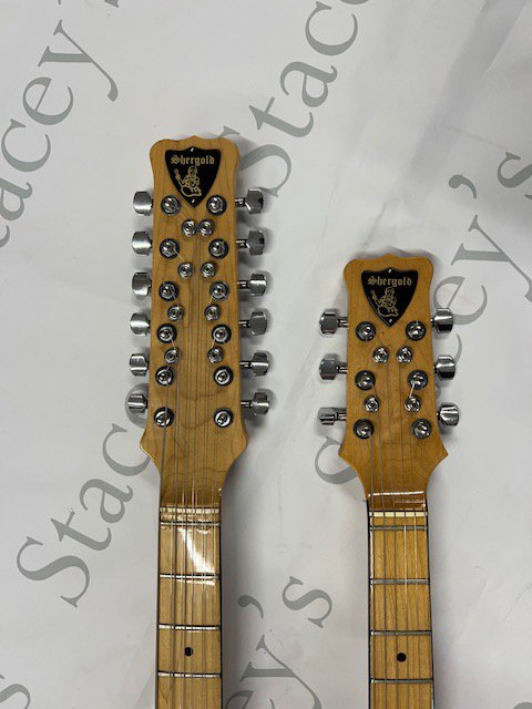 A mid 1970's Custom Built 1/1 Shergold Double Neck Electric Guitar. 12 string over 6 string with the custom V shape body requested by a customer. Maple neck and fingerboard. All original custom made Shergold parts including custom made fulcrum made vibrate on the 6 string side, custom wound Shergold pickups and Schiller tuners. In good overall condition consistent with age and use and these having been part of the guitar collection of a touring musician. Comes with Custom made plywood case apparently constructed by Shergold to house the guitar. Case is in fair condition with wear to the outer.
