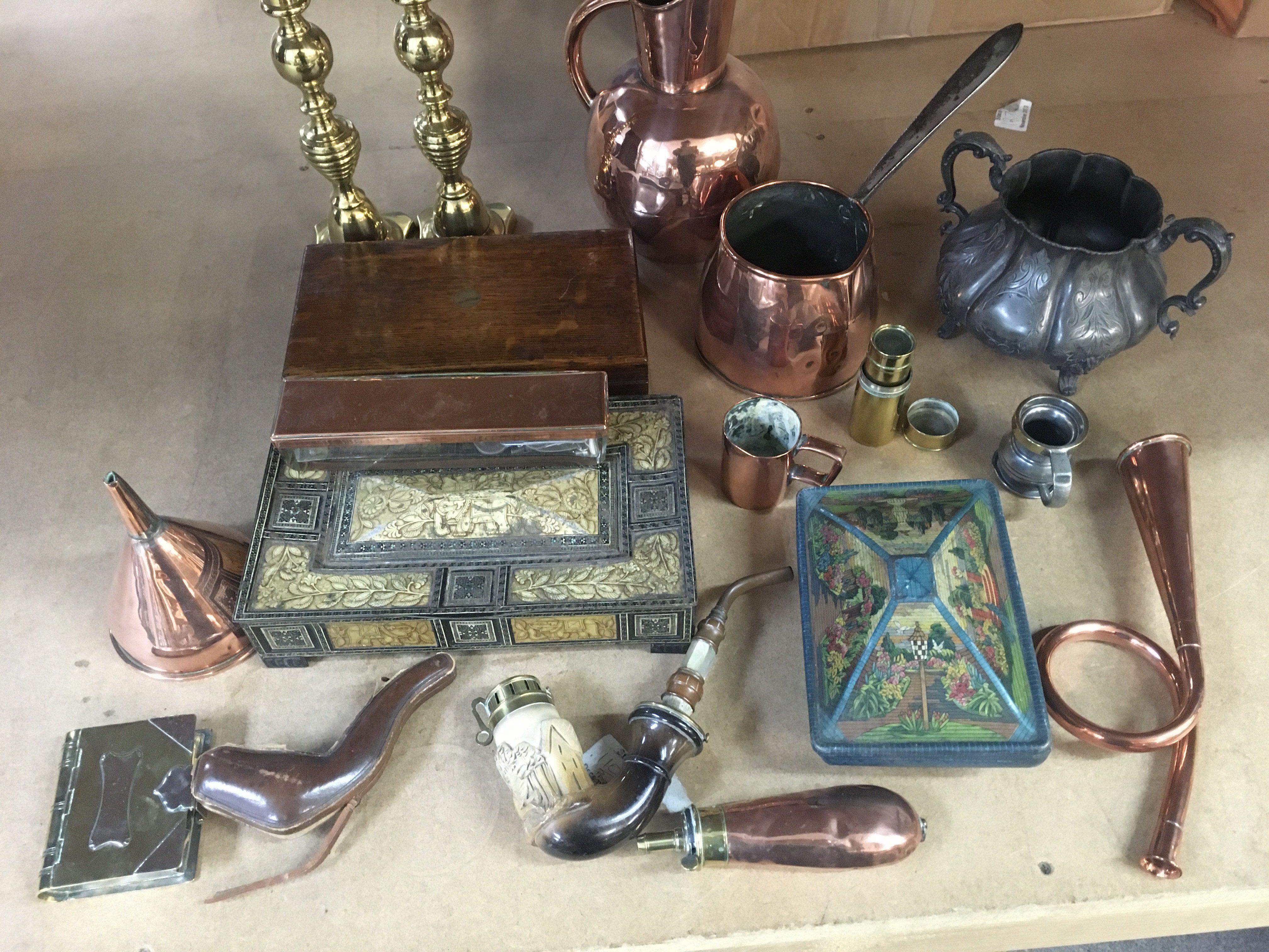 A Collection of copper tin boxes and pipes together with powder flask and brass snuff box .