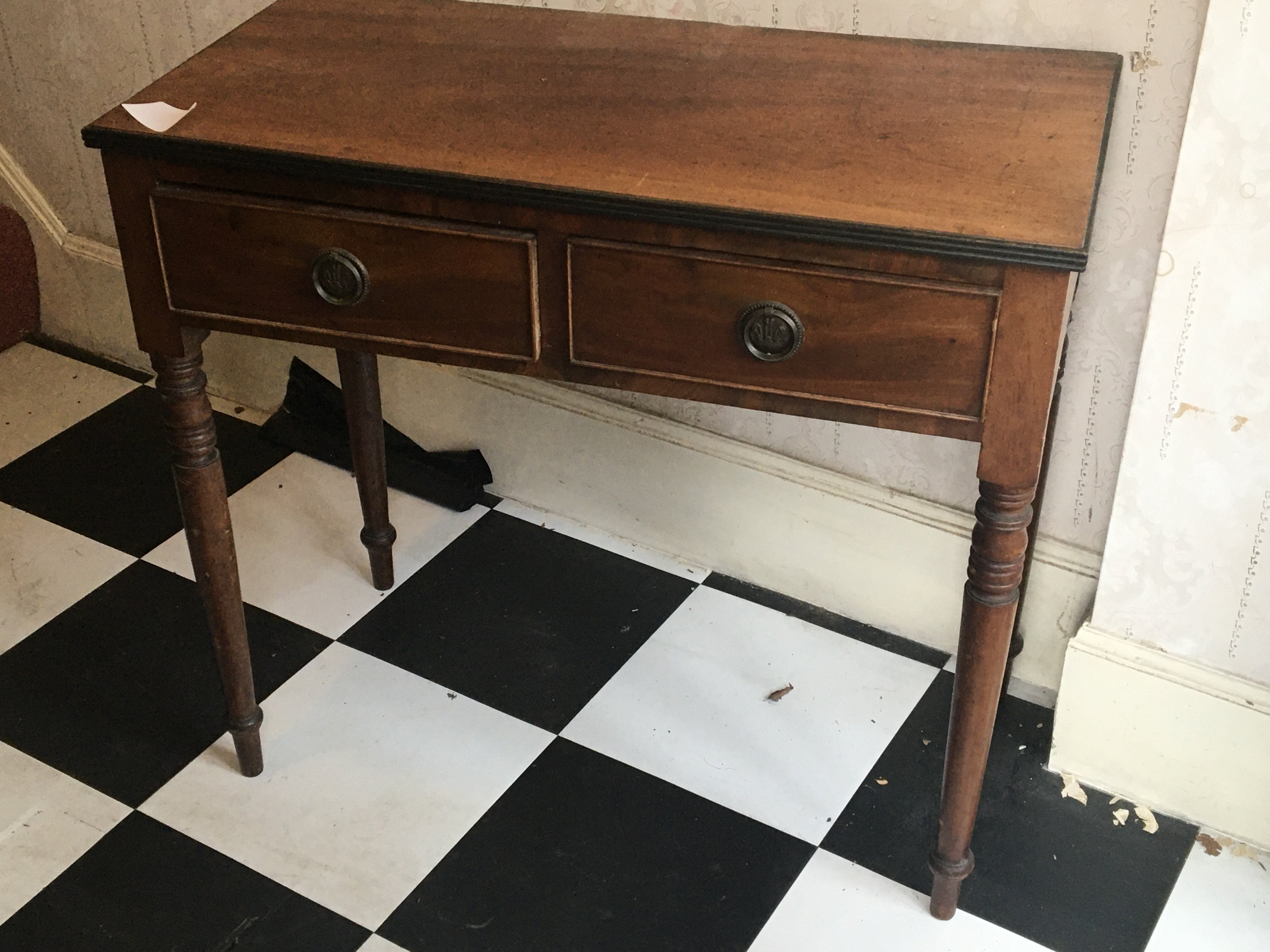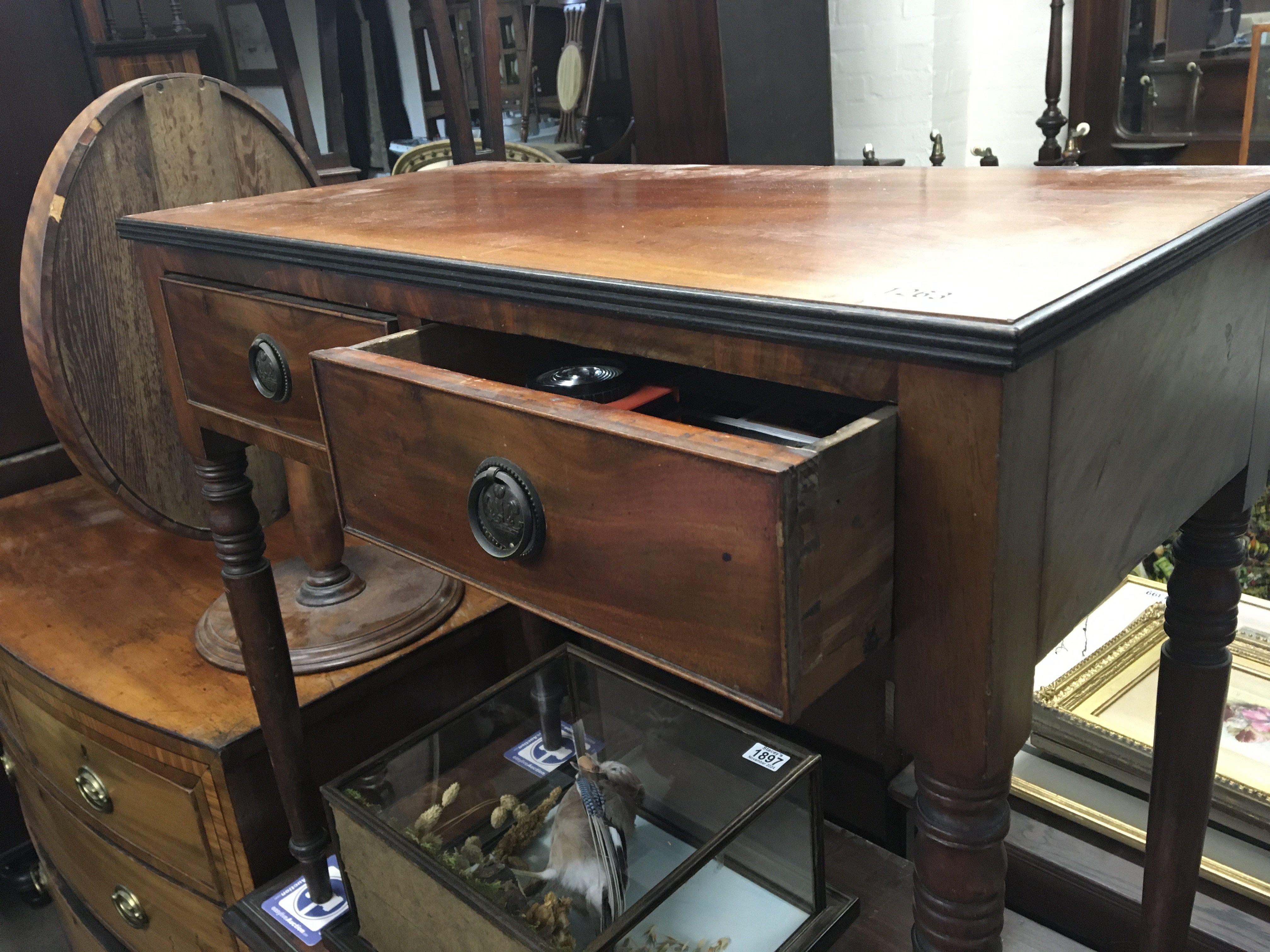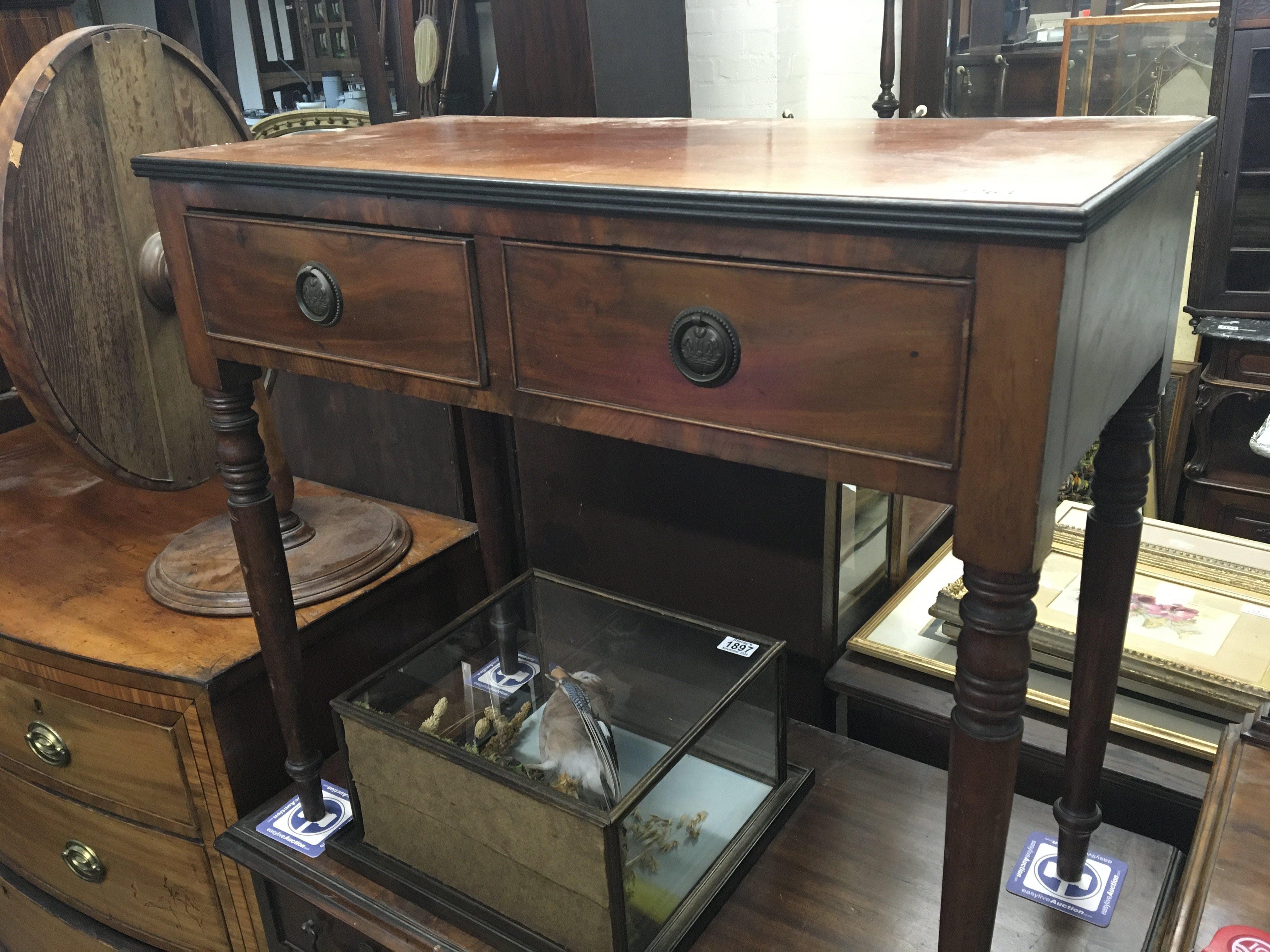 An Early Victorian mahogany side table with two drawers on ring turned legs. 77cm wide 39cm deep.