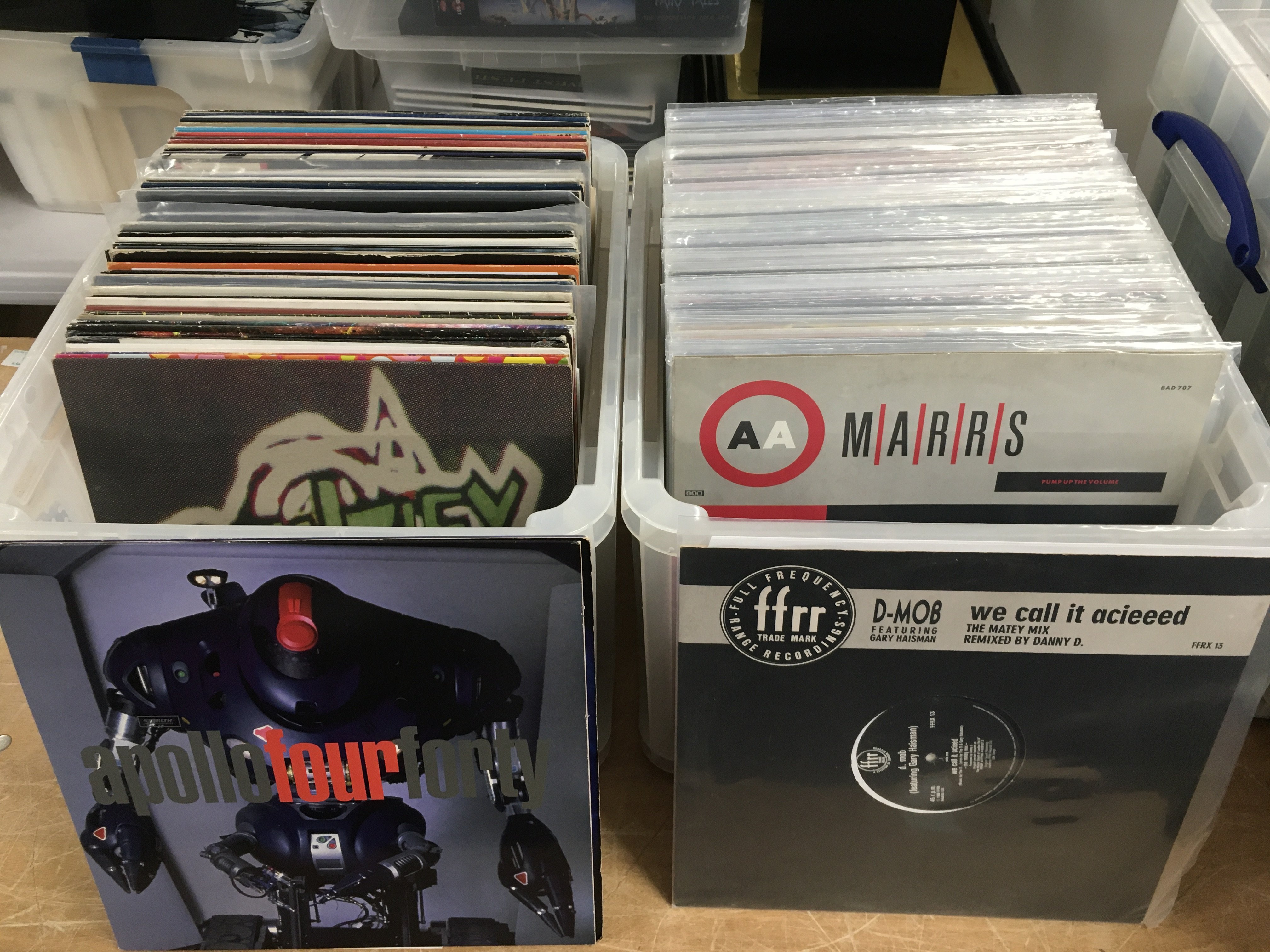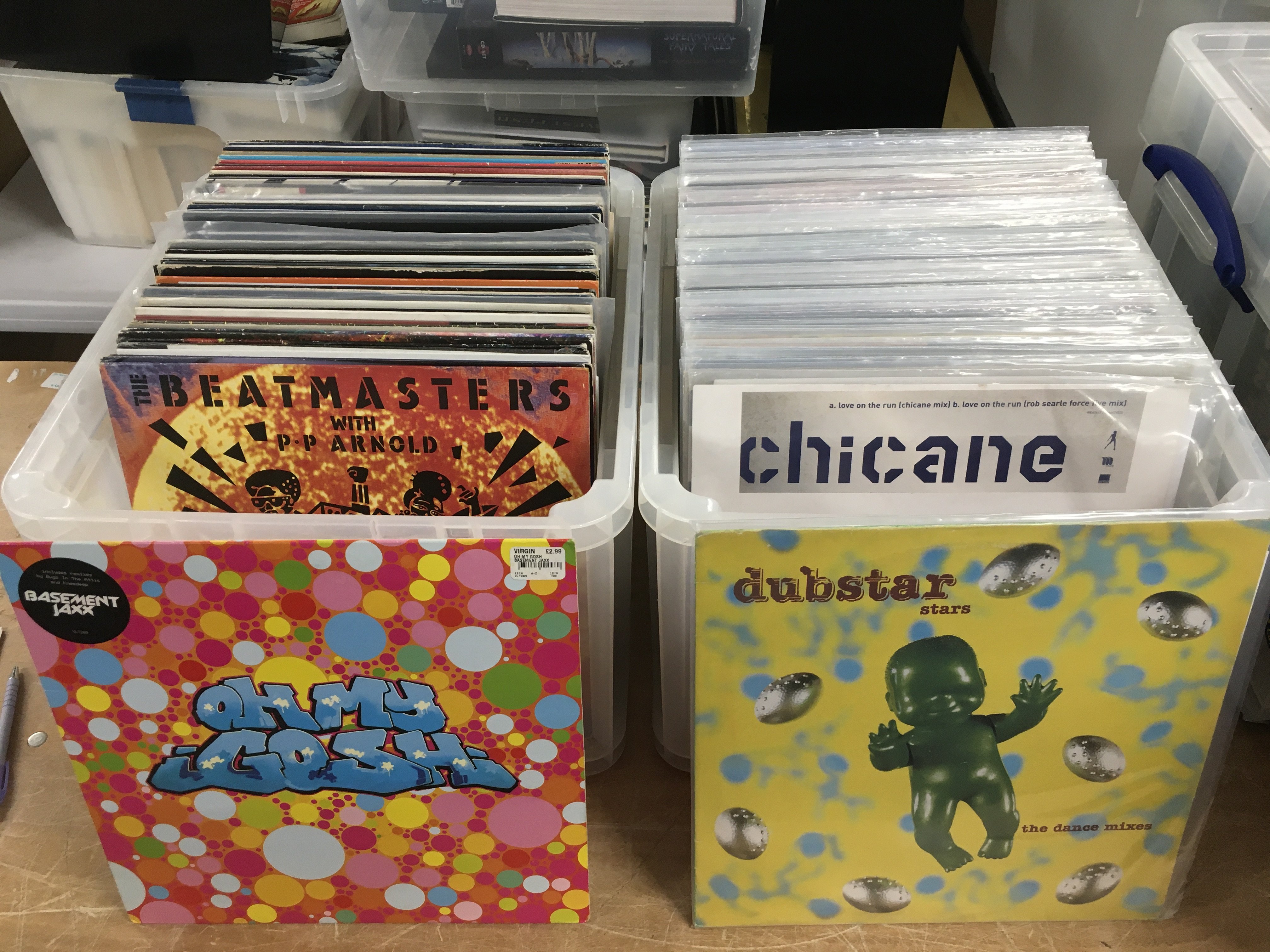 Two boxes of house and big beat 12" singles by various artists including Basement Jaxx, Apollo 440, Bentley Rhythm Ace and many more.