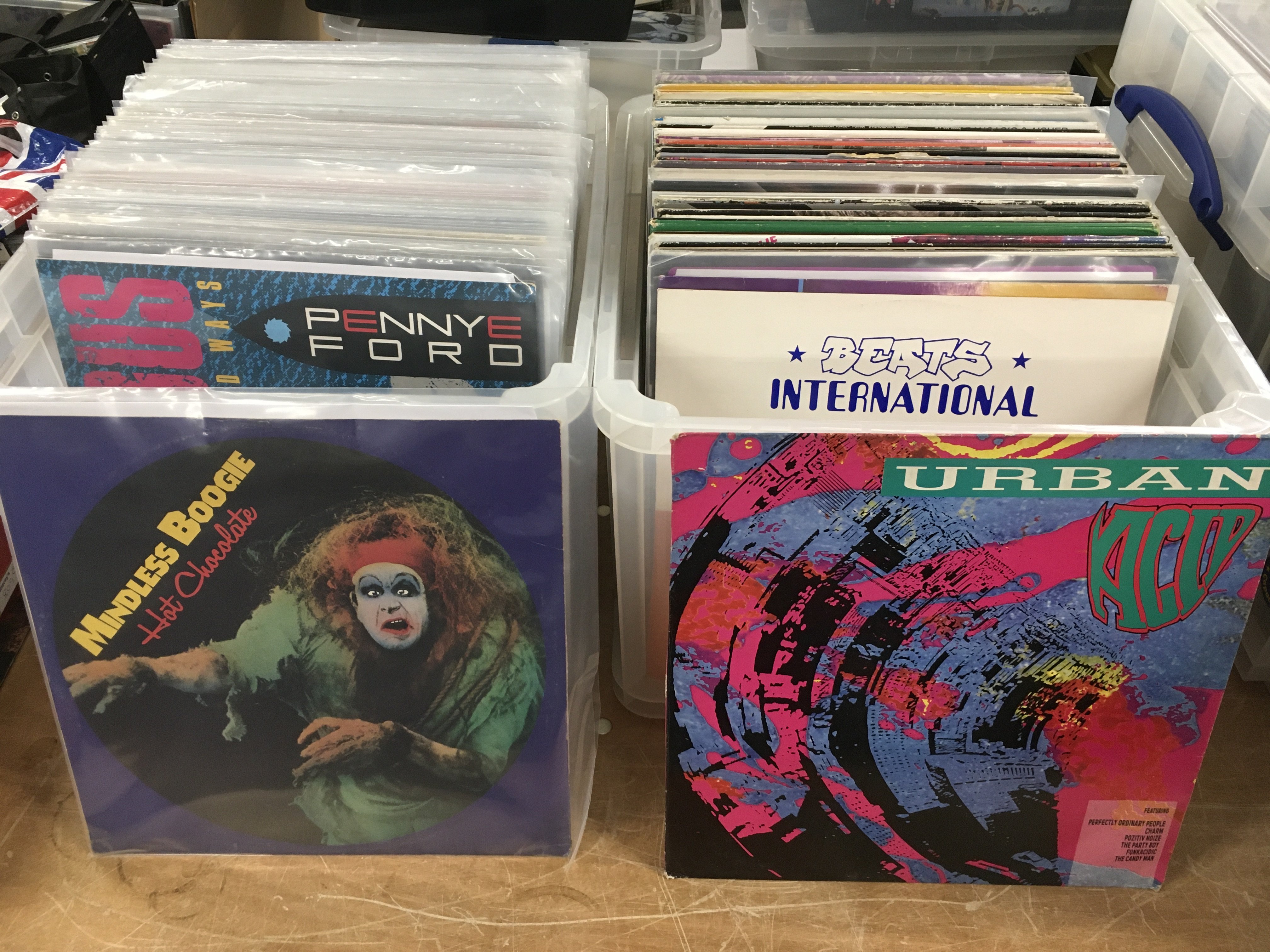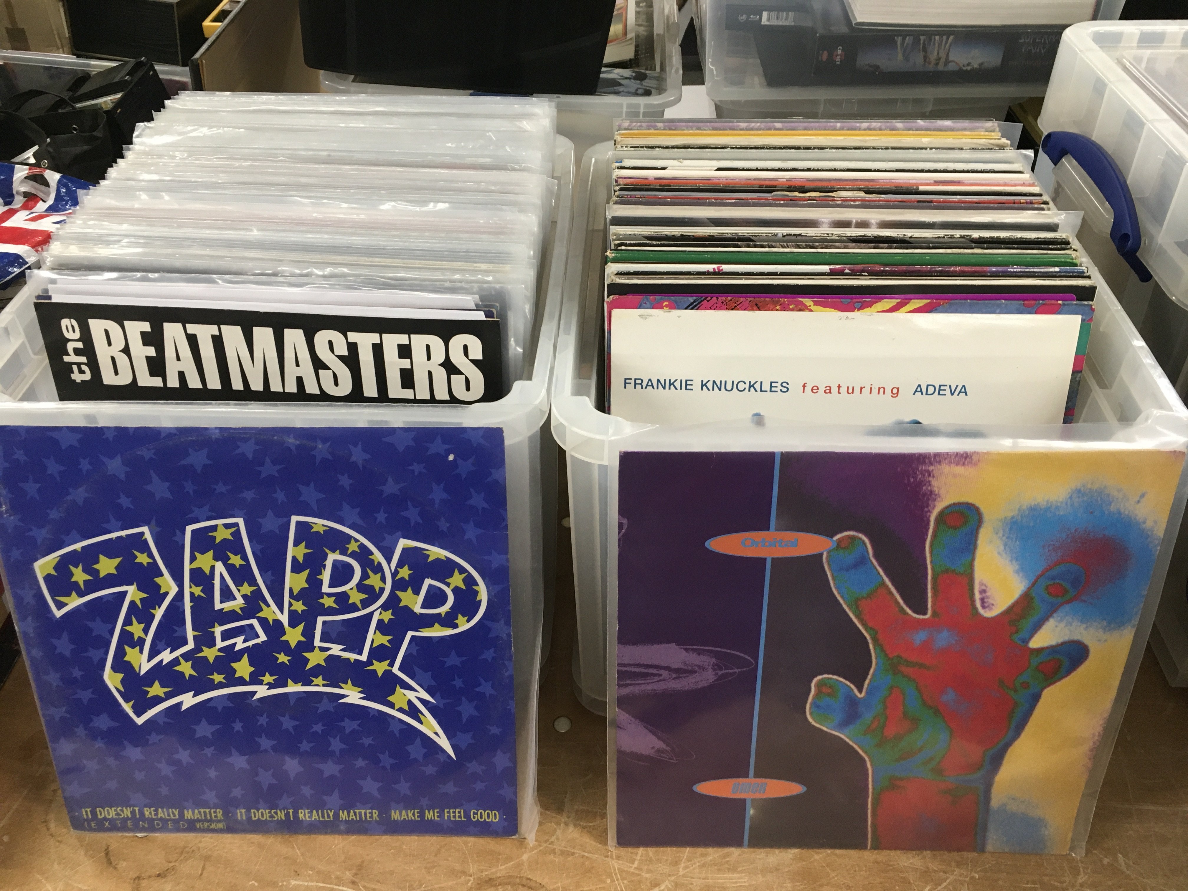 Two boxes of house, soul, funk and disco 12" singles by various artists including Beats International, Orbital, Chic and many more.