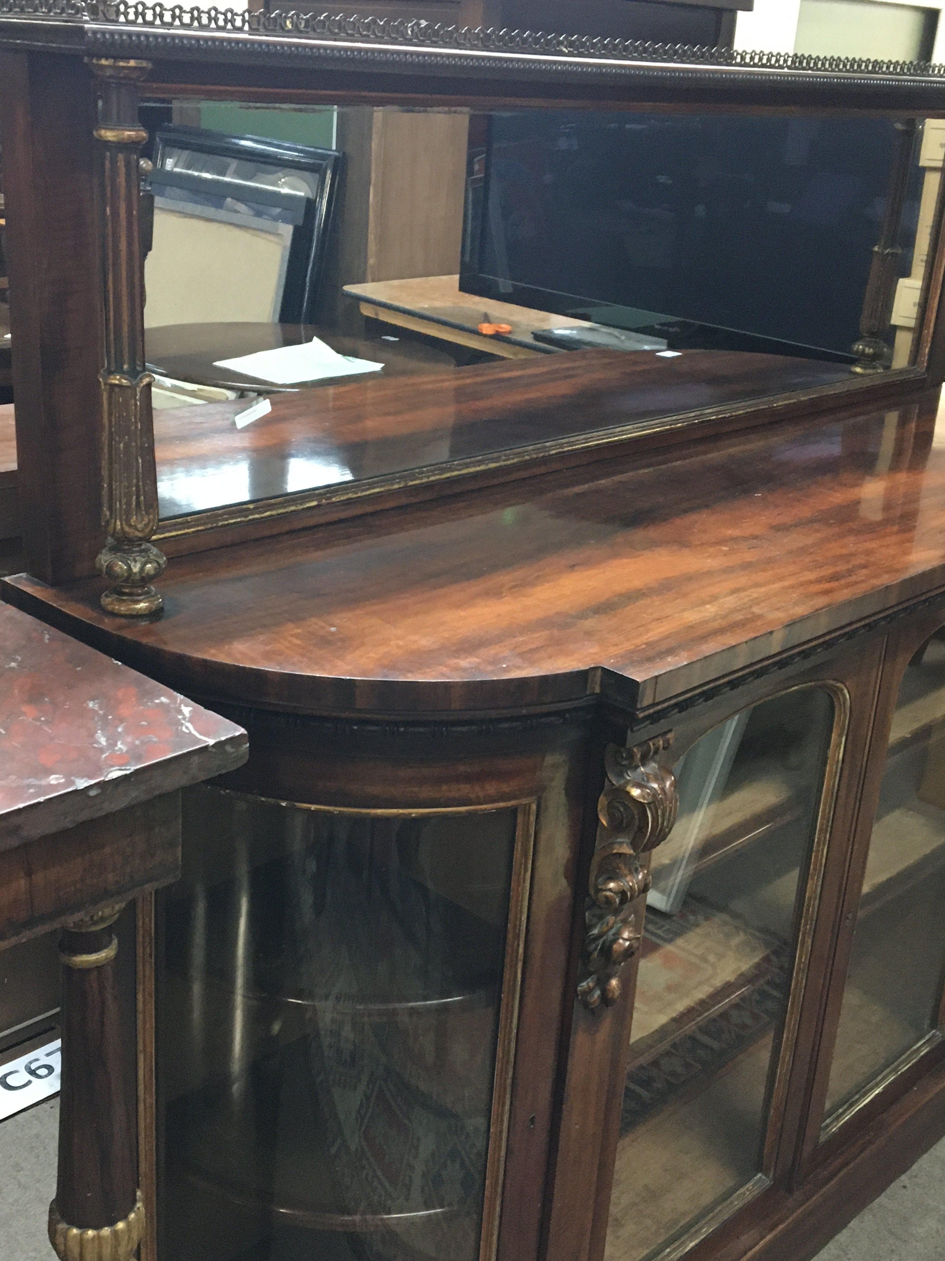 A Quality Early Victorian Walnut credenza with a raised mirrored back with gilded pillar supports above glazed doors with glazed bowed glass ends in very good original condition.158cm long height 135cm 48cm deep.