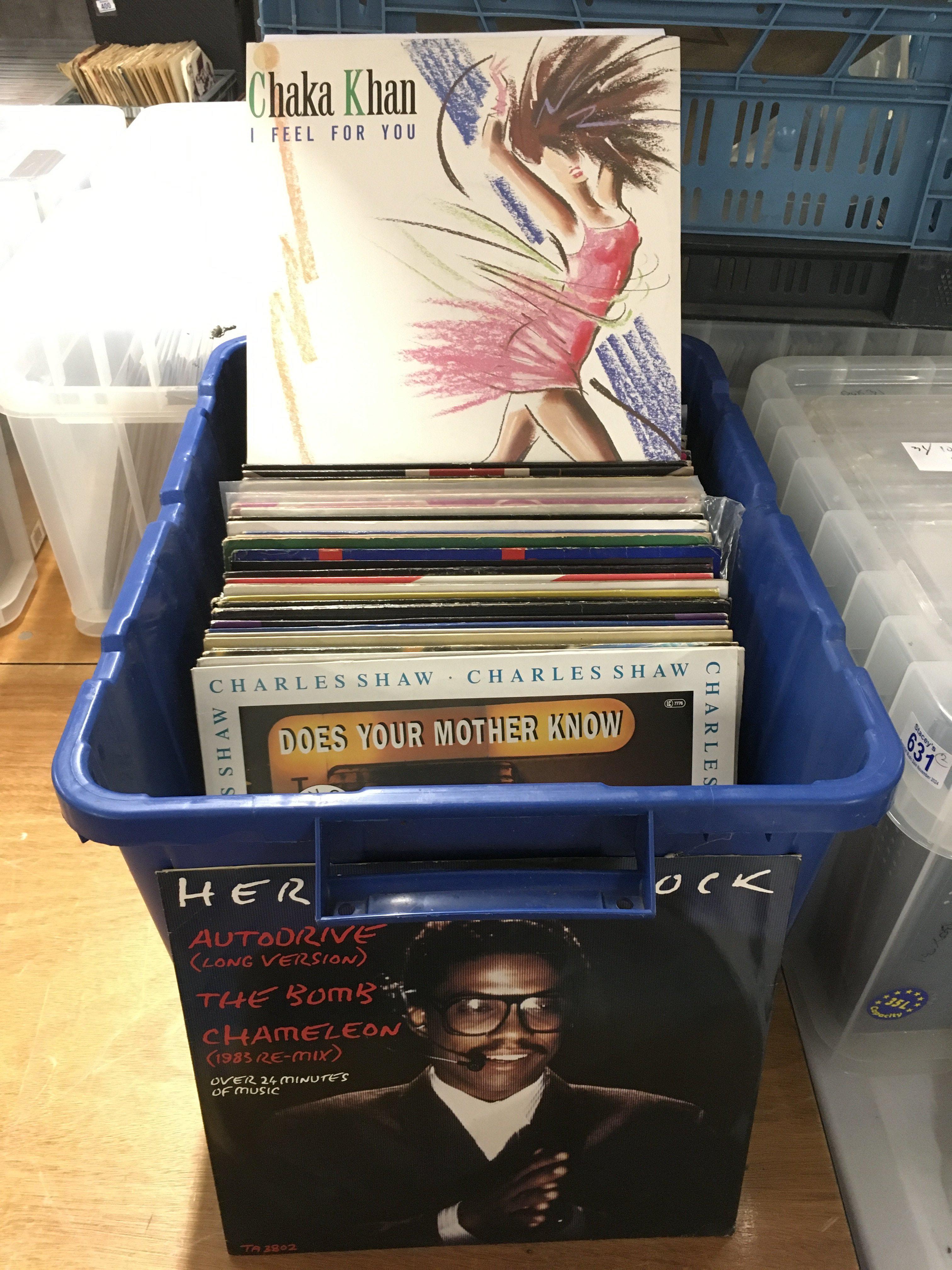 A box of soul, funk and disco 12" singles by various artists including Her ice Hancock, Chaka Khan, Bootsy Collins and many more.