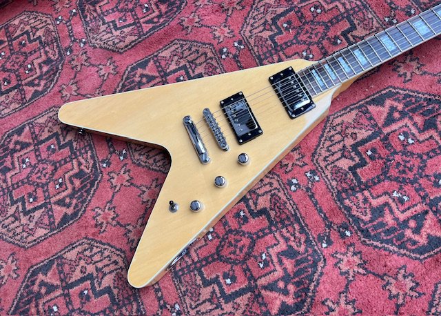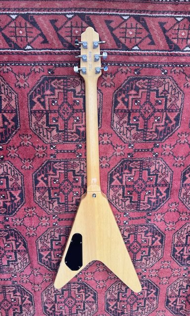 A 2018 Reverend Volcano V Guitar. Now Discontinued model. Blonde Finish. All original and unplayed condition with factory plastic still on control cavity cover. Comes with fitted V Shape Reverend Case.