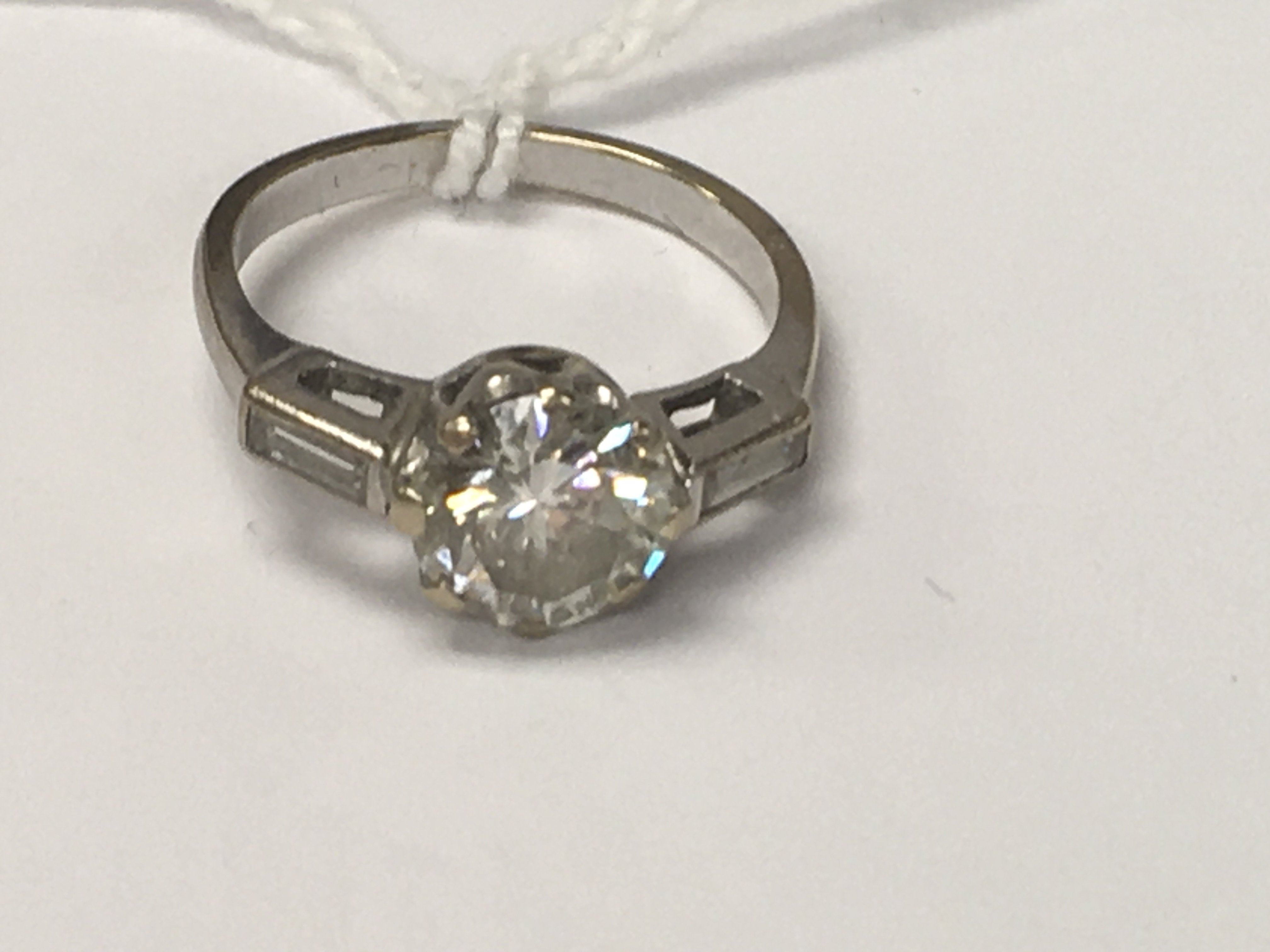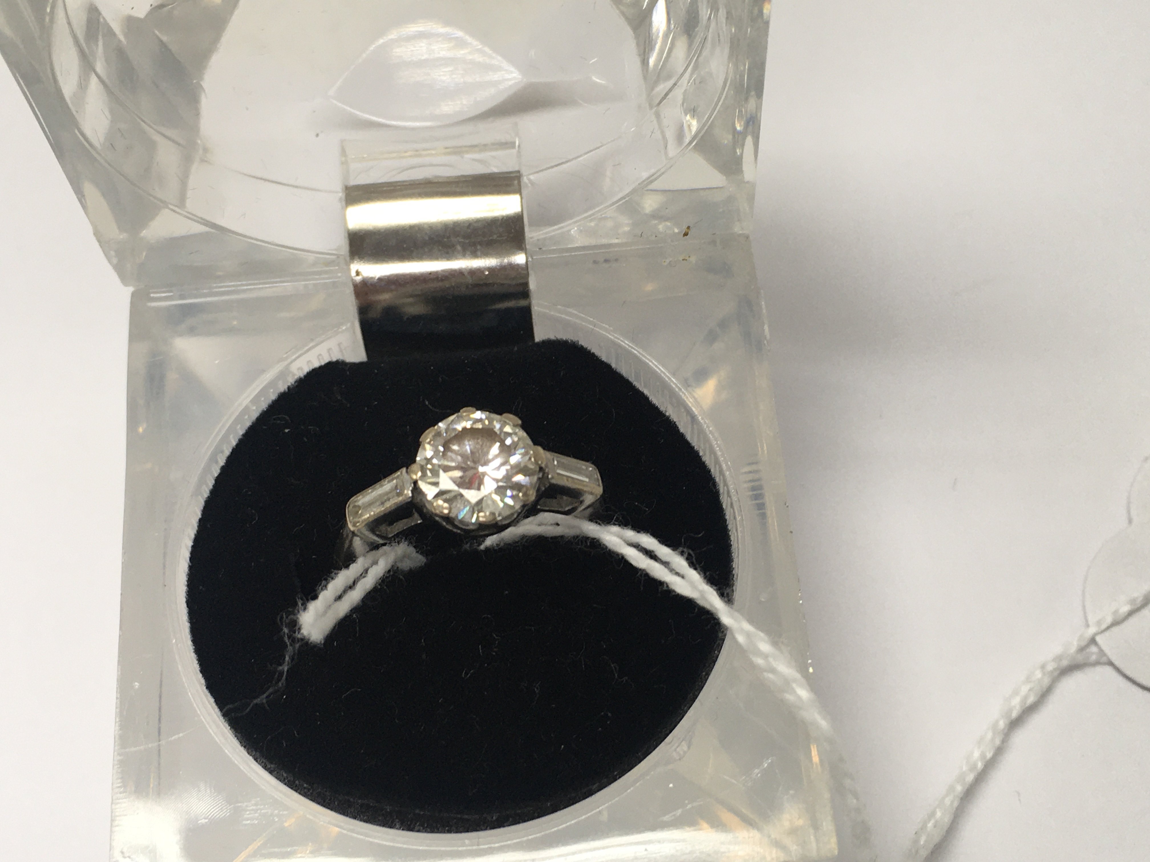 A white gold ring inset with a solitaire diamond 1ct aprox size K .