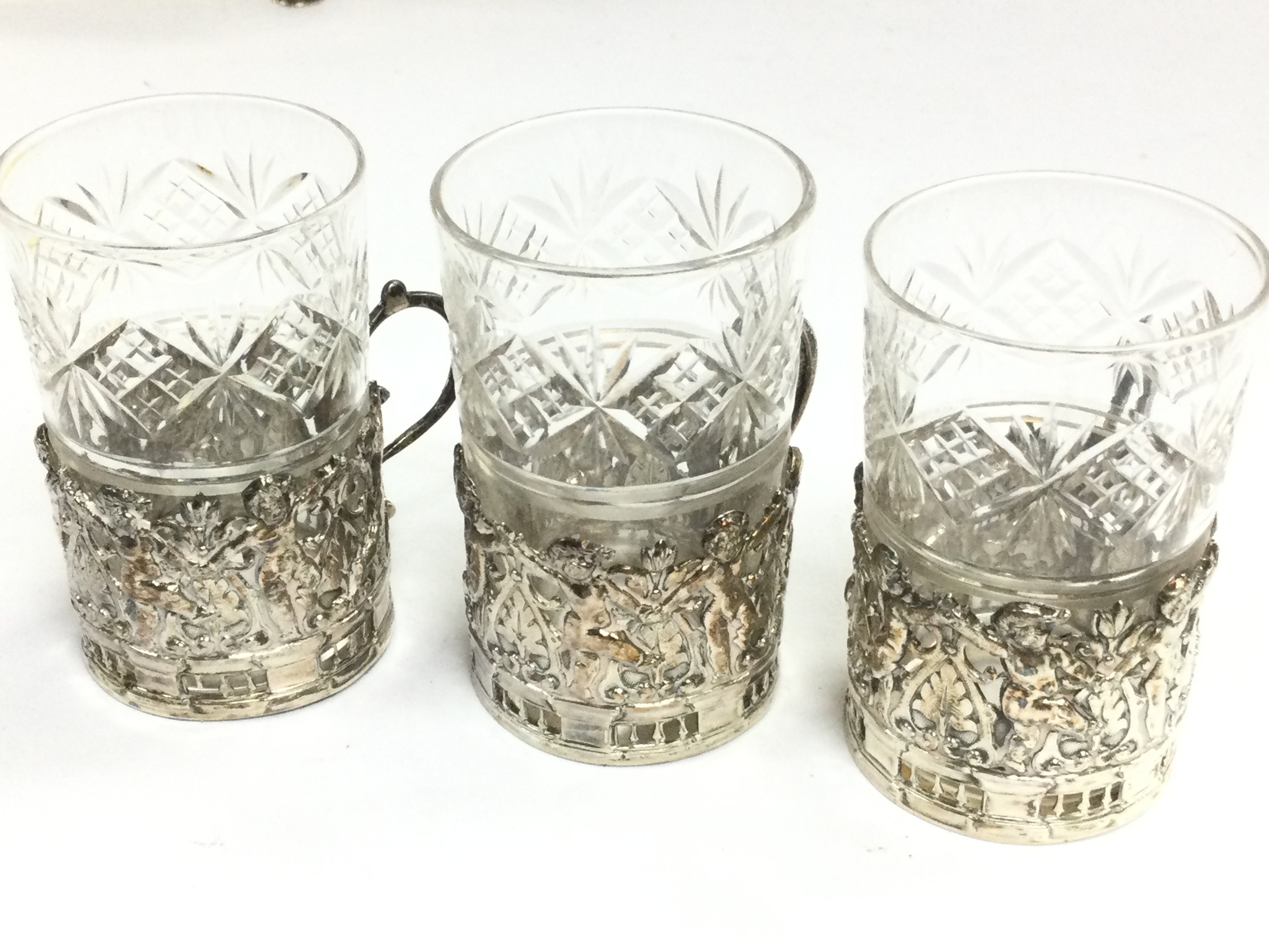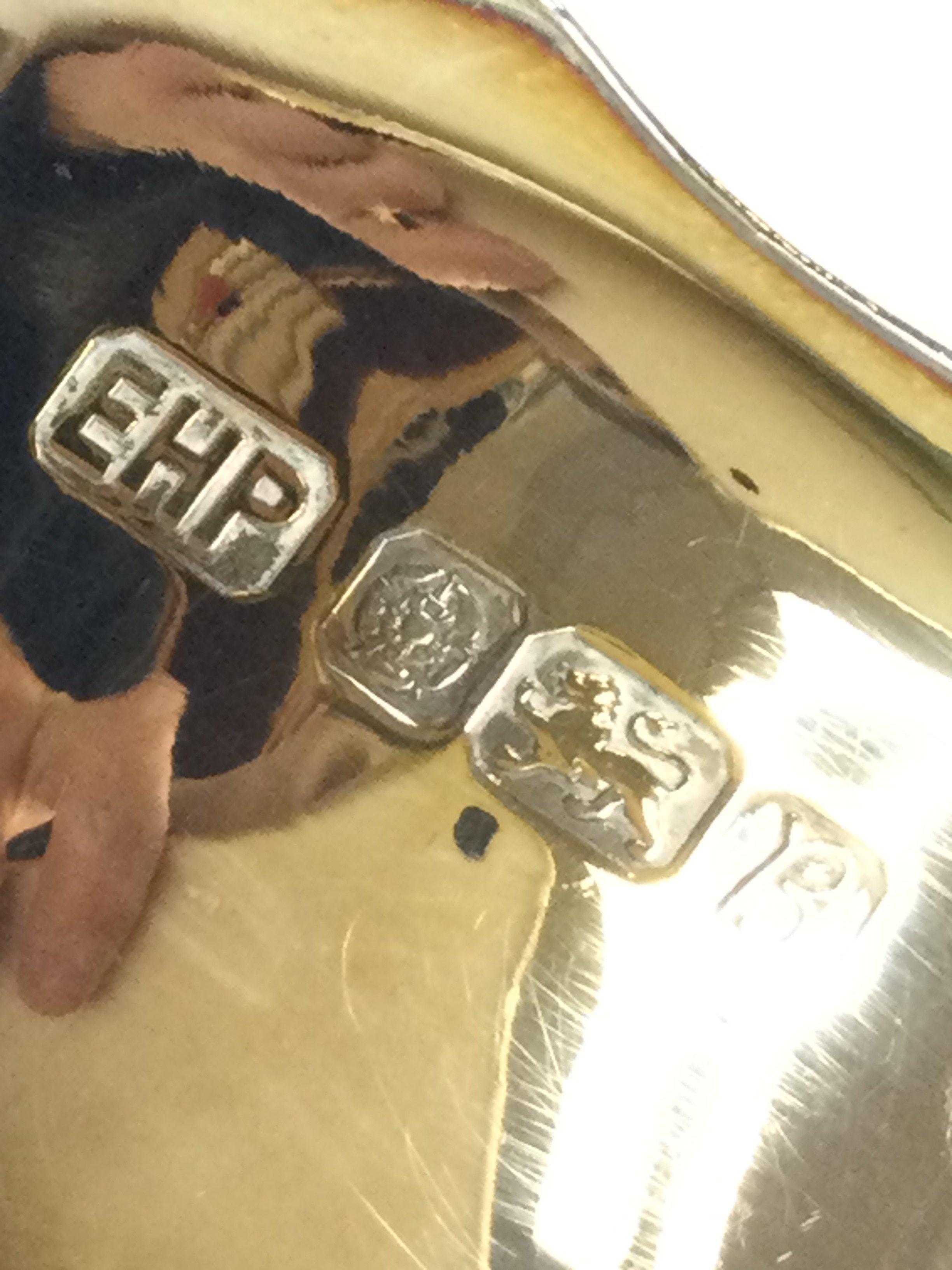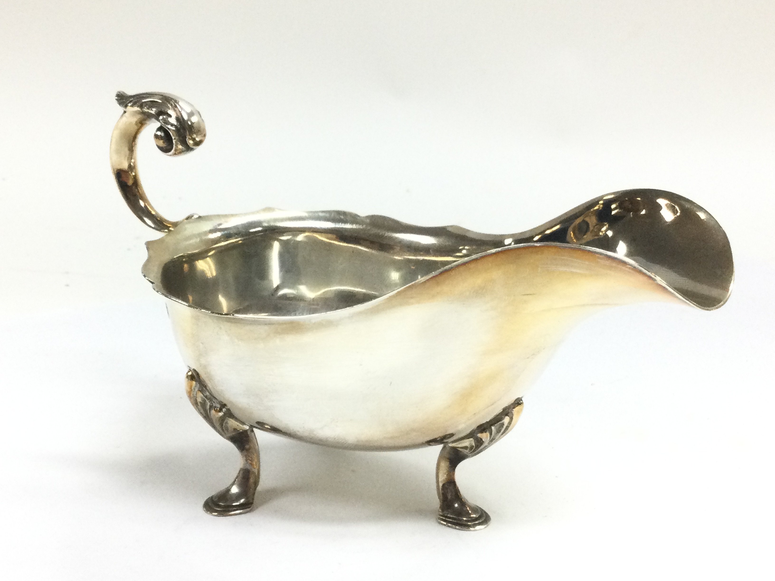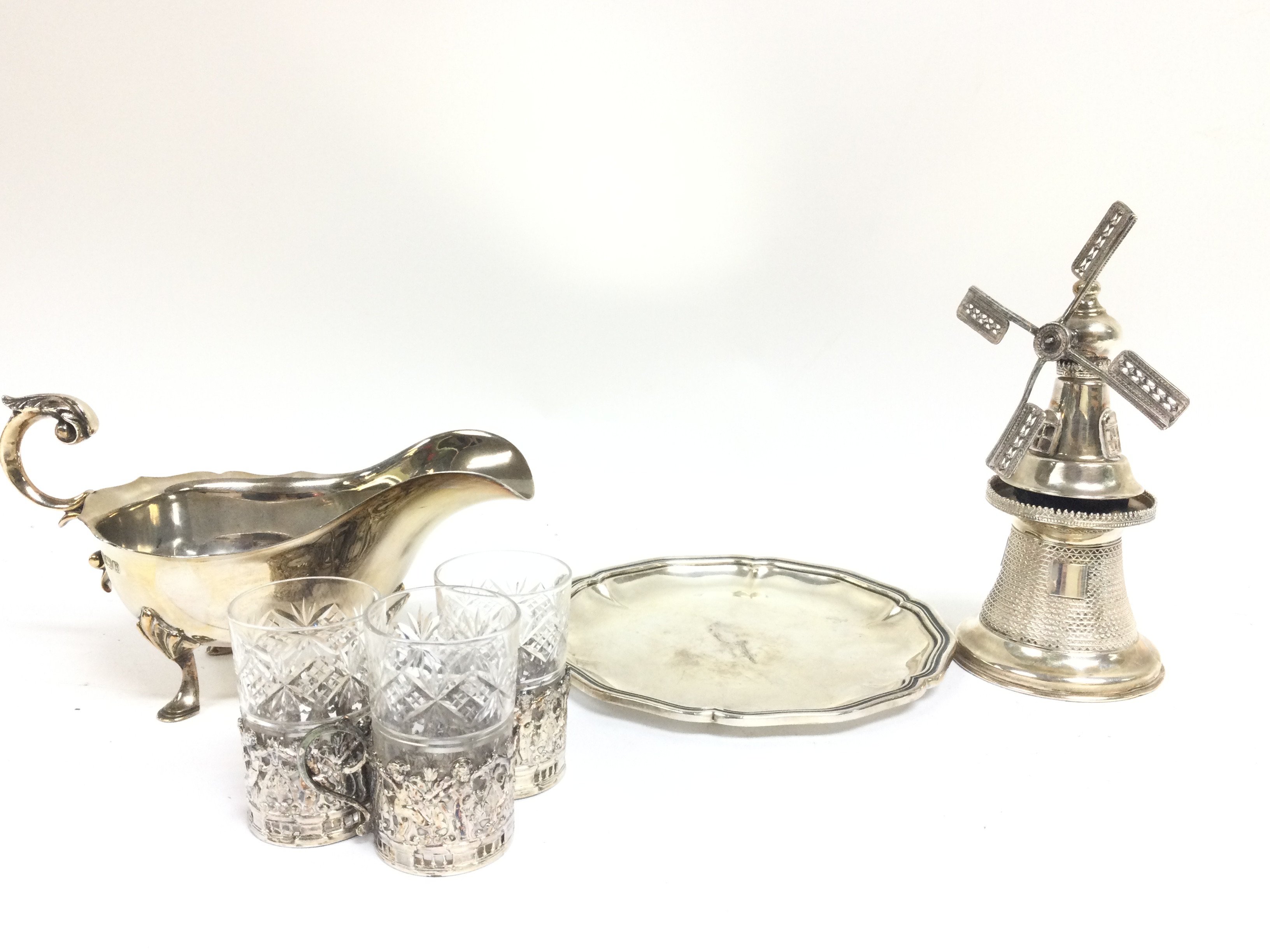 A collection of silver hallmarked items including a small dish, windmill ornament, sauce boat and silver glass cup holders. This lot cannot be posted